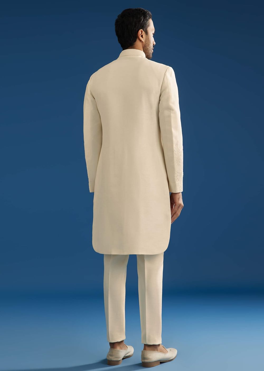 This groomsman sherwani in off white tussar crush tissue is embroidered with hand-done bead and katdana detailing. Minimal yet majestic. Awarded as the Most Trusted Brand, we're delivering styles you love, just as promised.