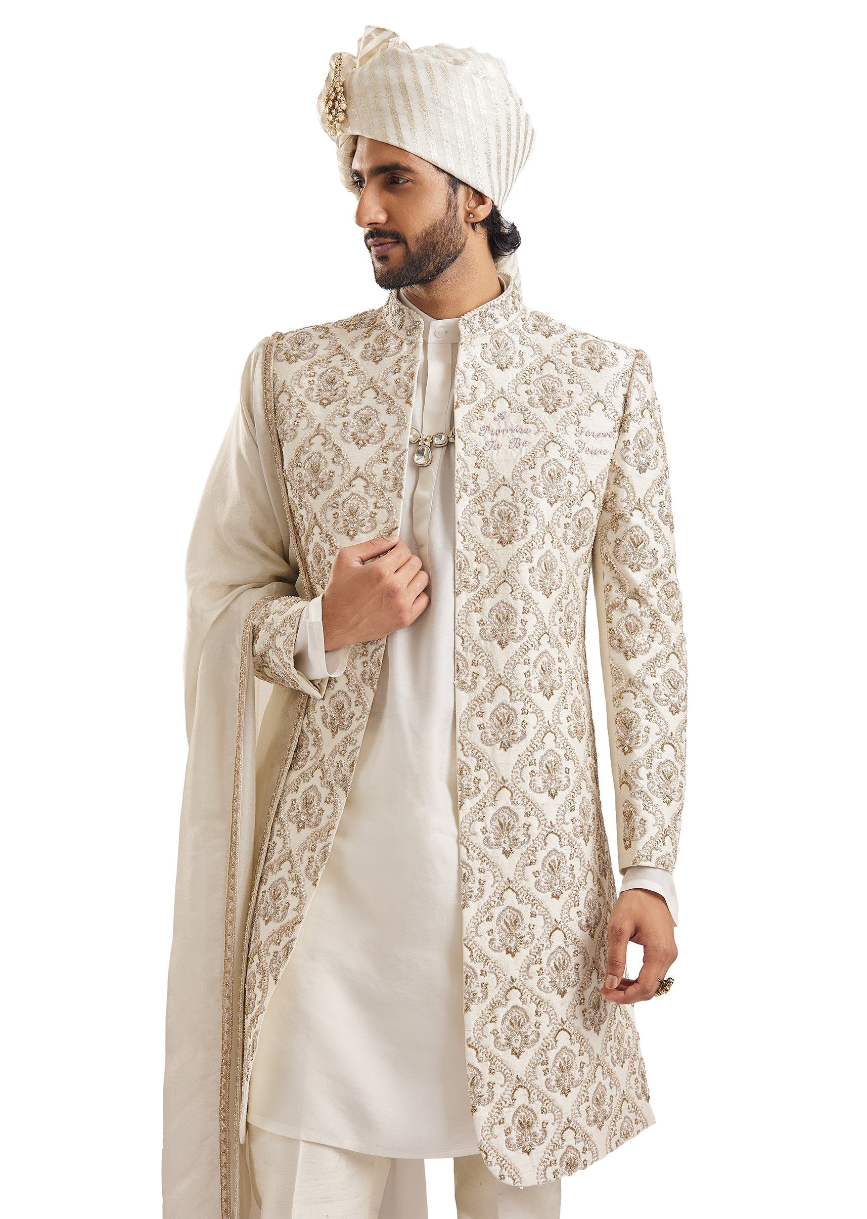 Accessorise with antique gold jewellery — a simple sarpech or a safa in ivory with gold detailing completes the traditional groom's look beautifully.