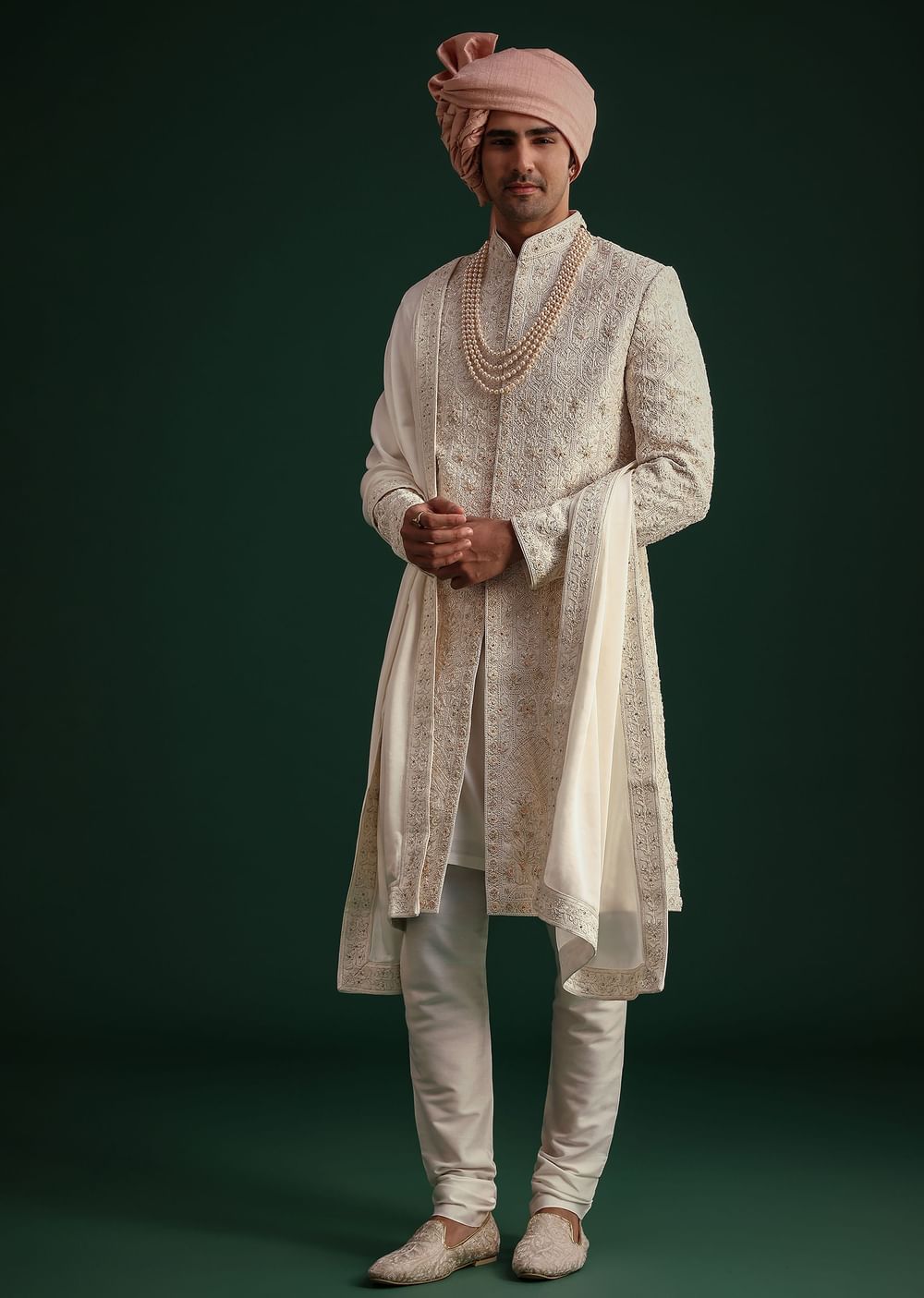 Off White Zari Embroidered Sherwani Set With Mala And Dupatta