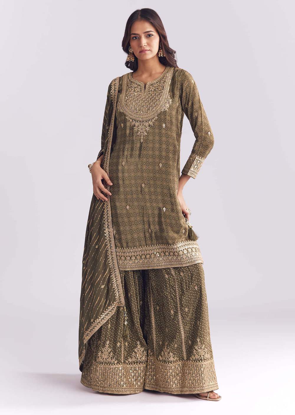 Olive Crepe Bandhani Palazzo Suit With Zari And Sequins Work