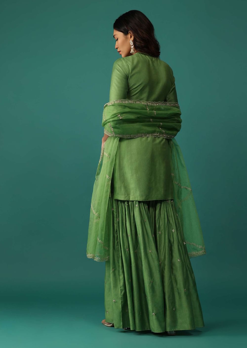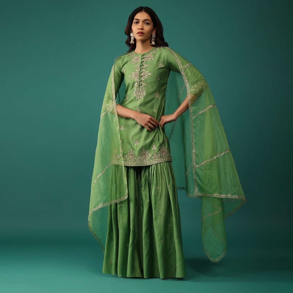 Olive Green Embroidered Kurti And Sharara Set In Chanderi Silk