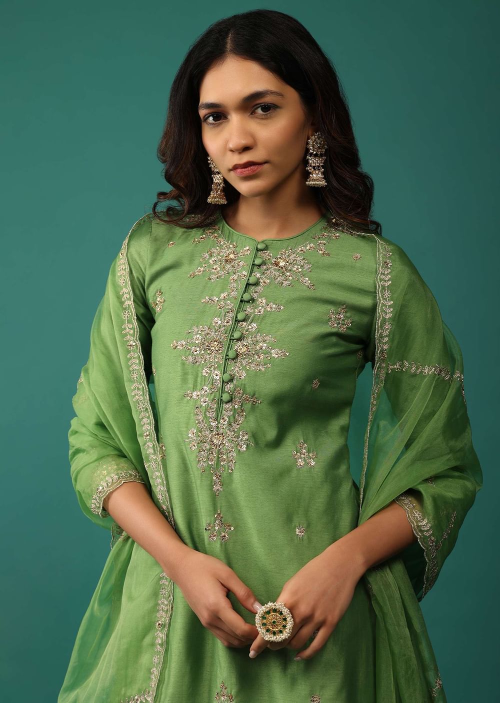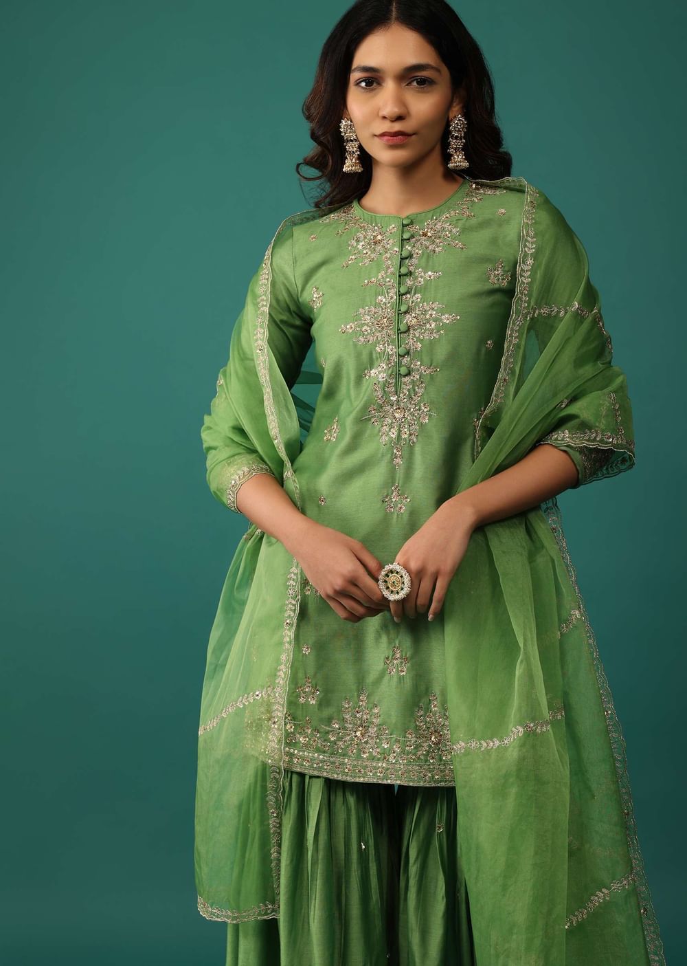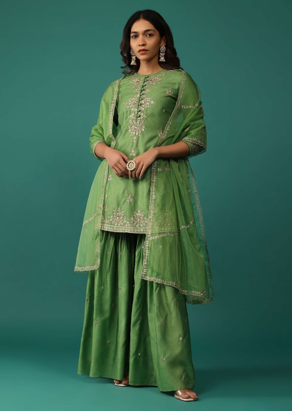Elevate your festive wardrobe with our stunning olive green kurti and sharara set. The kurti is beautifully embellished with intricate sequins, zari, and cut dana embroidery. The set is completed... More Product Details