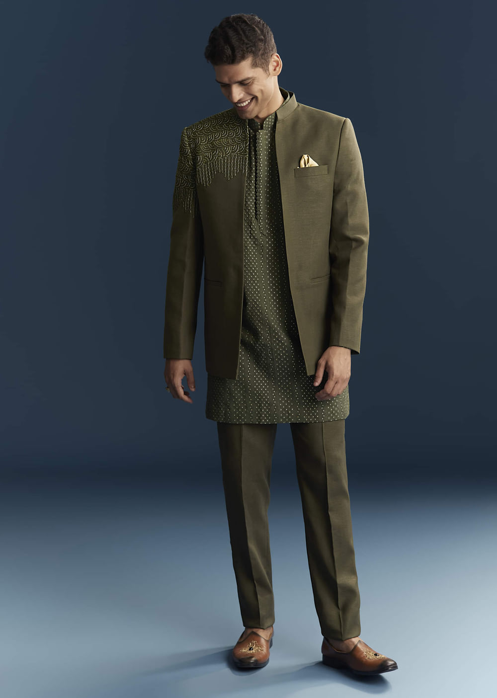 Evening energy comes through when this olive green polyester open men’s jodhpuri suit with chanderi kurta sets a sharp tone. Beads and thread embroidery concentrate on the right shoulder and... More Product Details