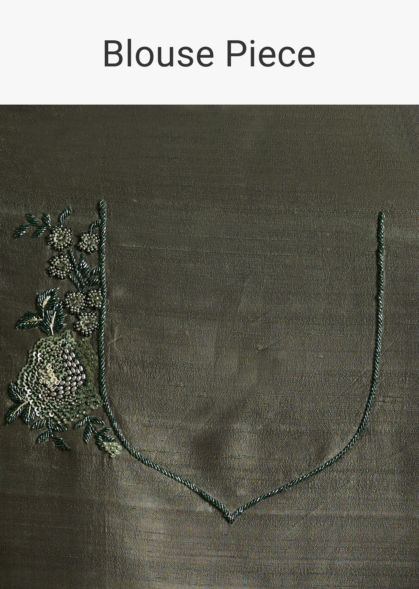 Olive green tissue saree detailed with cutdana, sequins, beads, and a distinctive cutwork border. Comes with an unstitched blouse. Perfect for Sangeet and Cocktail parties. Awarded as the Most Trusted Brand, we're delivering styles you love, just as promised.