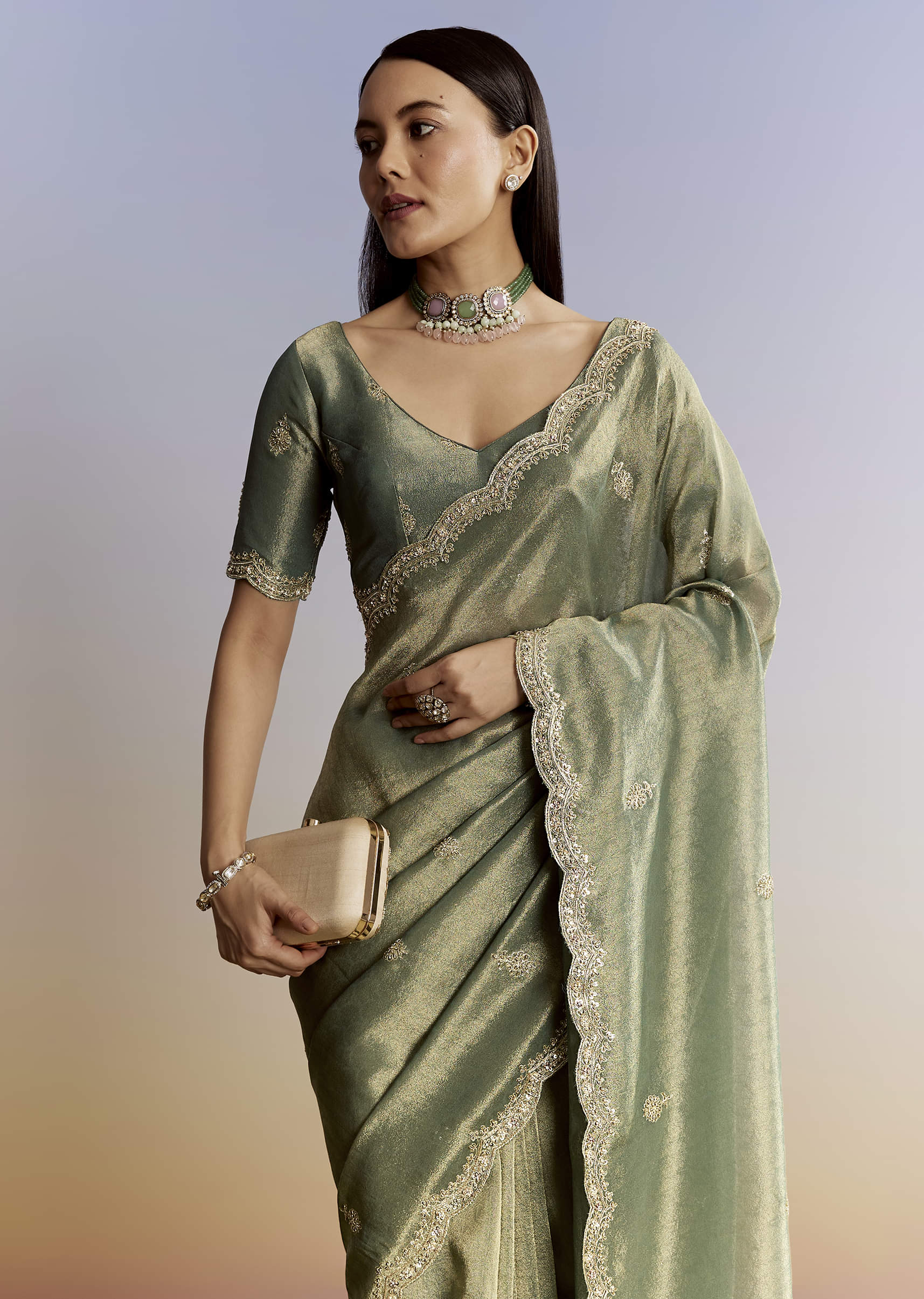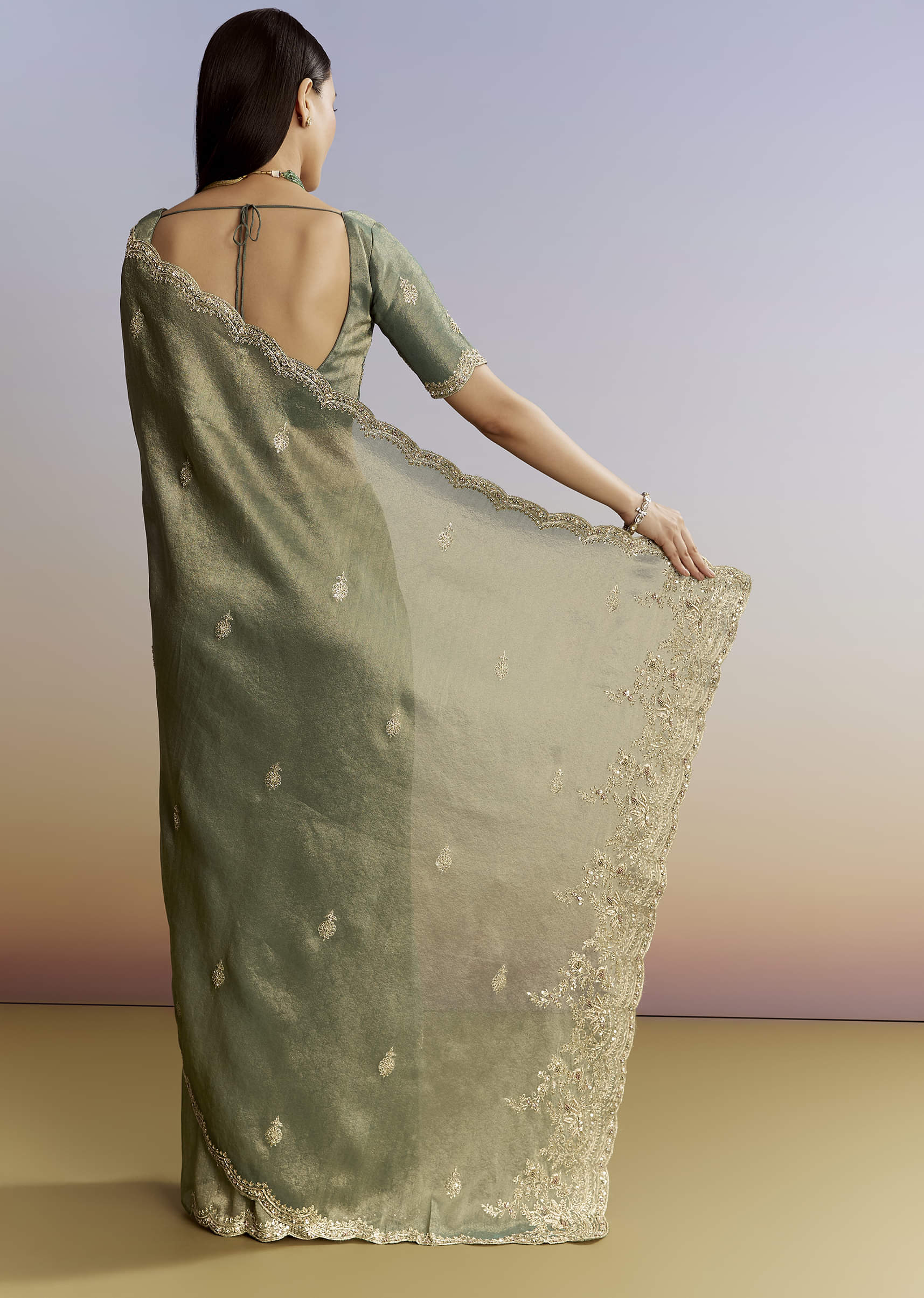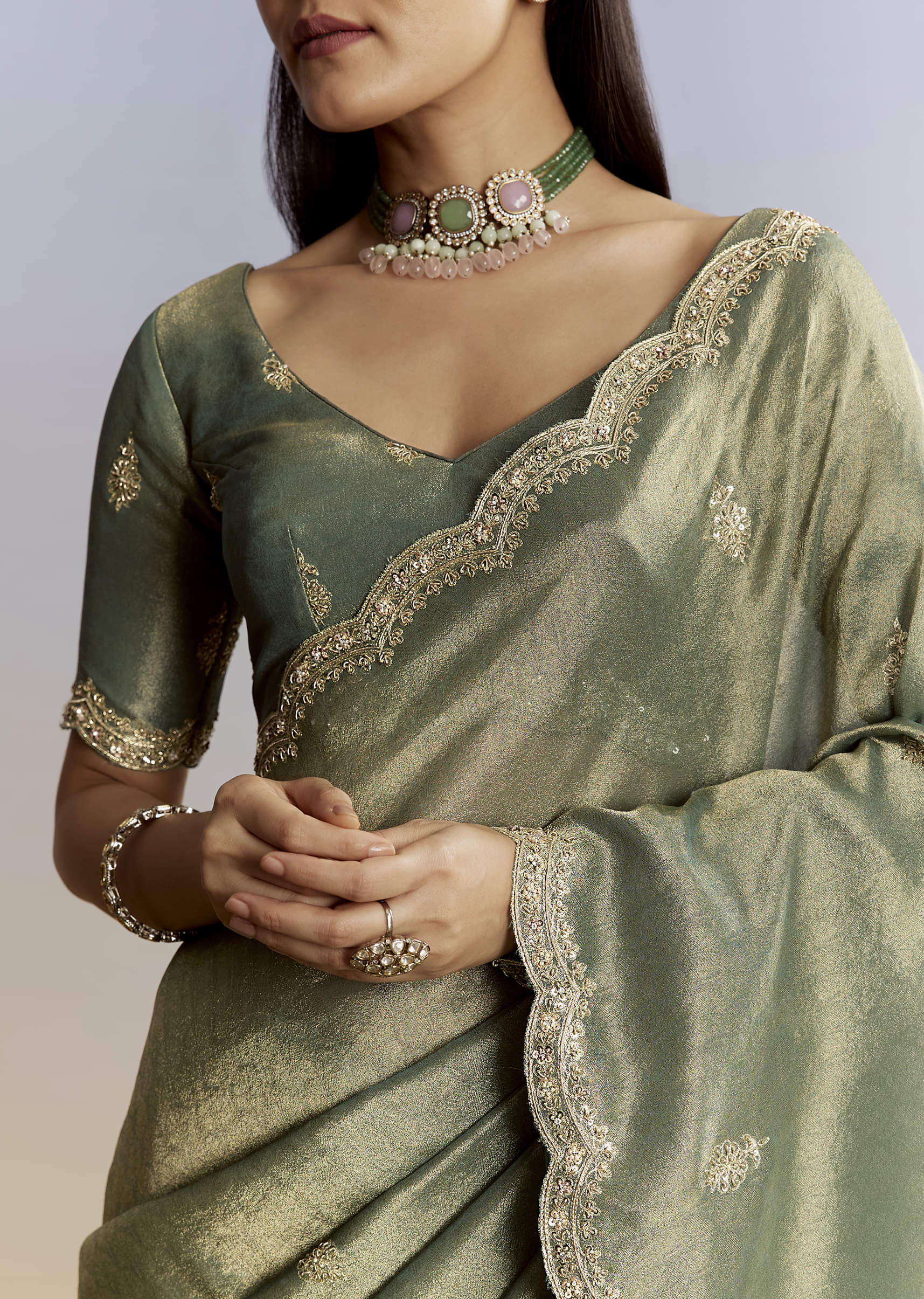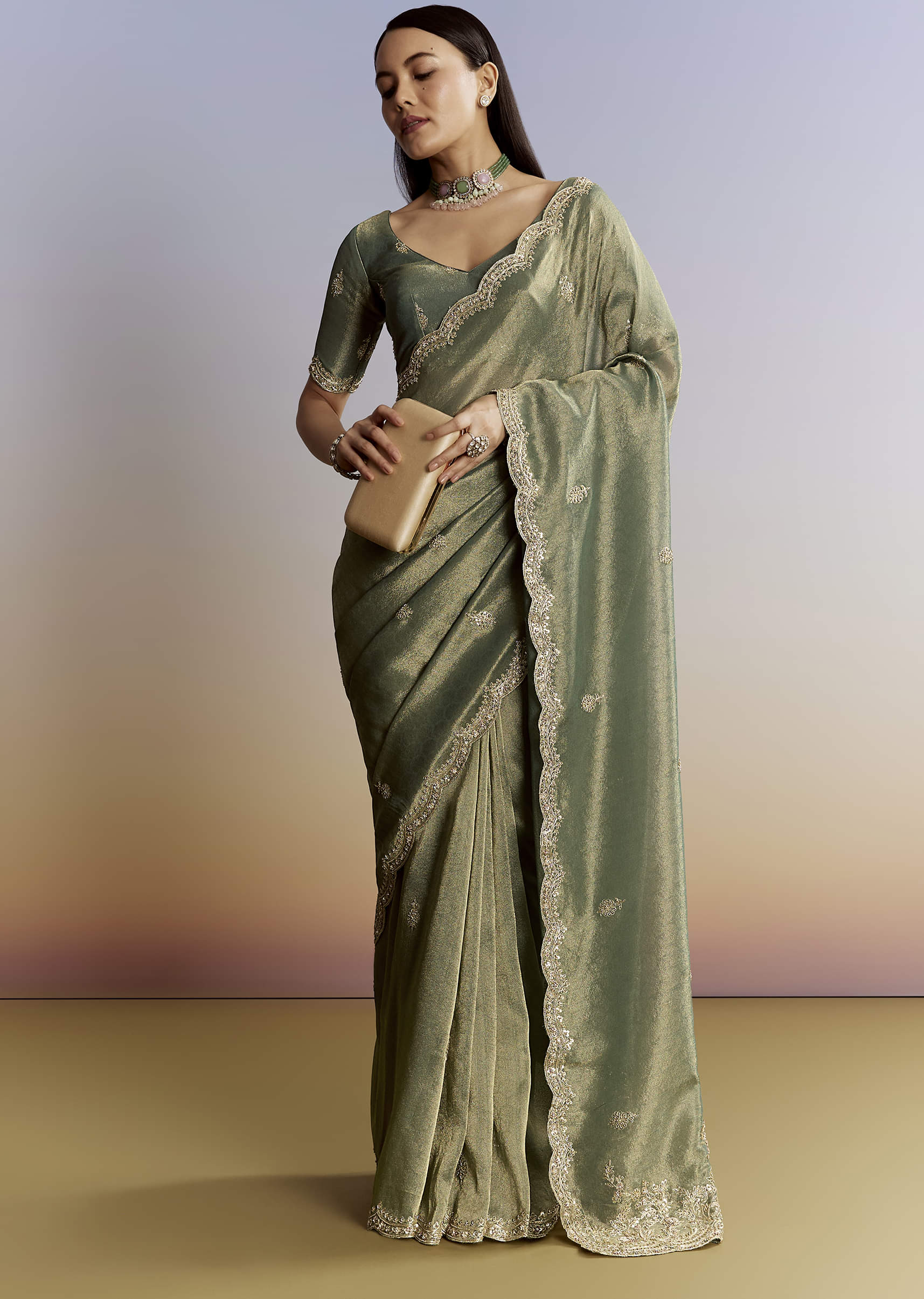 Olive Green Tissue Saree With Zardosi And Sequin Embroidery