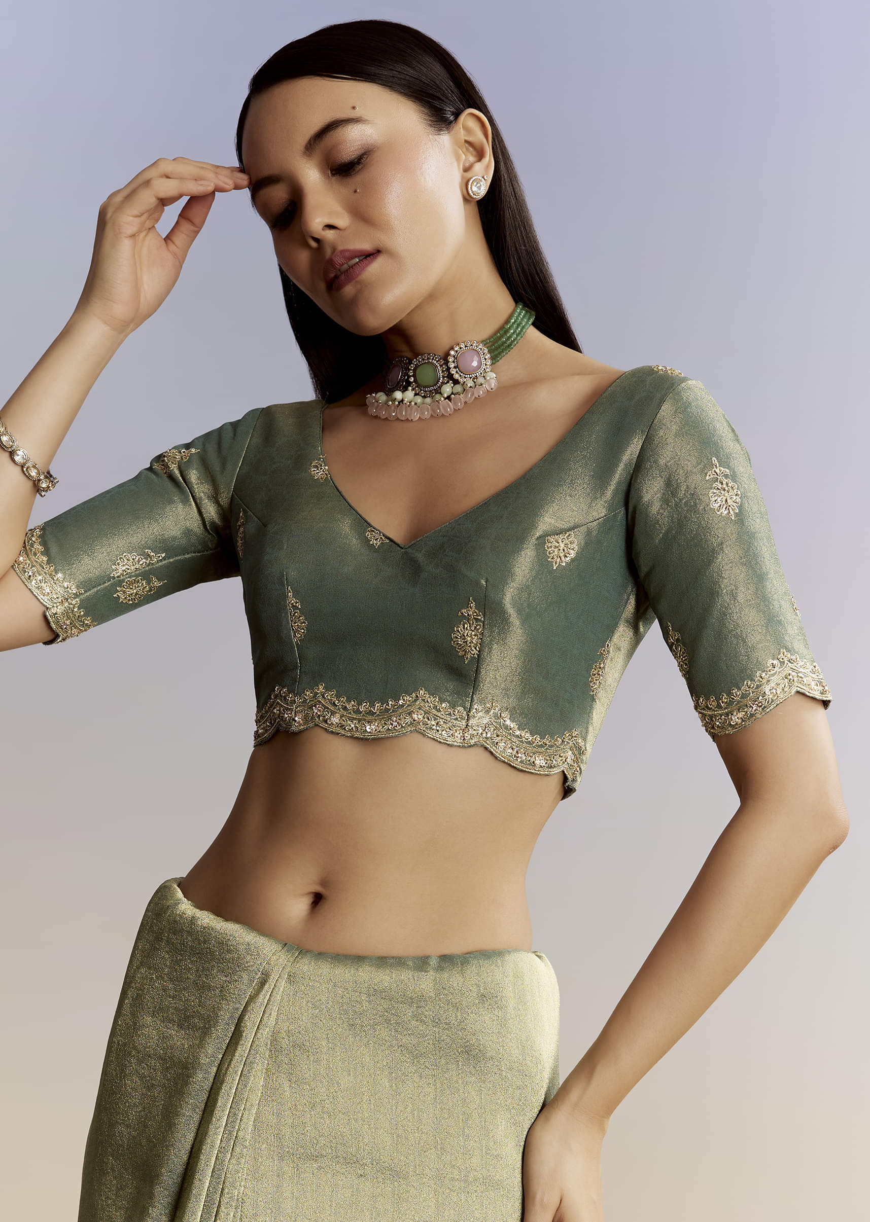 This olive green tissue saree is a forest of luxury, with zardosi, sequins, and beads entwining along scalloped borders and a coordinating blouse — rich and earthy in every fold.... More Product Details