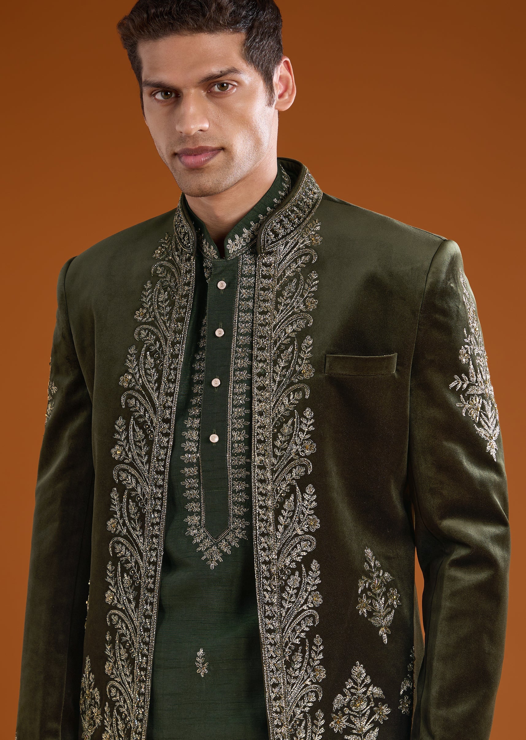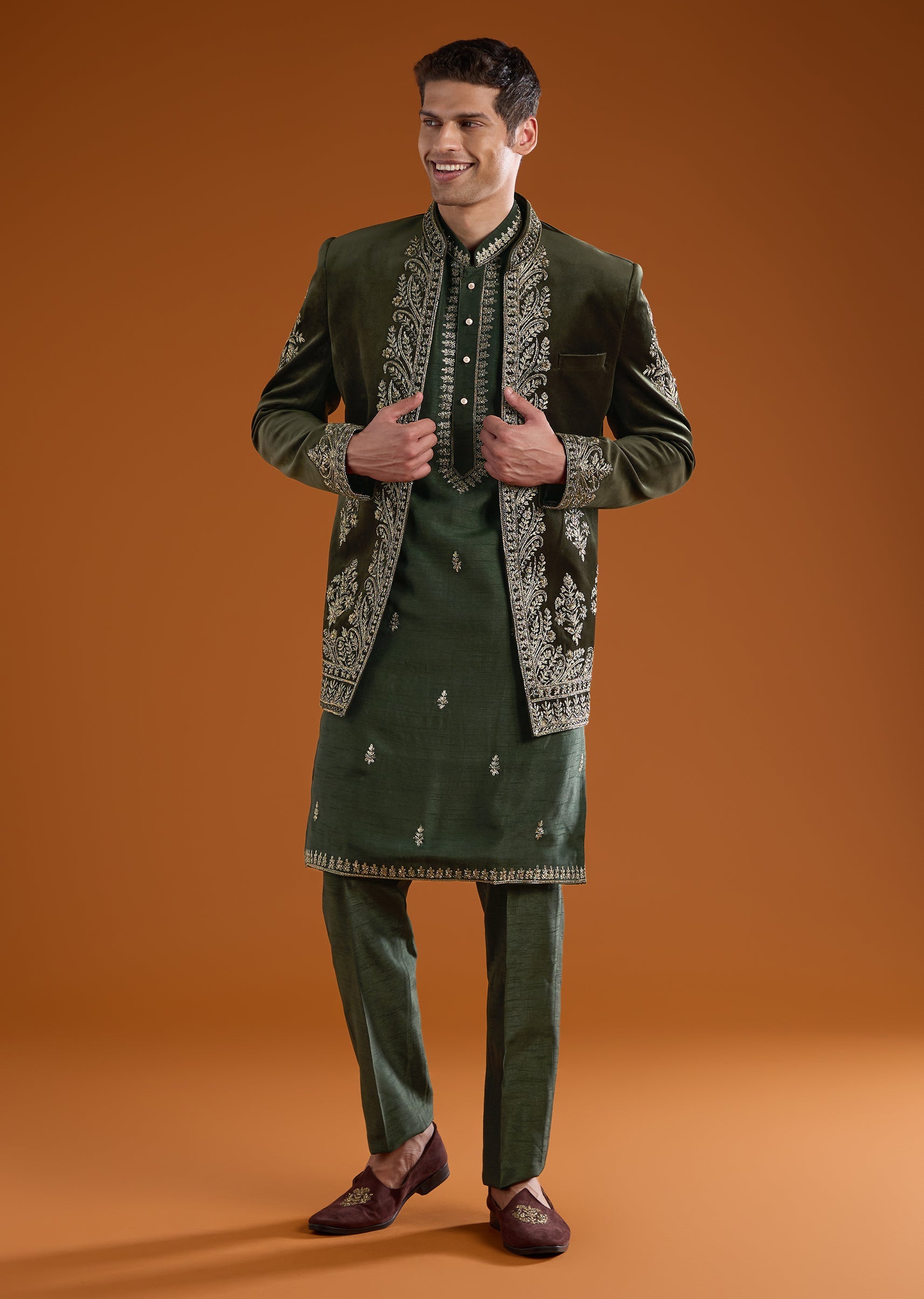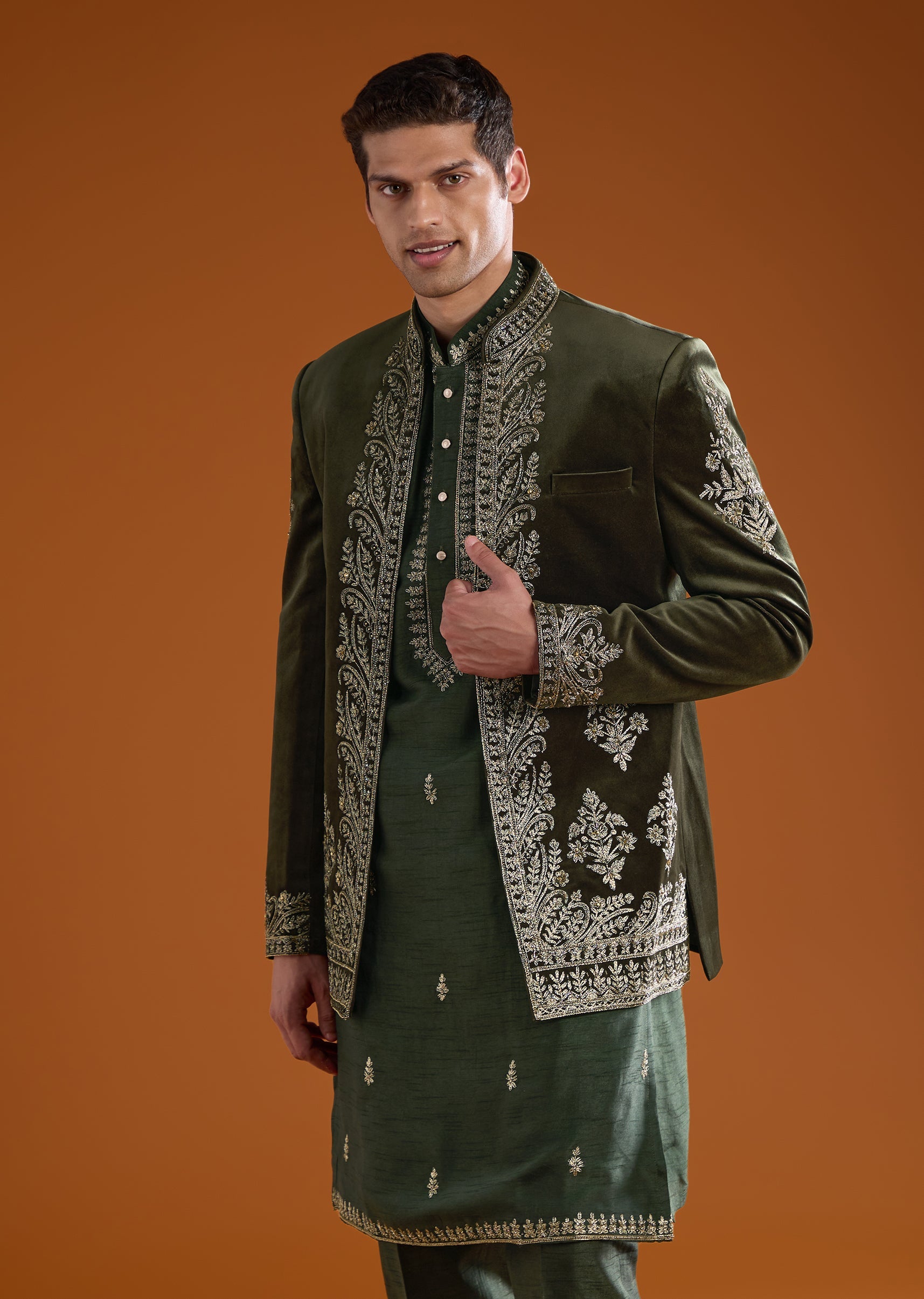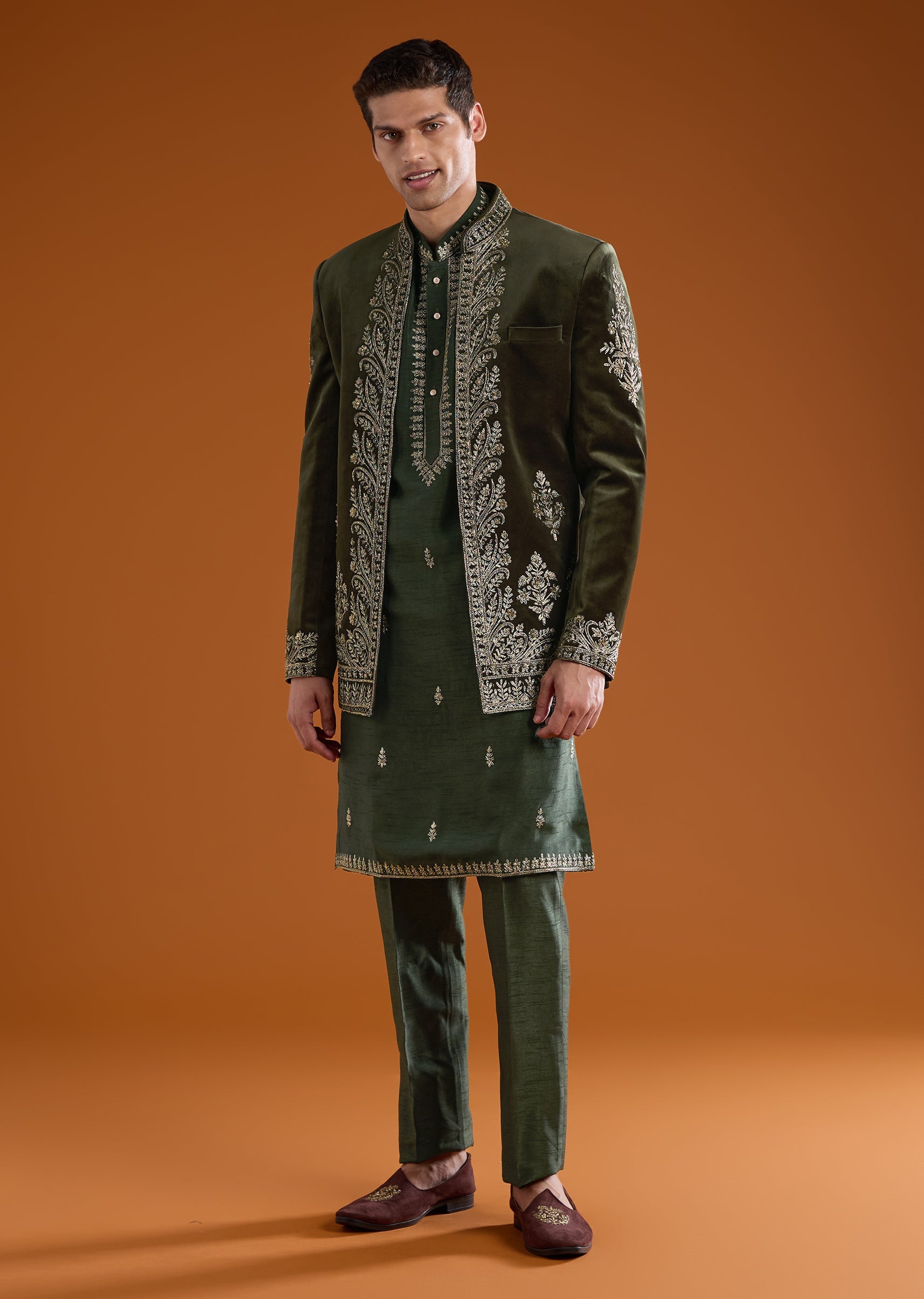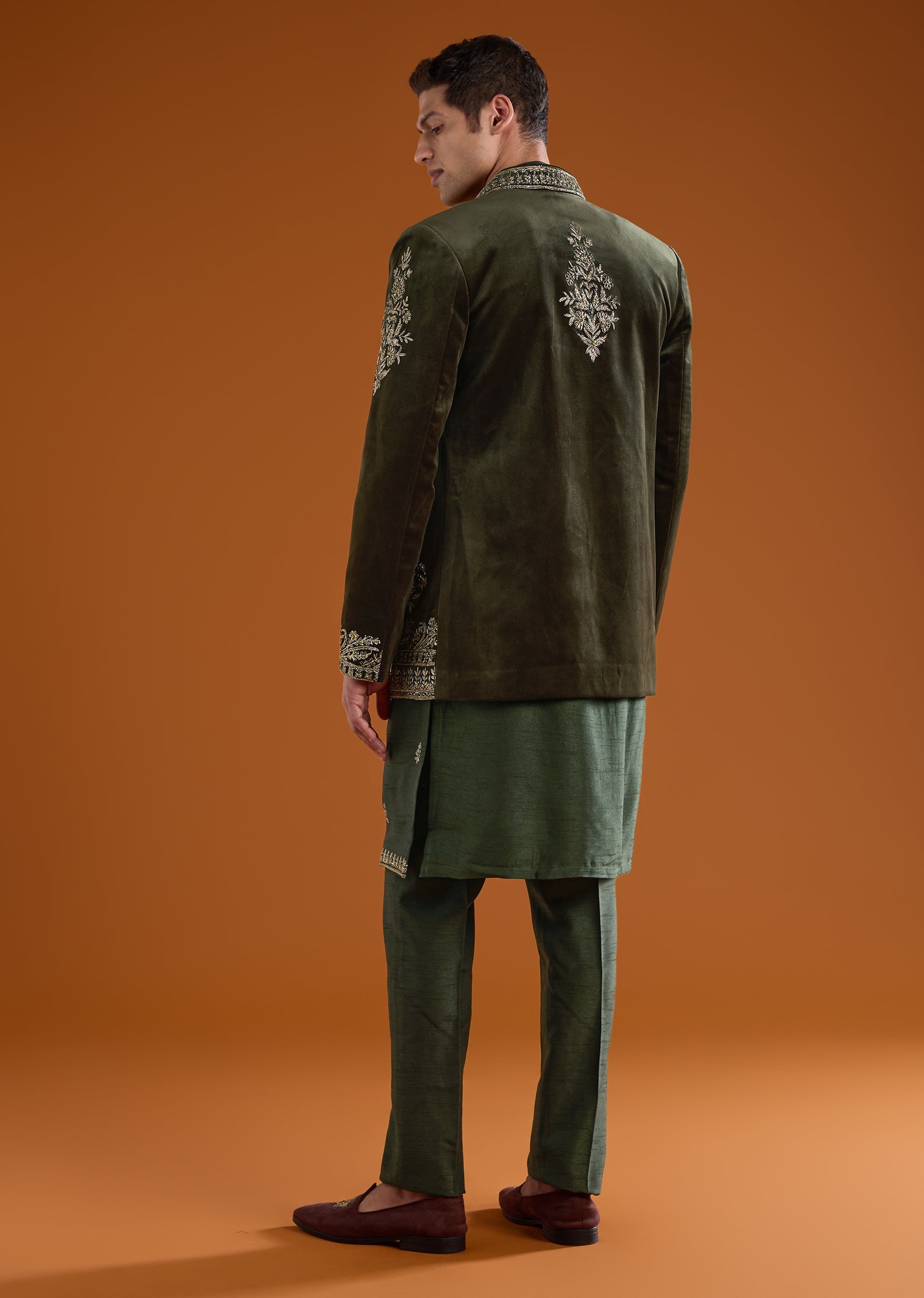 Olive Velvet Jodhpuri Kurta Set with Zardozi Embroidery