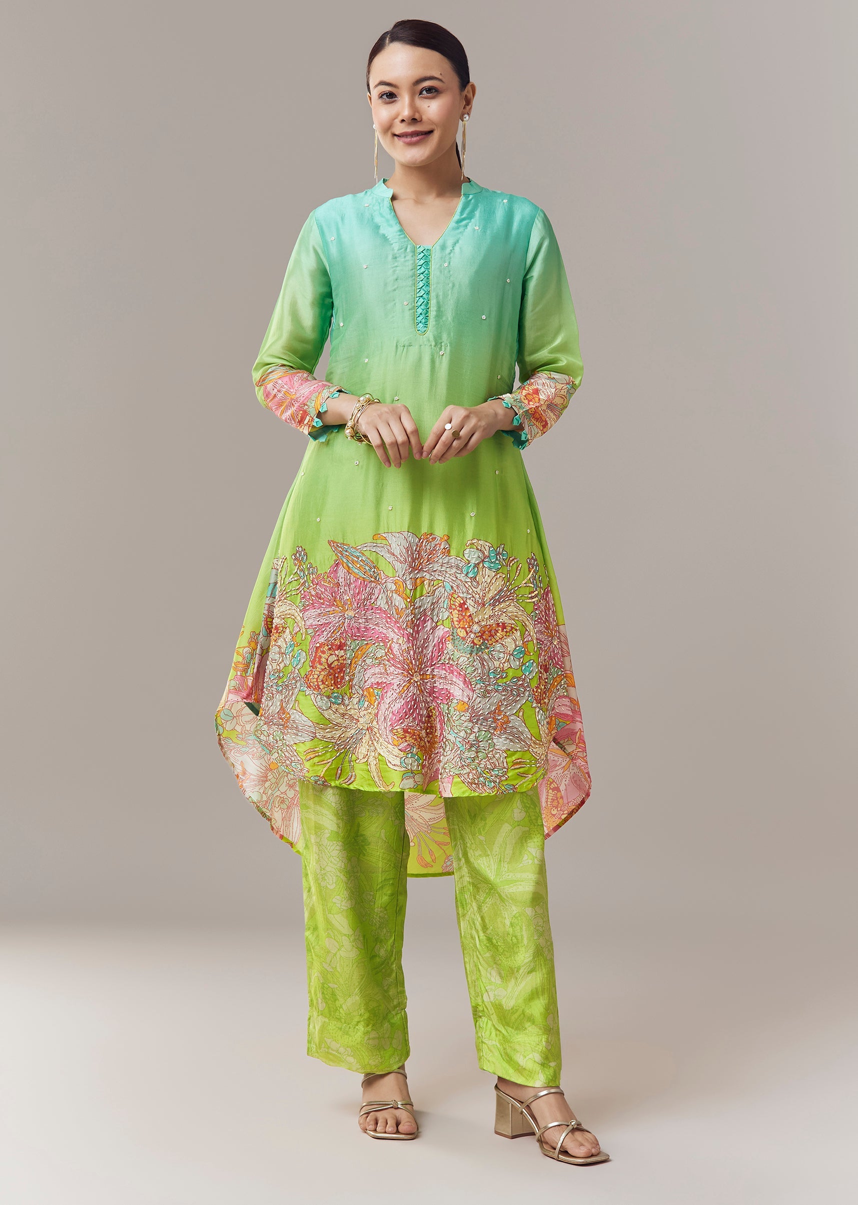 Ombre Green Silk Coord Set With Floral Embellishment