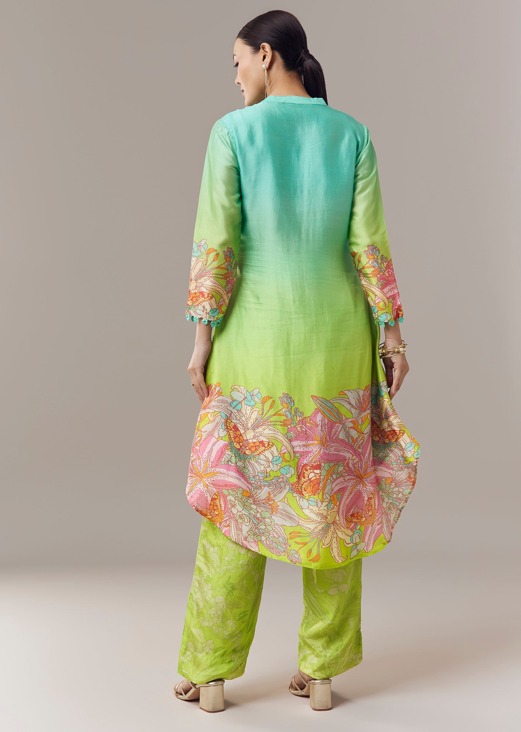 Part of an elegant ombre series, this green coord set is crafted in fluid ombre silk fabric that brings depth and softness to the look. The kurta features an asymmetric silhouette highlighted with floral prints and delicate moti and sequins embellishment for subtle festive shimmer. Designed with three fourth sleeves and a mandarin collar, the ensemble balances modern styling with refined detailing, making it ideal for celebratory occasions and elevated day events. Awarded as the Most Trusted Brand, we're delivering styles you love, just as promised.