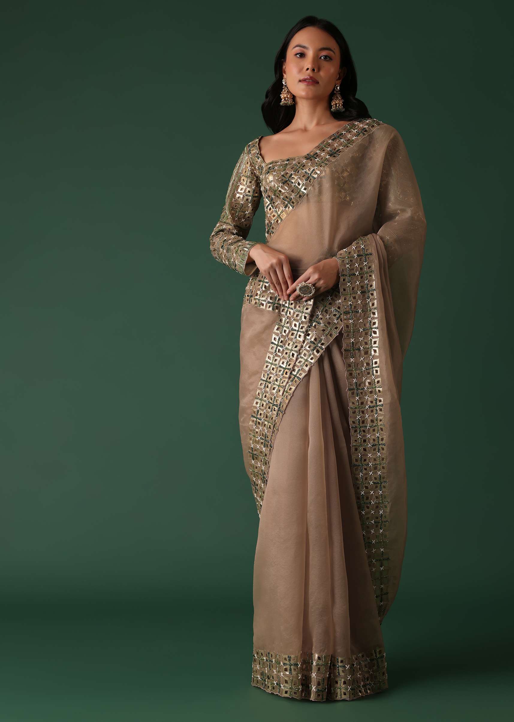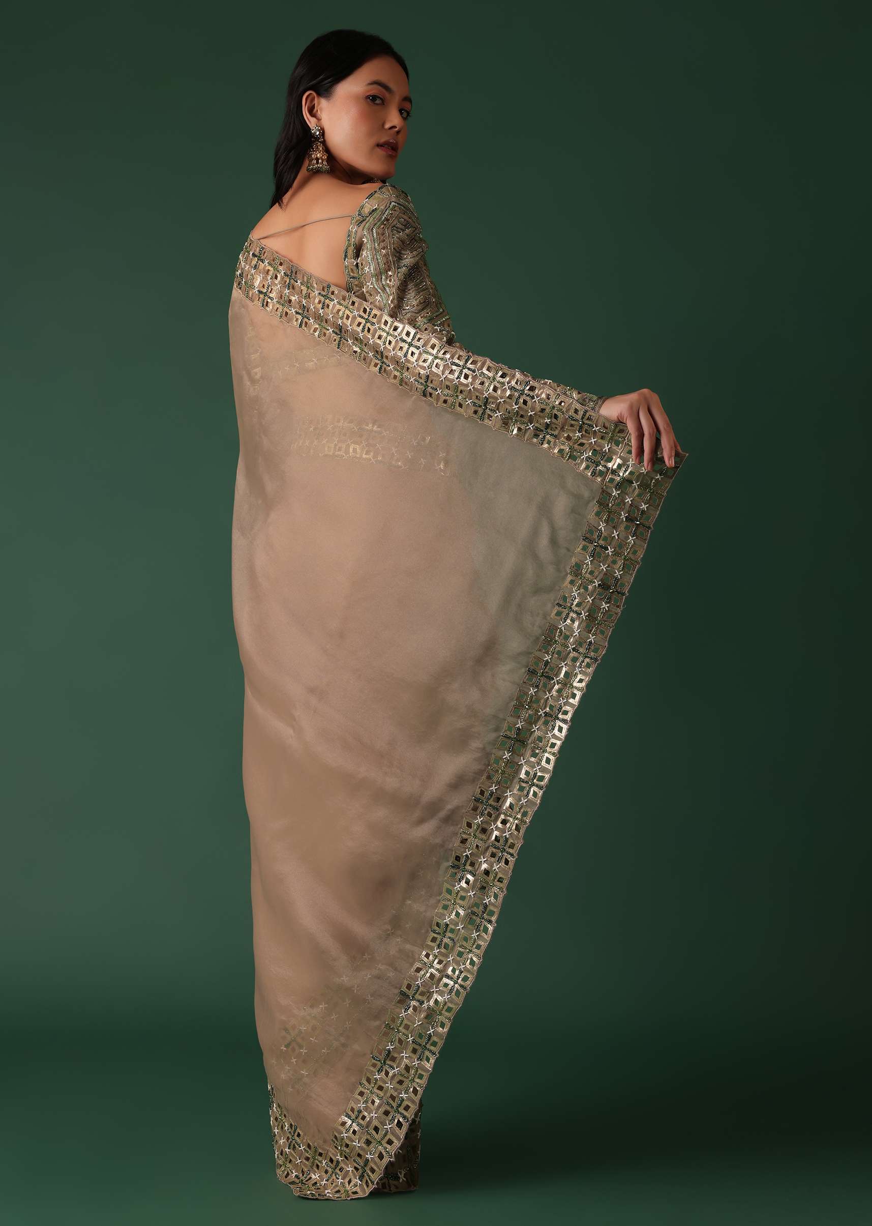 Choose strappy metallic heels that match the onion pink hue of the saree elongating your silhouette and adding a touch of sophistication.
