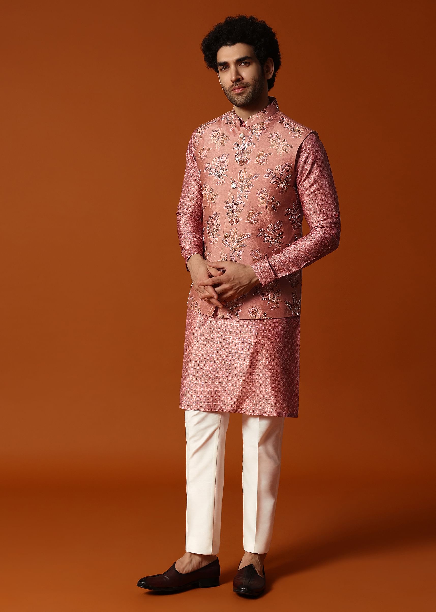 Indulge in elegance with our pink kurta jacket set, specially designed for sangeet and mehendi functions. This set is crafted from art silk and adorned with exquisite cutwork. The ensemble includes a kurta, a jacket, and bottom wear. Awarded as the Most Trusted Brand, we're delivering styles you love, just as promised.
