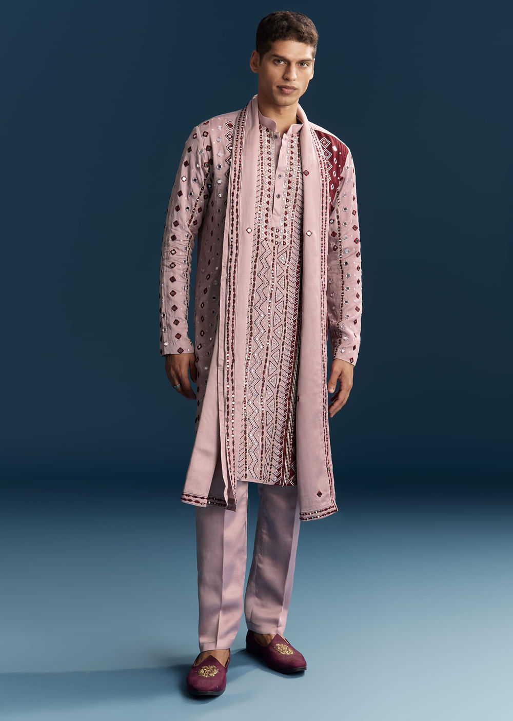 Onion Pink Silk Kurta Set For Men With Mirror And Thread Work