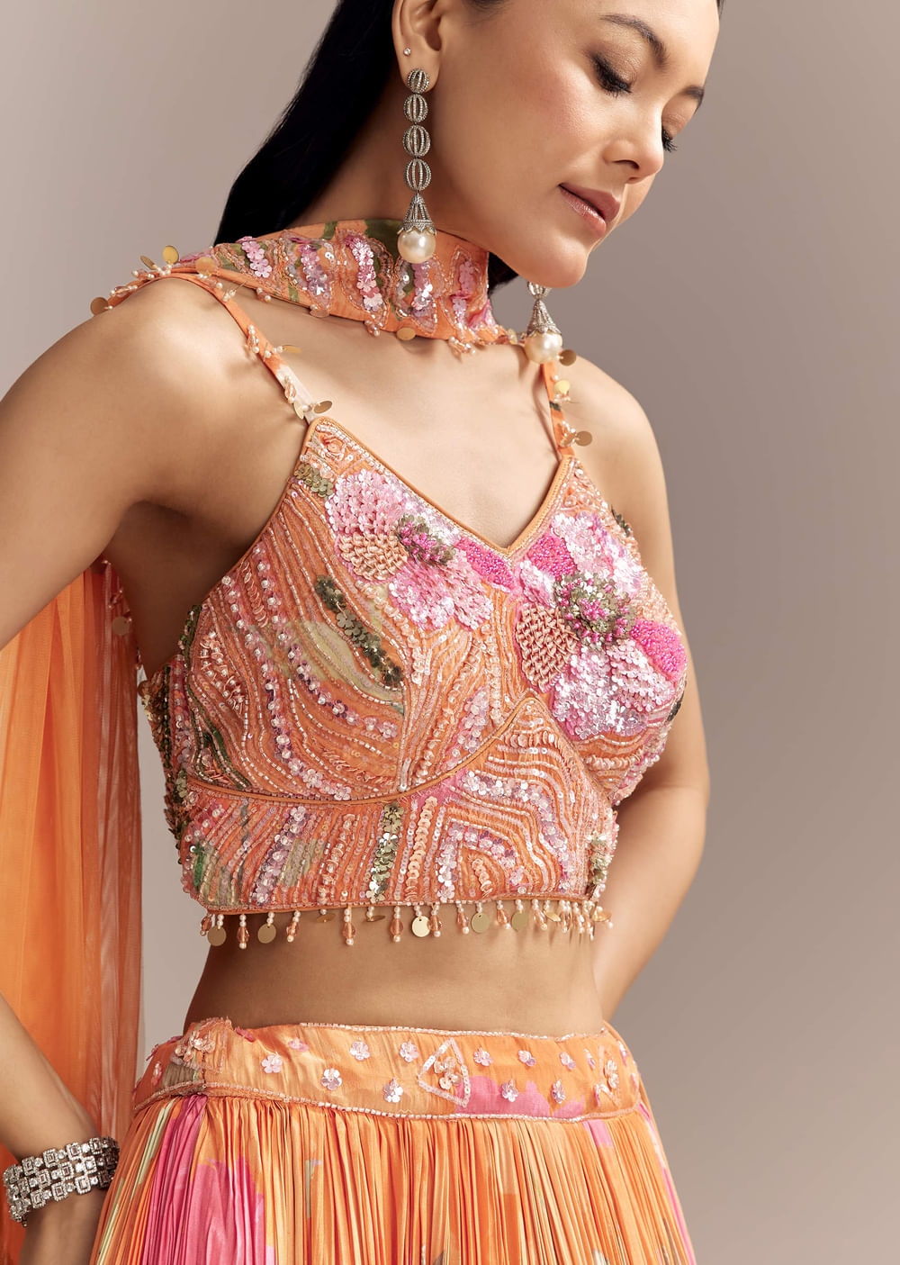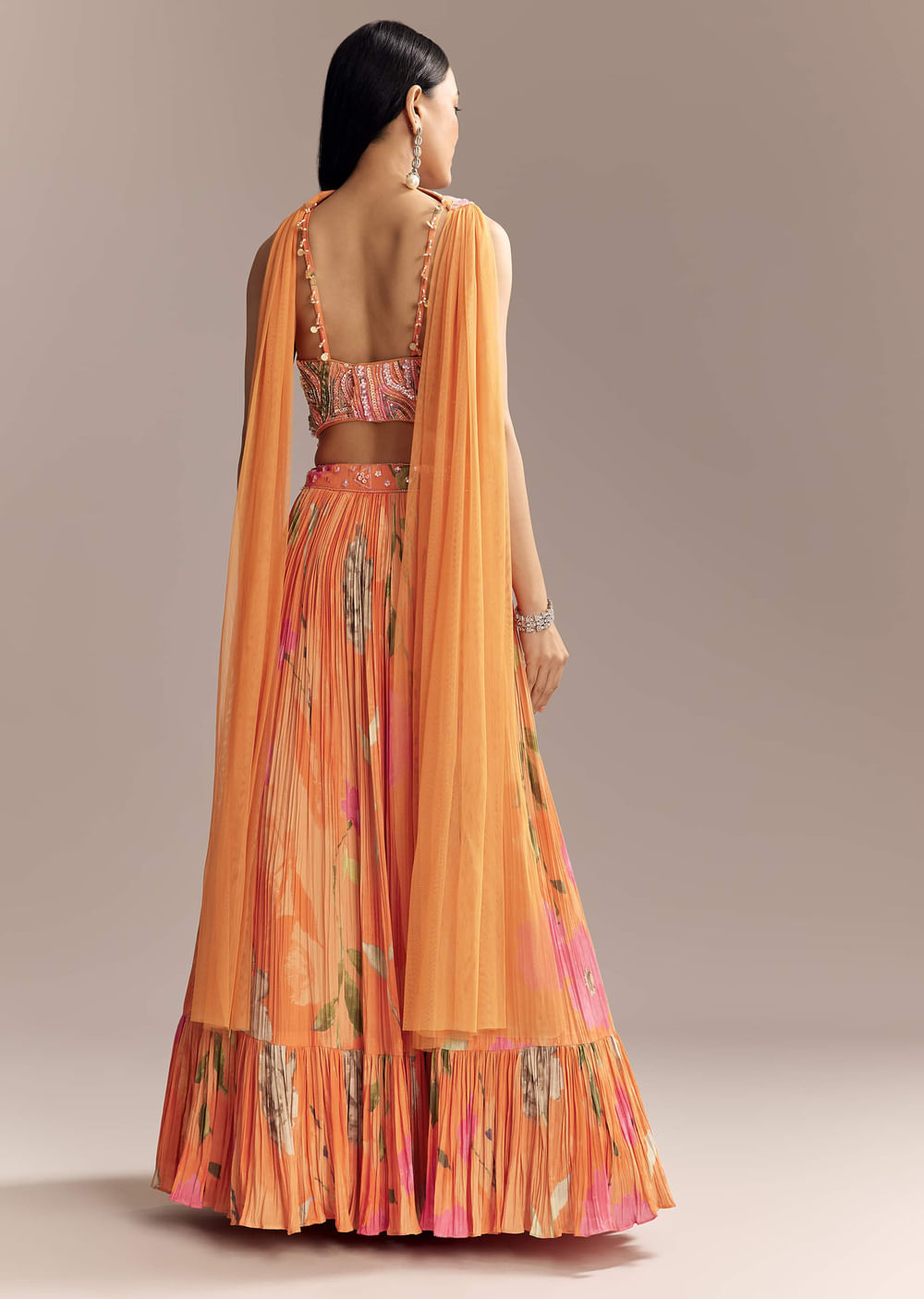 Orange Crepe Bridesmaid Lehenga With Multicolour Floral Print