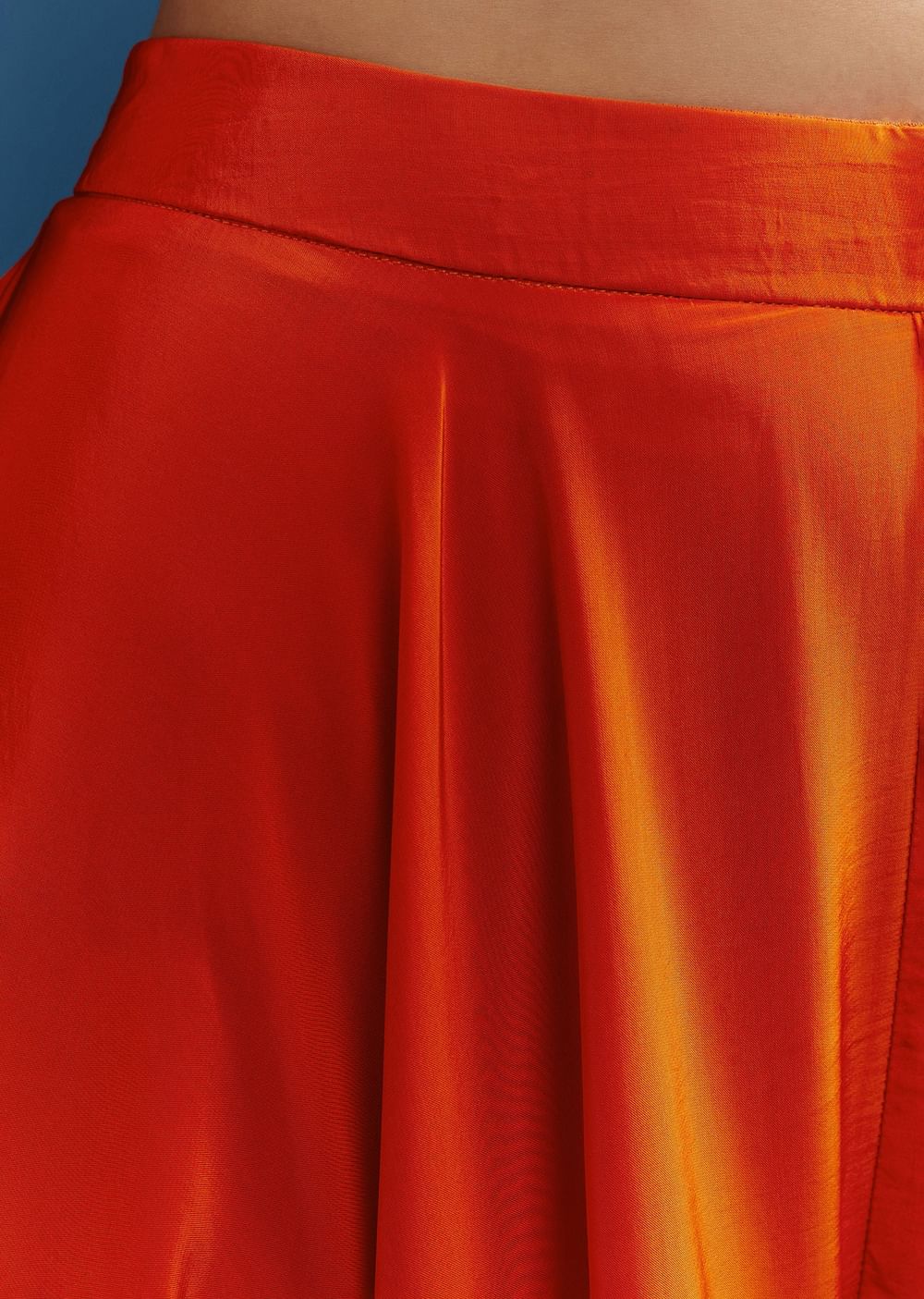 Bright and bold, this orange three piece set includes a zardosi crop top, crepe palazzos, and a printed chinon jacket that adds visual texture. The scoop neckline and full sleeves... More Product Details