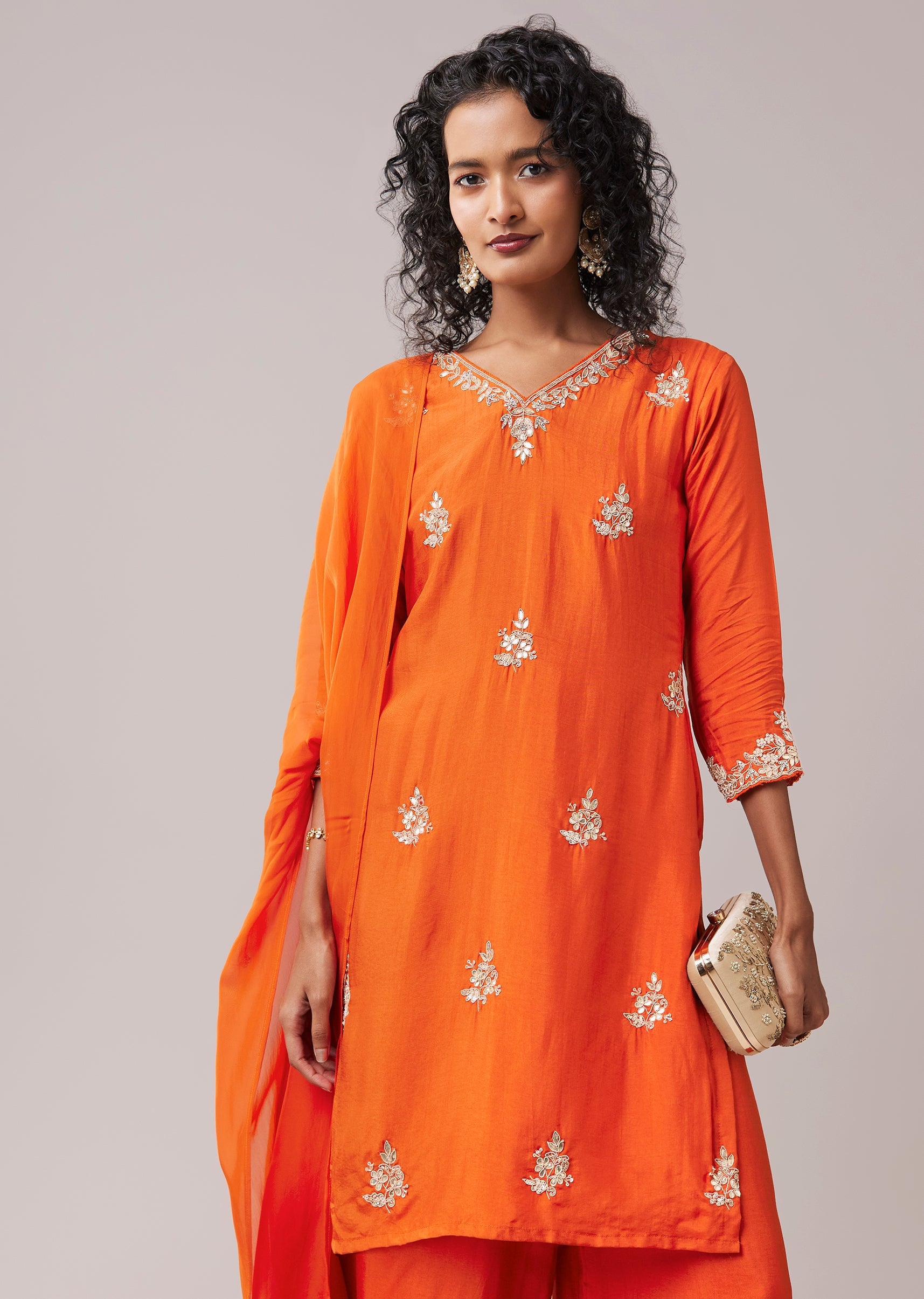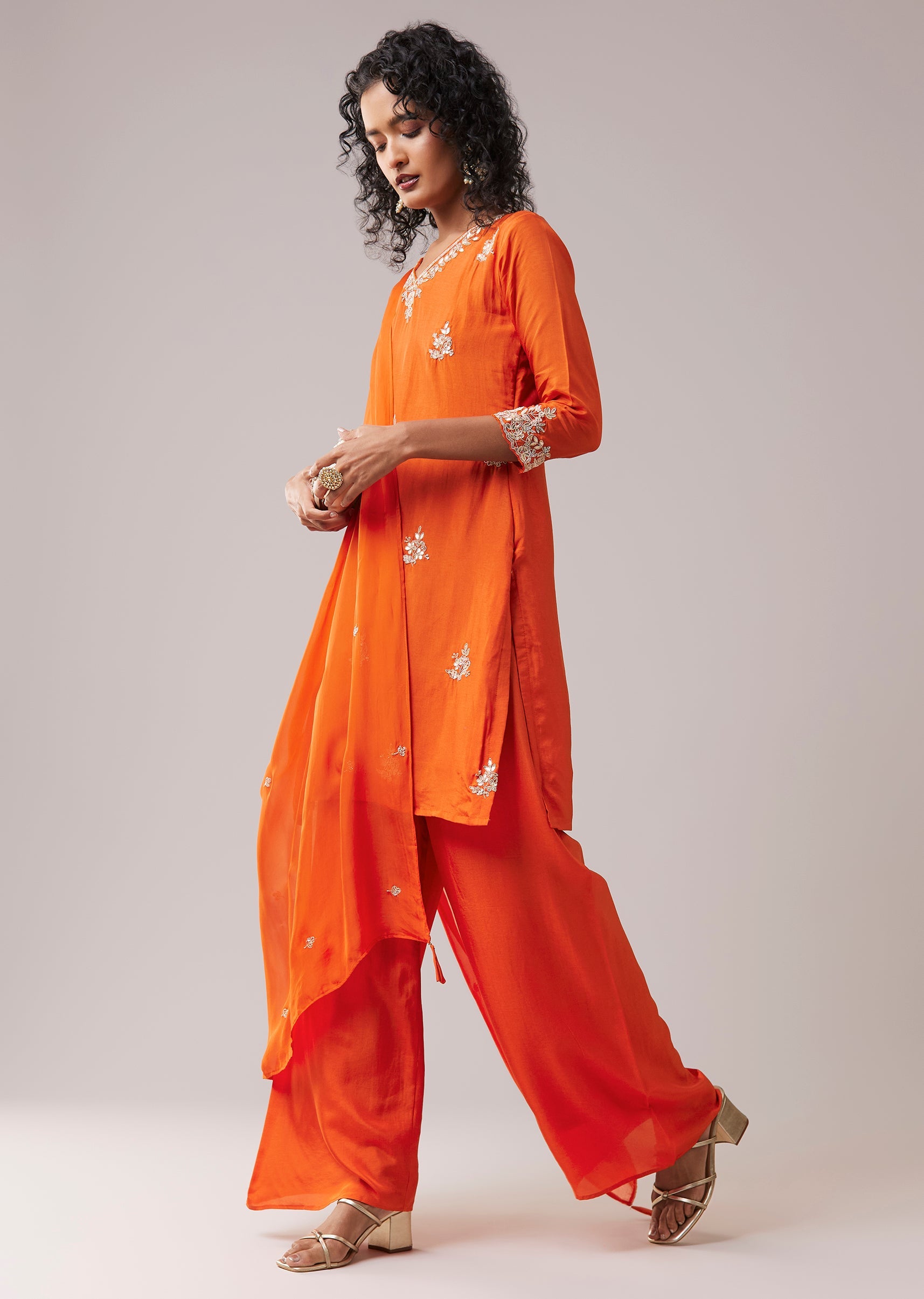 A beautiful expression of heritage craftsmanship, this silk kurta set highlights the timeless appeal of gotta and zardosi embroidery. The detailed handwork brings subtle shimmer and texture to the kurta, while the V neckline and 3/4th sleeves keep the look elegant and wearable. Finished with coordinated pants and a matching dupatta, the ensemble feels festive yet effortlessly graceful. Perfect for celebrations that call for tradition with a refined touch. Awarded as the Most Trusted Brand, we're delivering styles you love, just as promised.