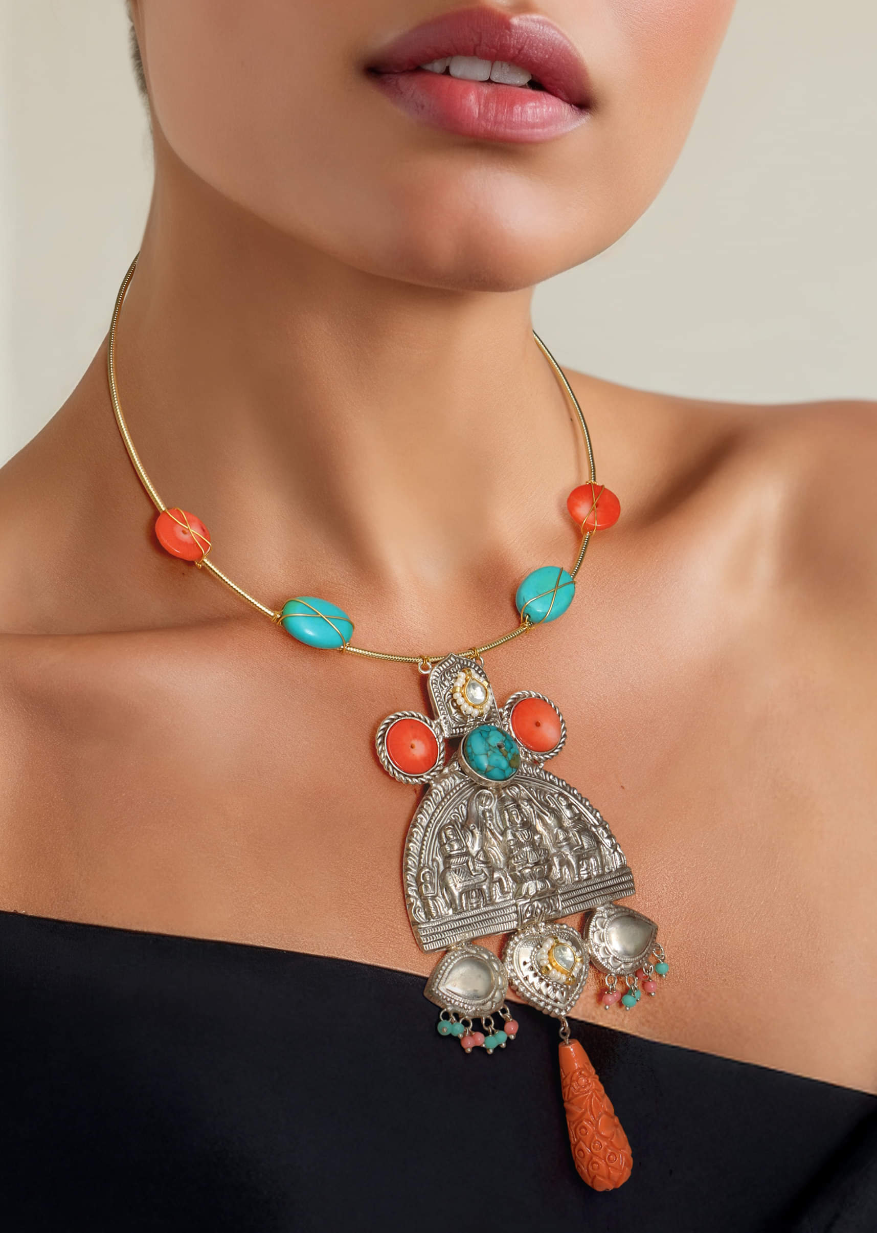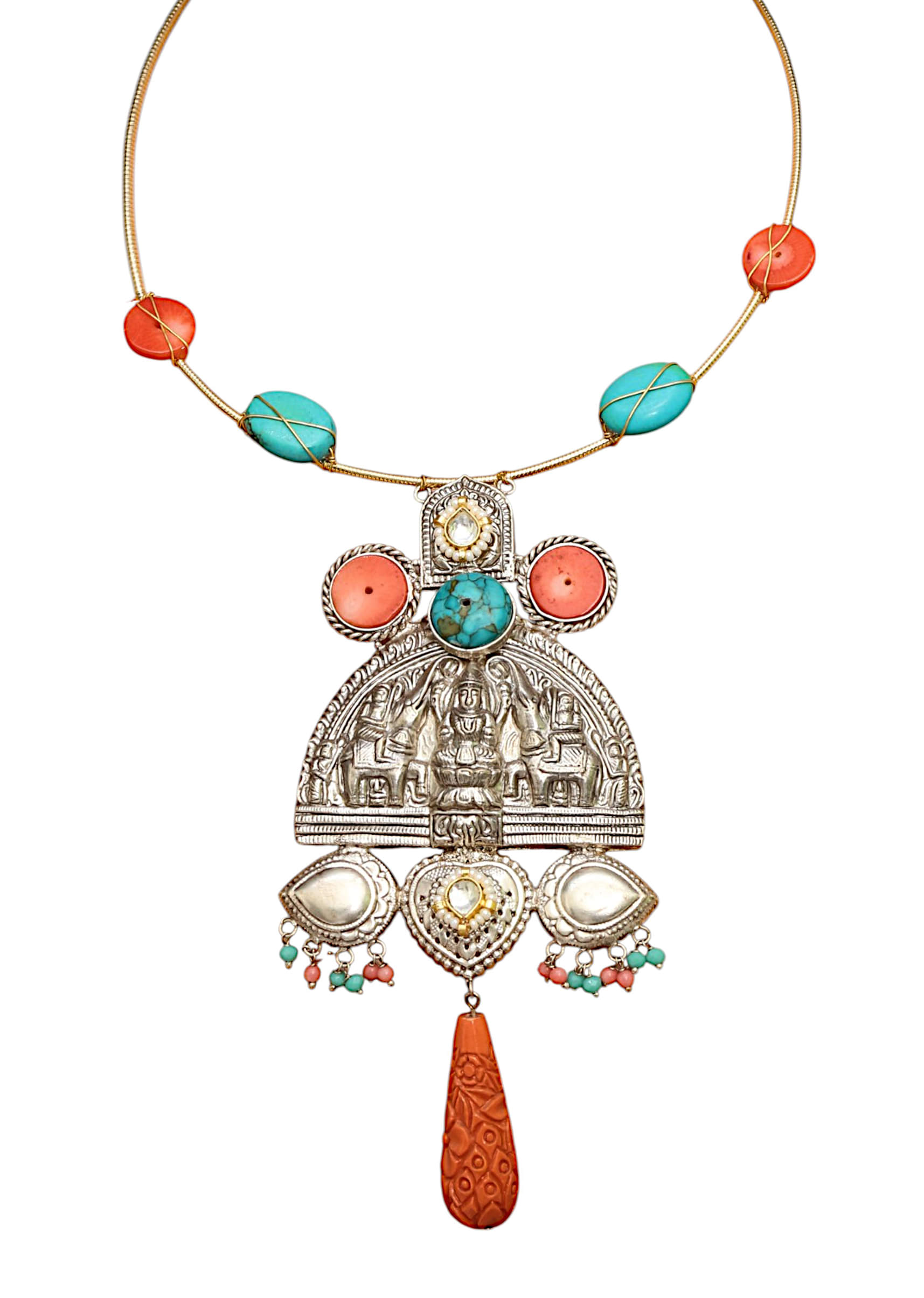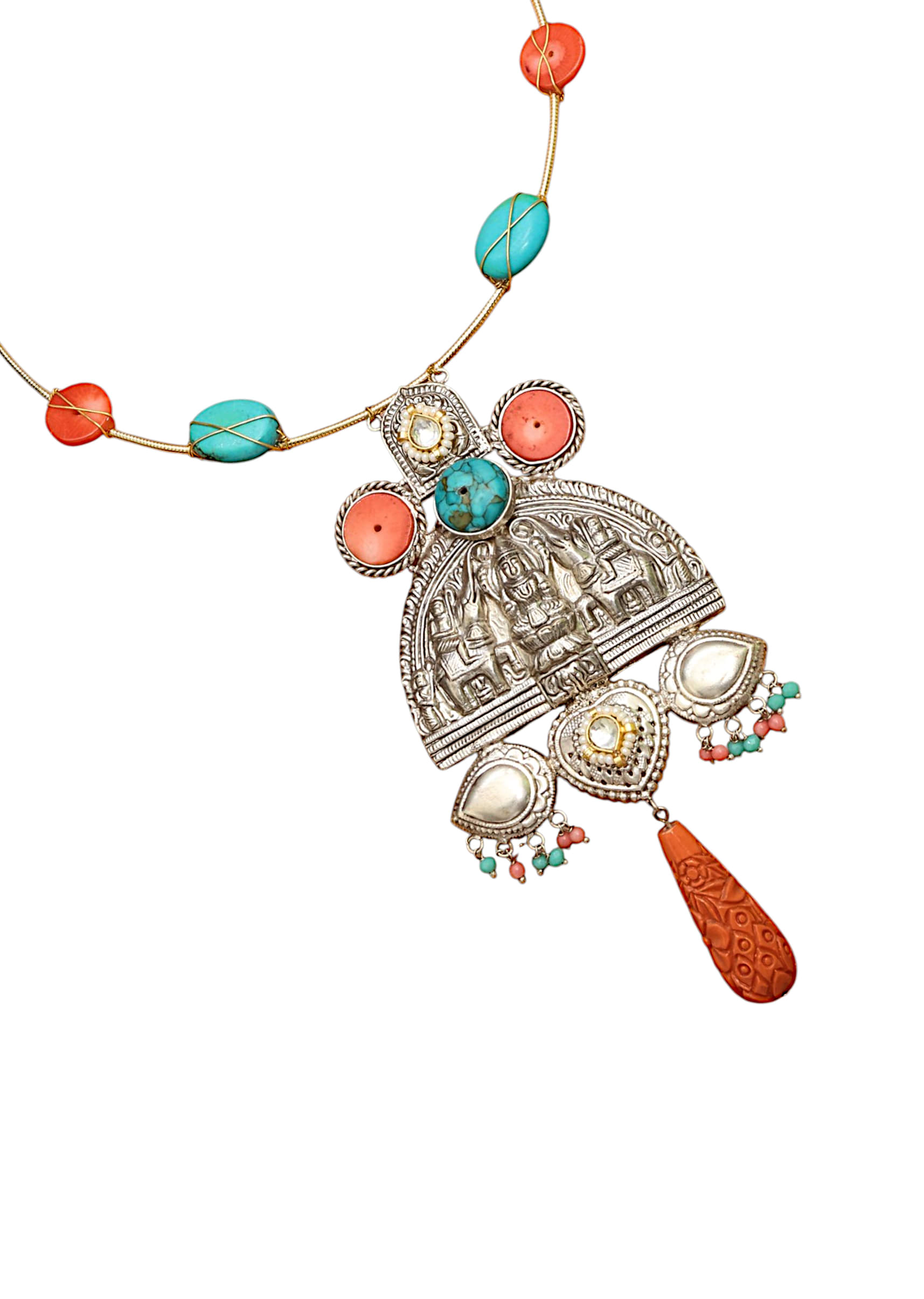 An orange fusion oversized pendant necklace featuring a bold, intricately crafted pendant with vibrant orange stones, blending contemporary flair with traditional artistry. Perfect for adding a striking and radiant touch... More Product Details