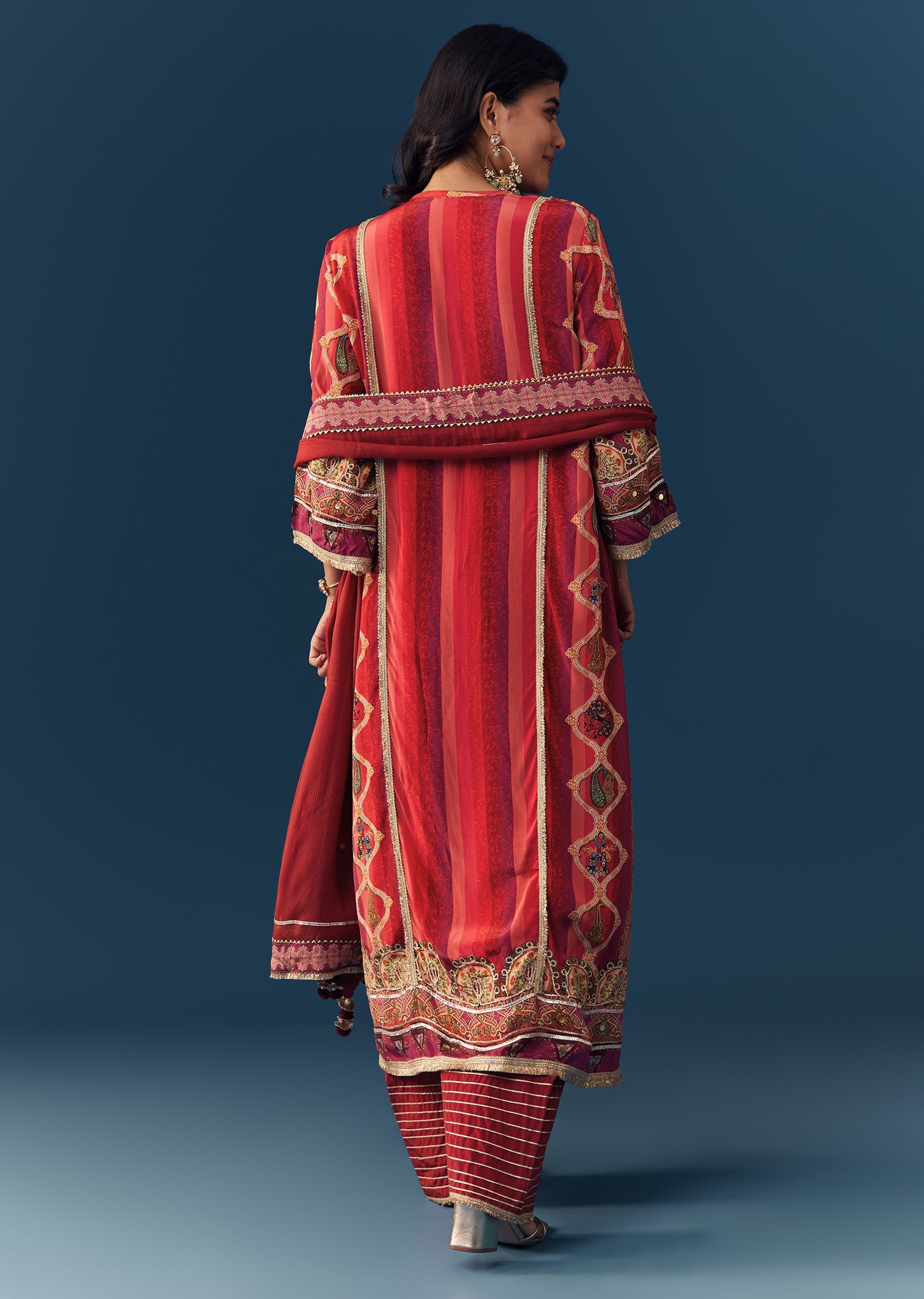 Bring a burst of festive brightness with this orange indie-printed kurta, adorned with delicate gotta lace work that adds a joyful celebratory shine. The round neckline and flared sleeves give... More Product Details
