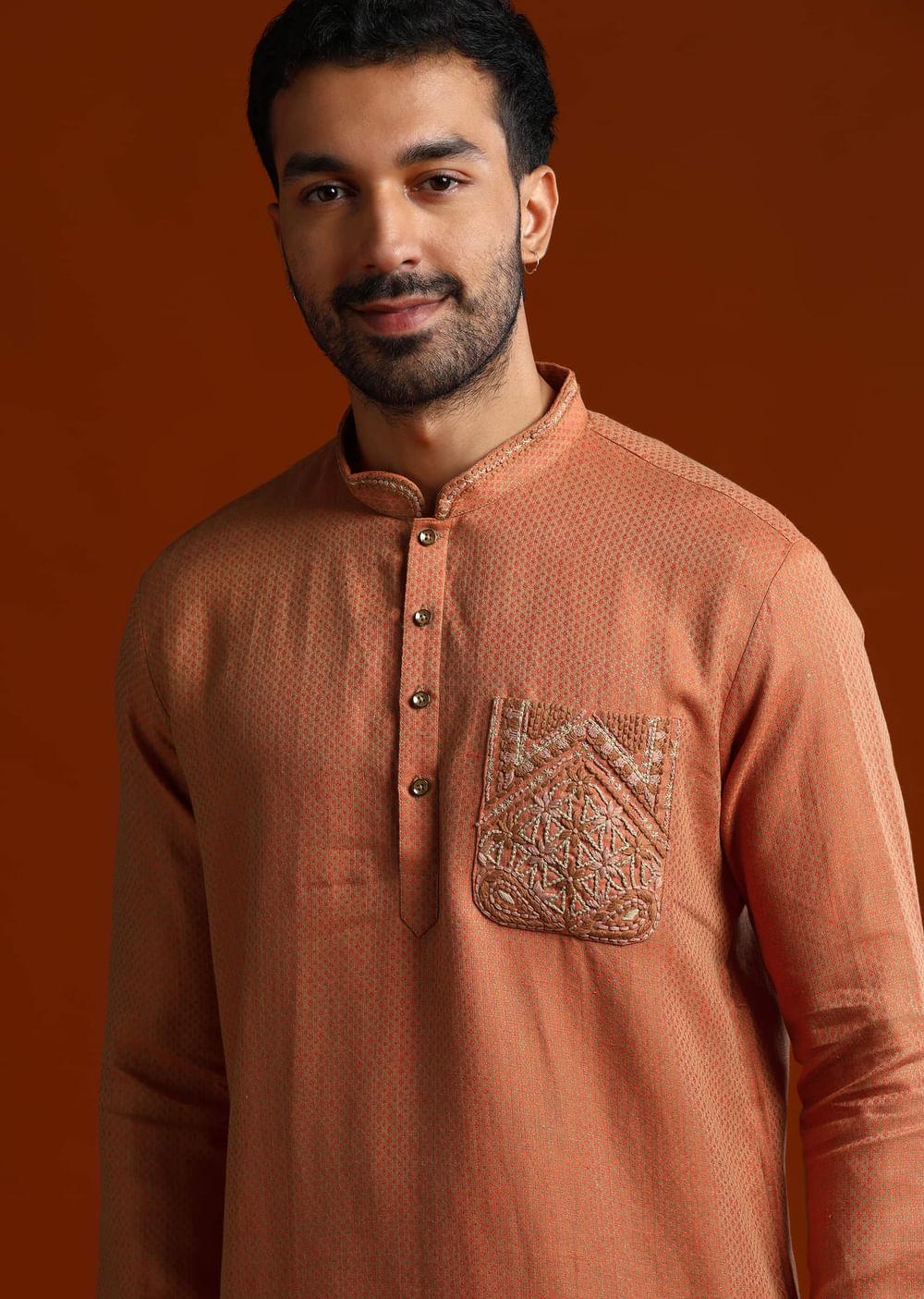 Warm and upbeat, this orange linen blend men’s kurta set highlights resham details that sit light on the fabric. The tone suits evening lights as well as daytime gatherings. You... More Product Details