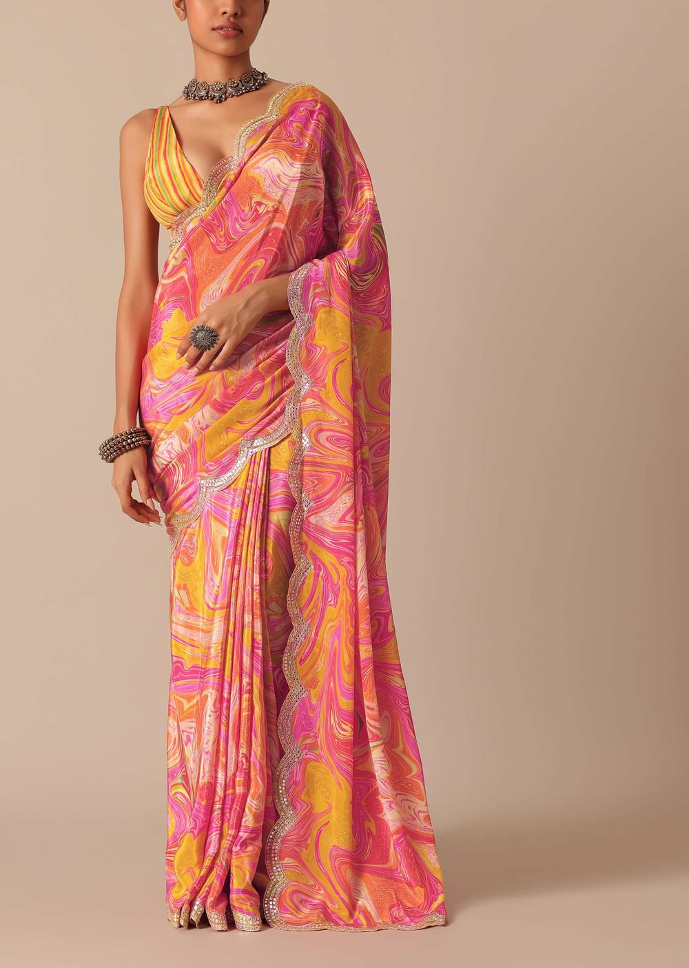 Featuring a resplendent saree that will wrap you beautifully. Brimming with elegance it is enhanced with fabulous kaleidoscope prints and mirror embellished scallop border. The lush muslin fabric and eyecatching orange hue bring a luxe feel to your seasonal wardrobe. Paired with an unstitched blouse piece this saree is here to help you slay in confidence. WASH CARE INSTRUCTIONS. Blouse print may vary. Awarded As The Most Trusted Brand We'Re Delivering Styles You Love Just As Promised.