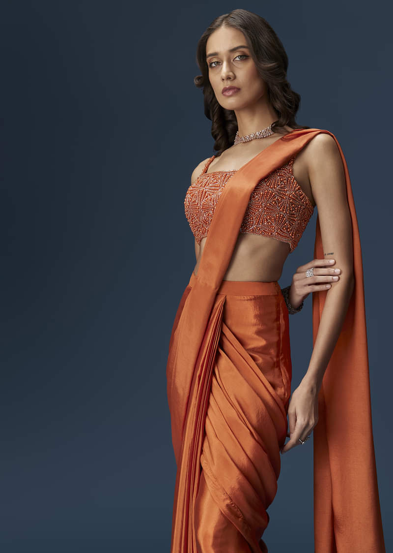 This striking orange saree features a pre-stitched drape and a net blouse with a square neckline and minimal moti work. A bold pick for bridesmaids or festive guests. Includes an unstitched blouse. Awarded as the Most Trusted Brand, we're delivering styles you love, just as promised.