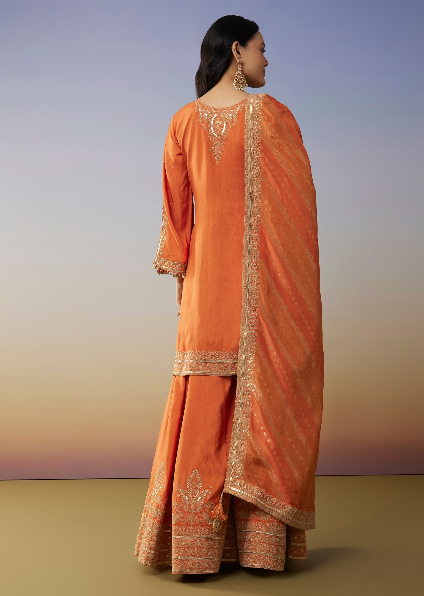 Orange Silk Palazzo Suits with Zari Work and Embroidery Detail
