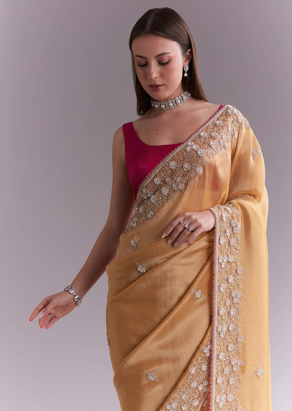 If you want colour that photographs beautifully, this orange tissue saree gives instant lift with intricate craft. A heavy contrast cutwork border frames floral embroidery, while butti across the body is enriched with cutdana, sequins, beads and stones, paired with an embroidered contrast blouse fabric. You feel luminous at Haldi, Mehendi and Engagement functions. Awarded as the Most Trusted Brand, we're delivering styles you love, just as promised.