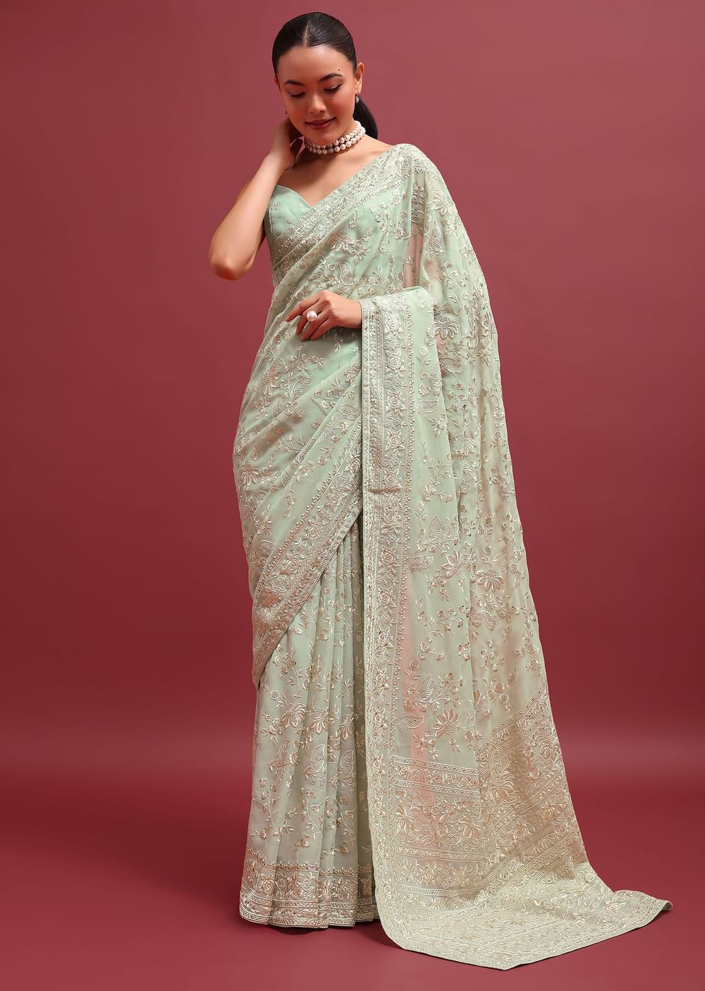 Pale Green Embroidered Parsi Gara Saree In Floral Resham Work And Unstitched Blouse