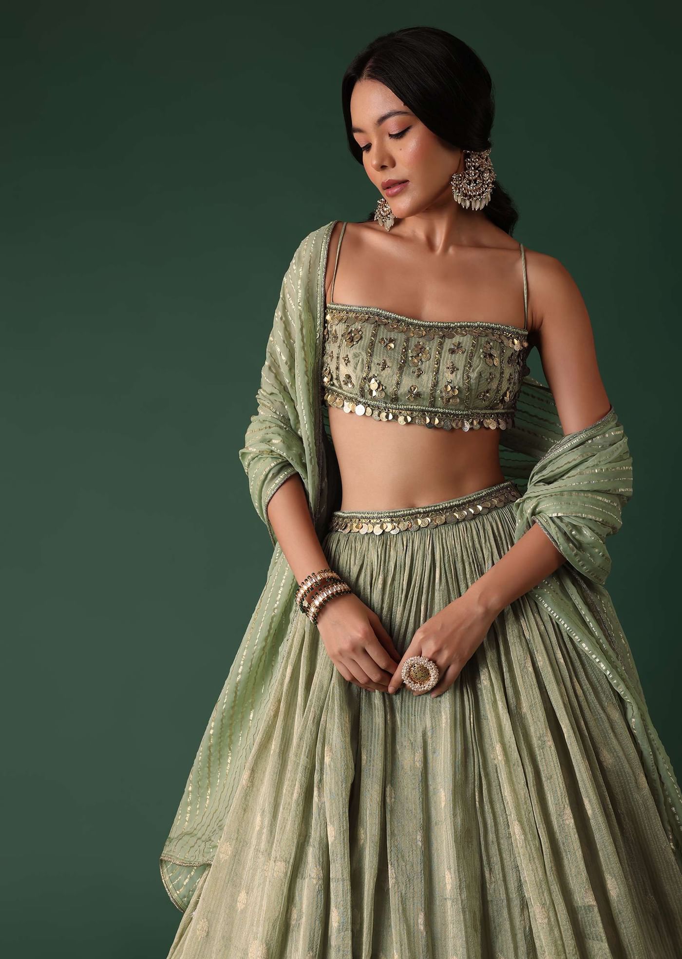 Elevate your style with our luxurious pale olive green lehenga and blouse set in Banarasi silk.The intricate coin work embroidery adds a touch of vintage allure creating a mesmerizing play... More Product Details