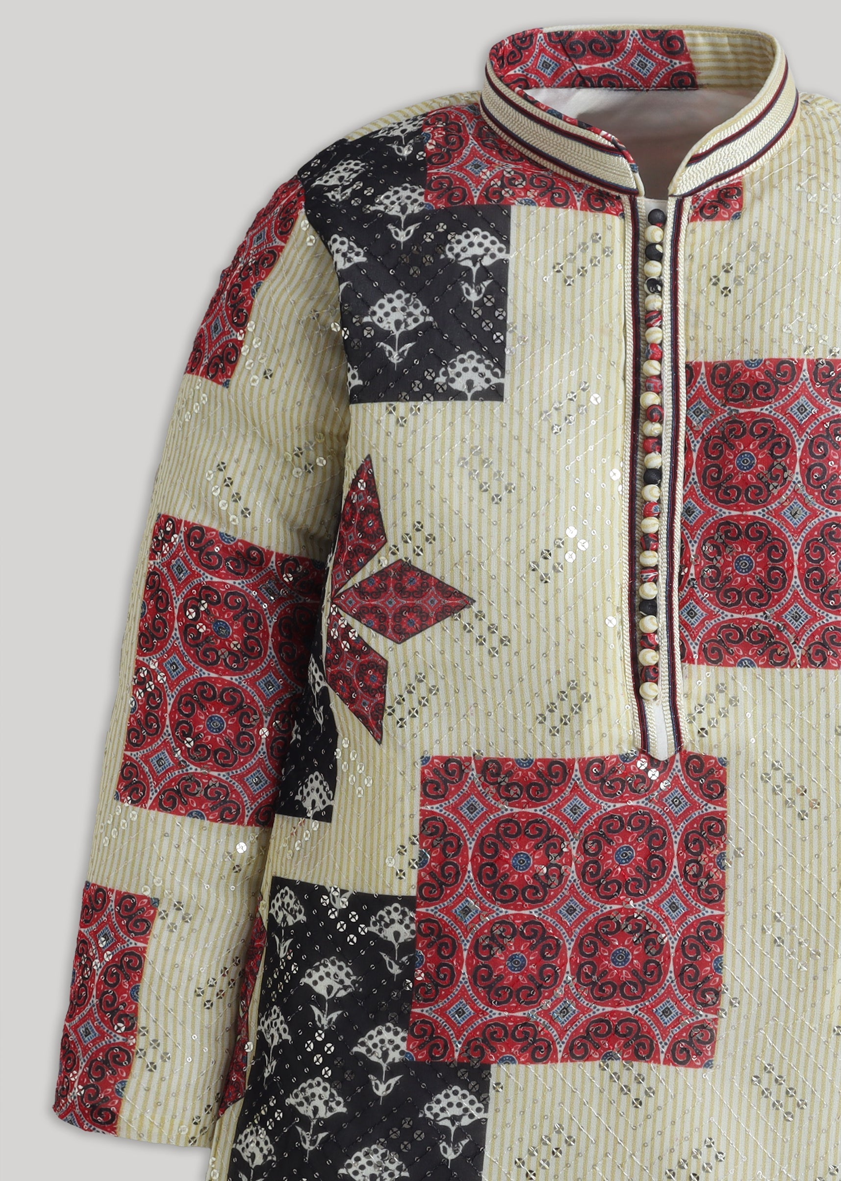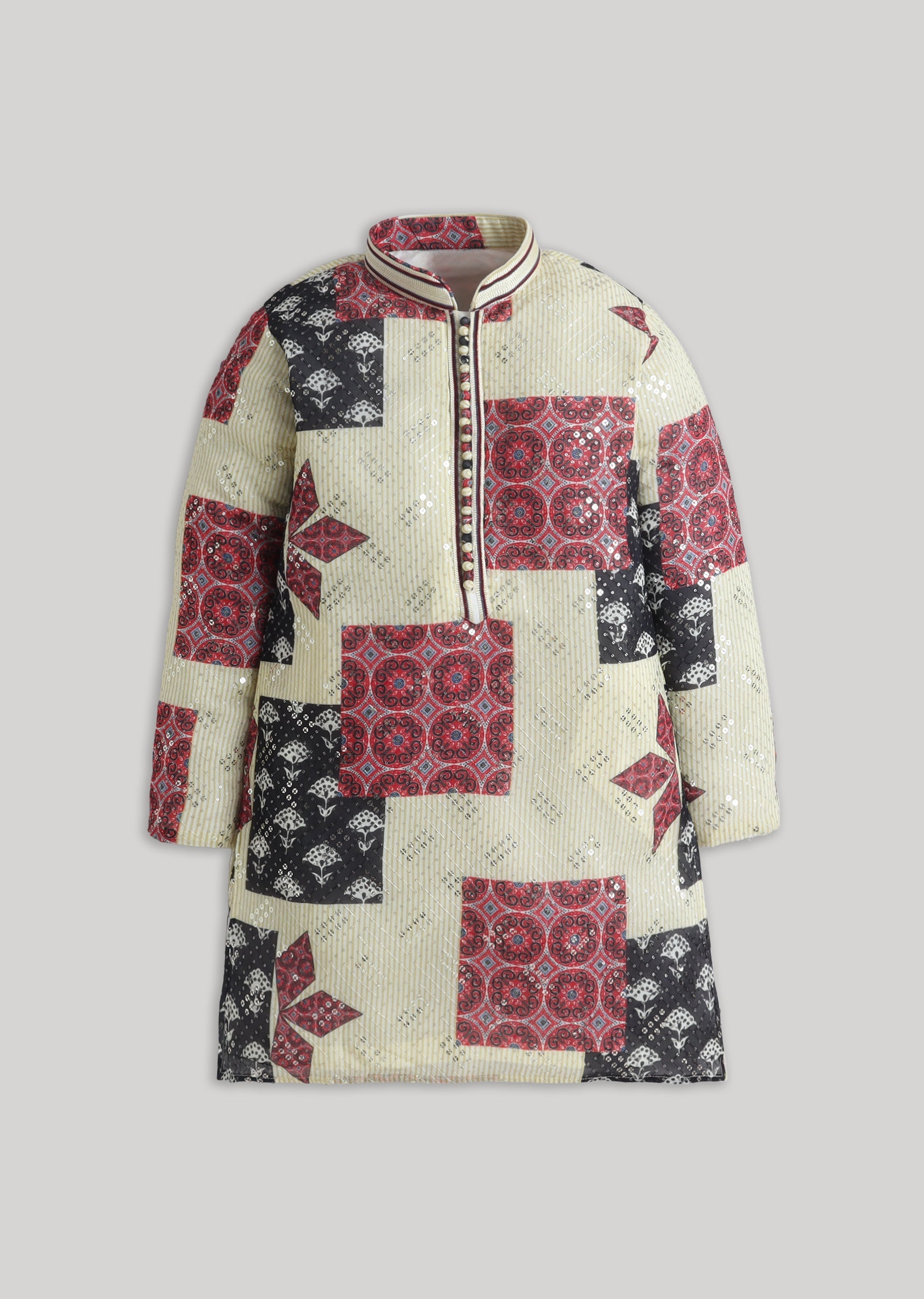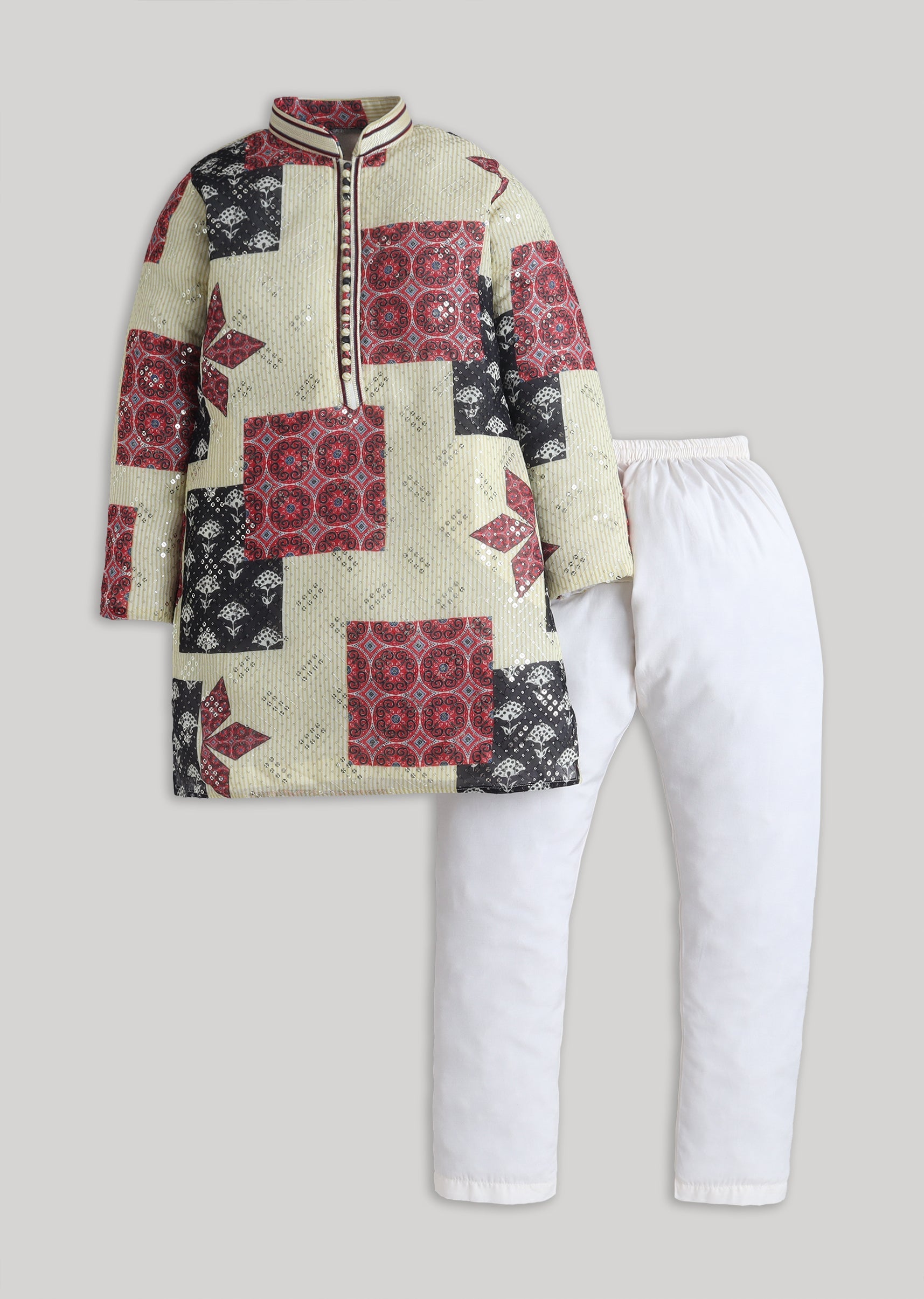 Soft pastels meet festive sparkle in this cotton kurta set featuring an abstract look with sequin accents. Finished with a mandarin collar, full sleeves and a front-button placket, it includes a matching bottomperfect for poojas, festive mornings, and family functions. Awarded as the Most Trusted Brand, we're delivering styles you love, just as promised.