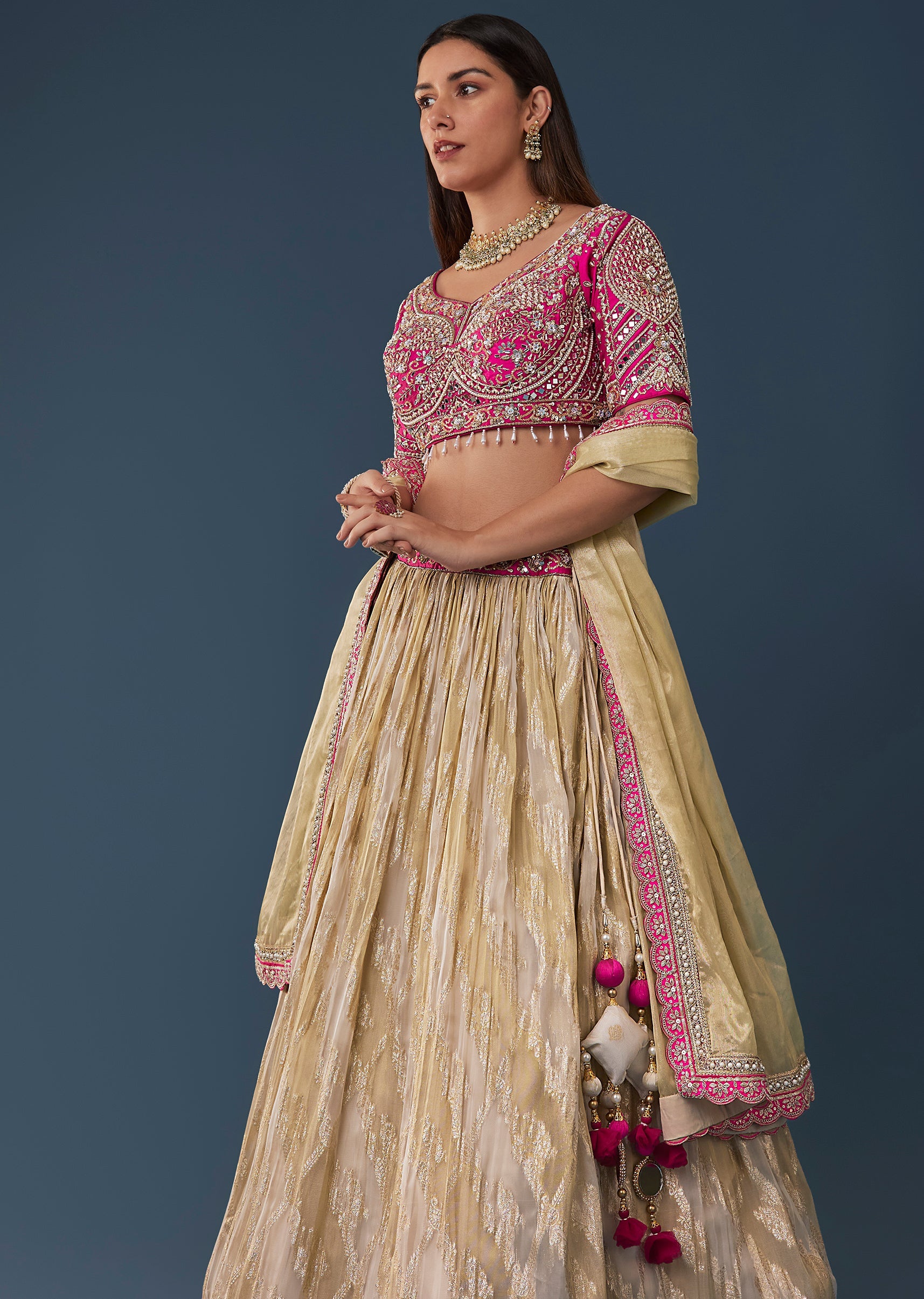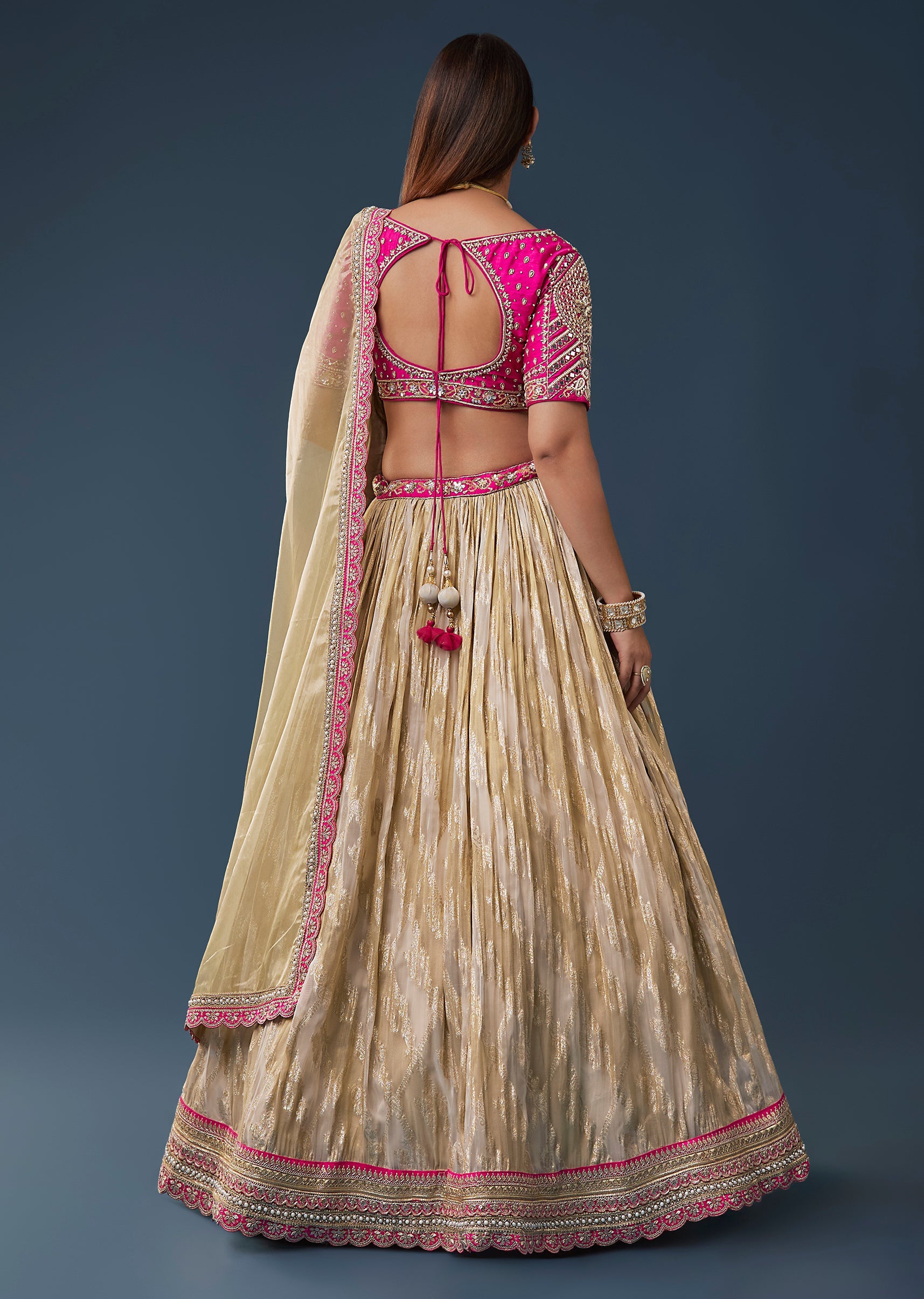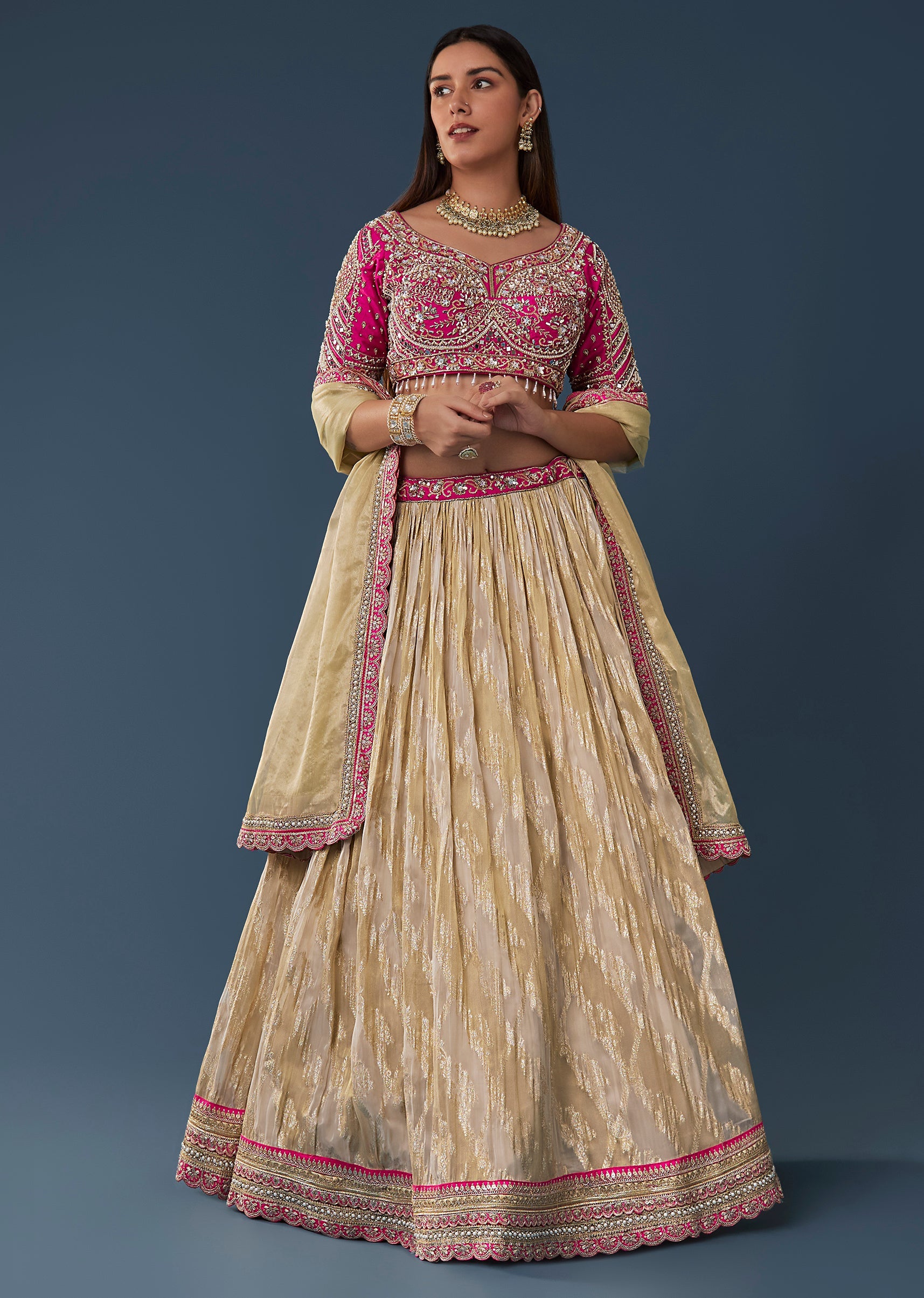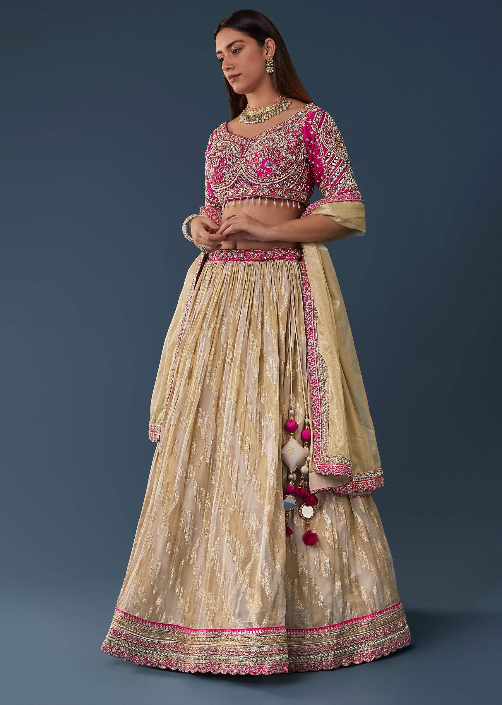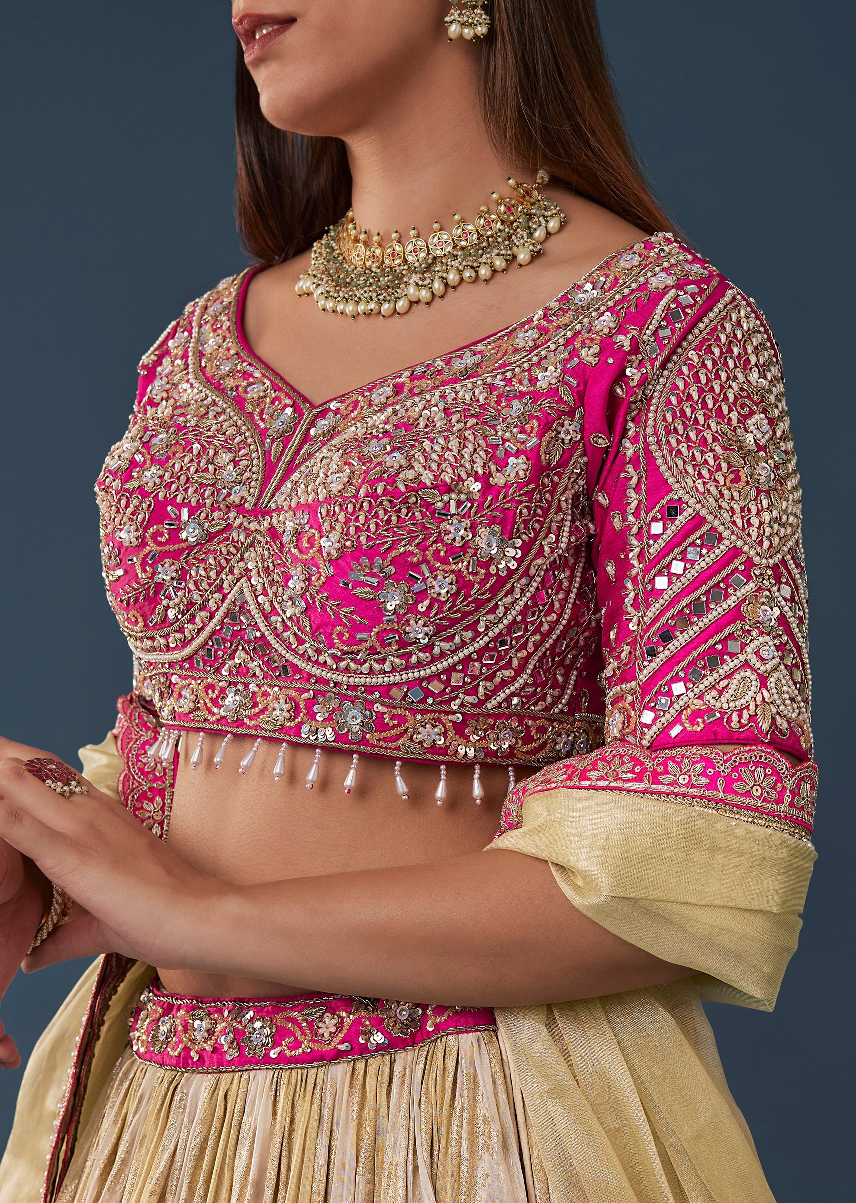Pastel Beige Pink Mirror Work Lehenga Set With V Neck Half Sleeve And Choli