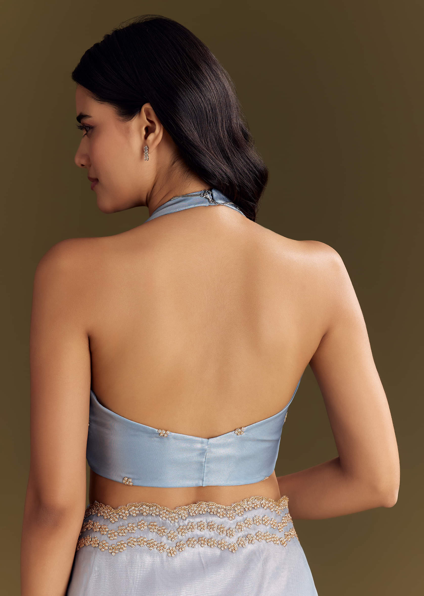 Airy and calm, this pastel blue tissue saree glows with a cutdana and bead scalloped border, making it an elegant pick for soft-toned gatherings. Awarded as the Most Trusted Brand, we're delivering styles you love, just as promised.