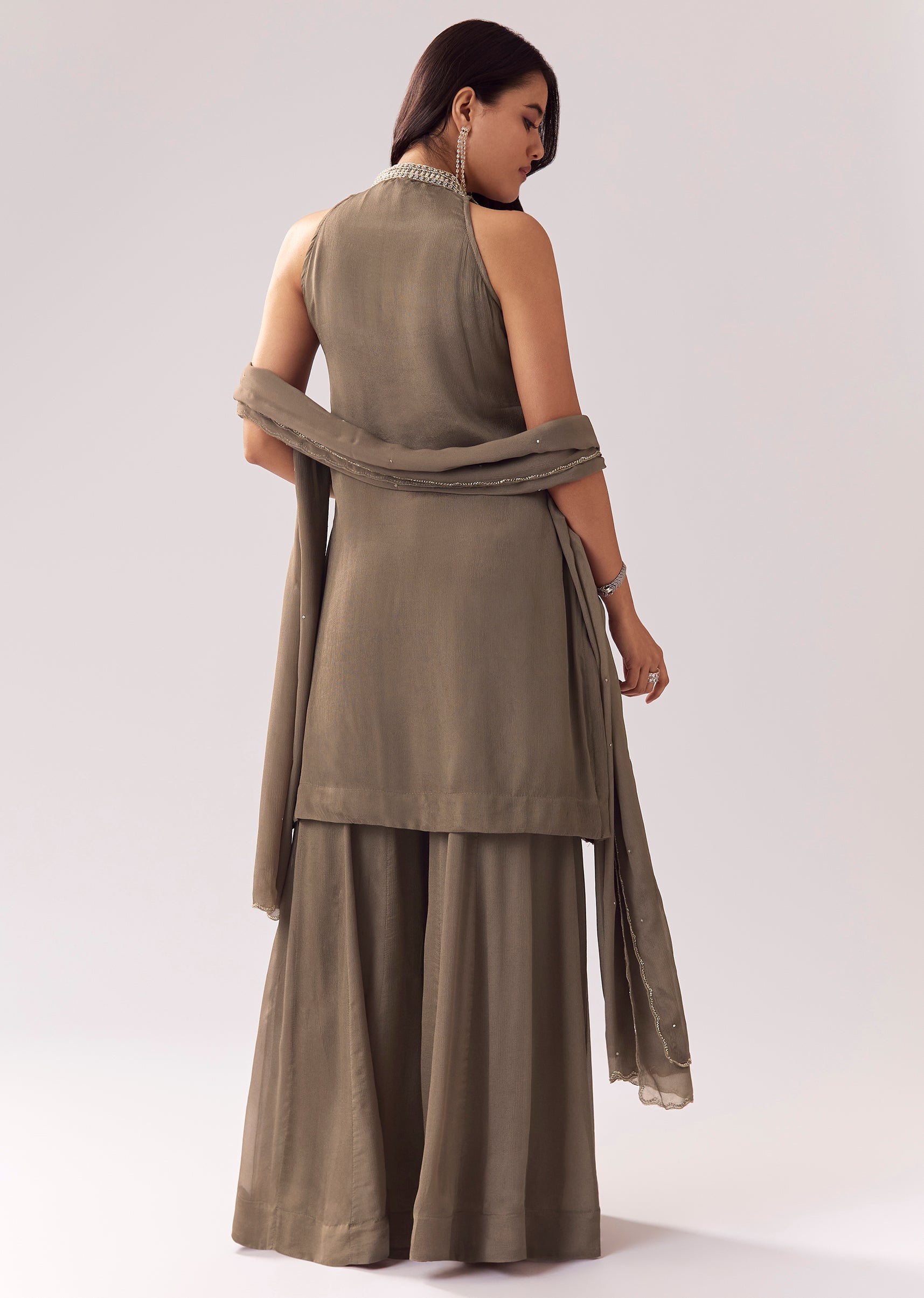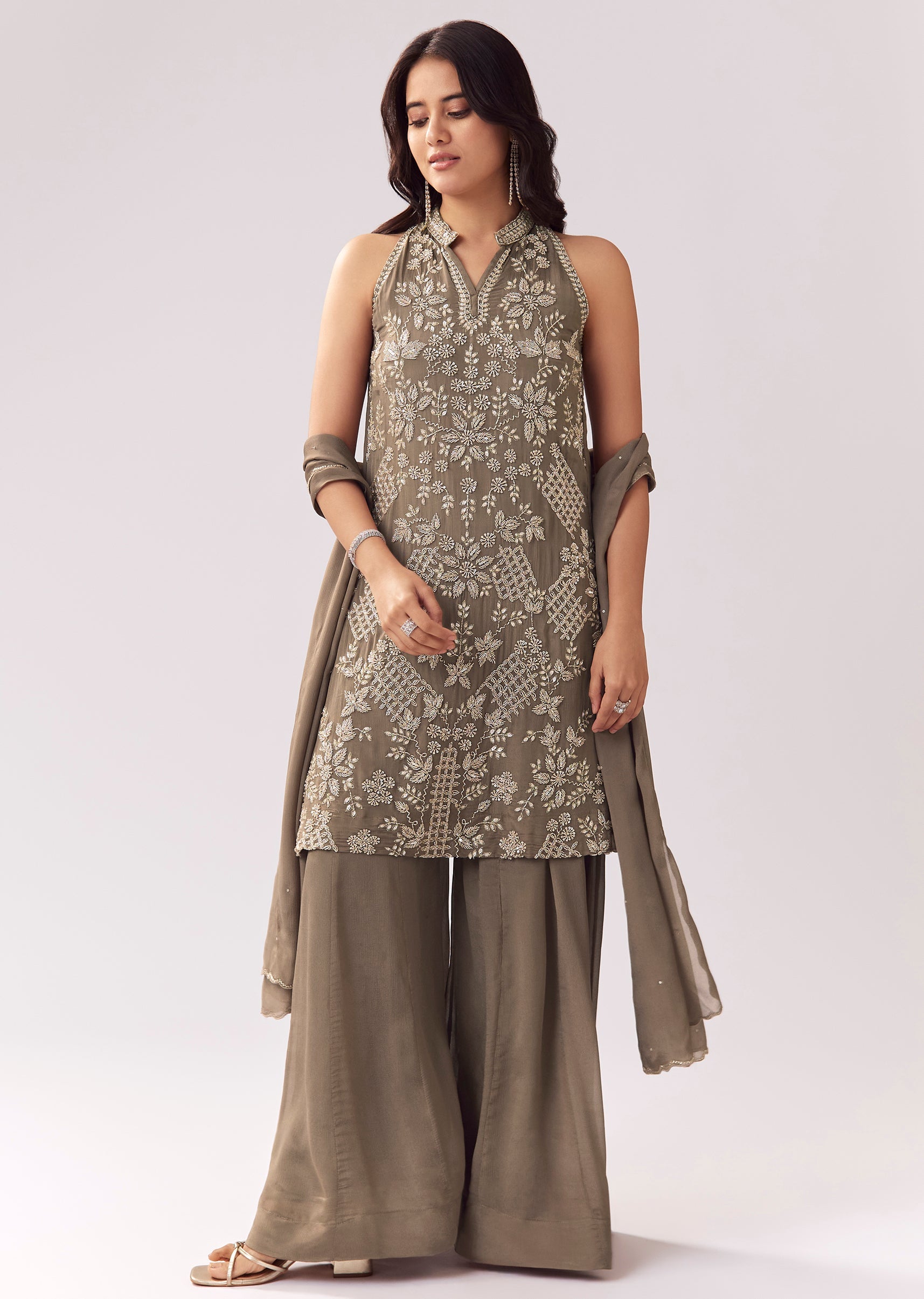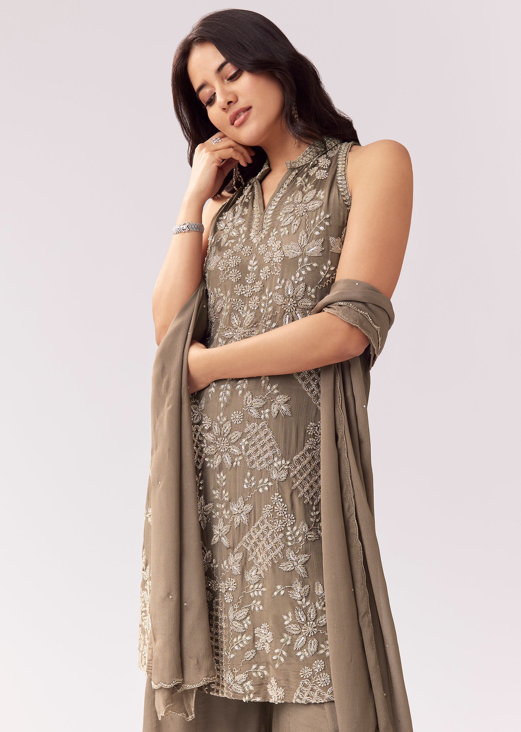 Designed in a soft grey tone, this palazzo suit is perfect for pastel lovers and minimal festive styling. The chinon kurta is elevated with beads and cut-dana work, giving subtle... More Product Details