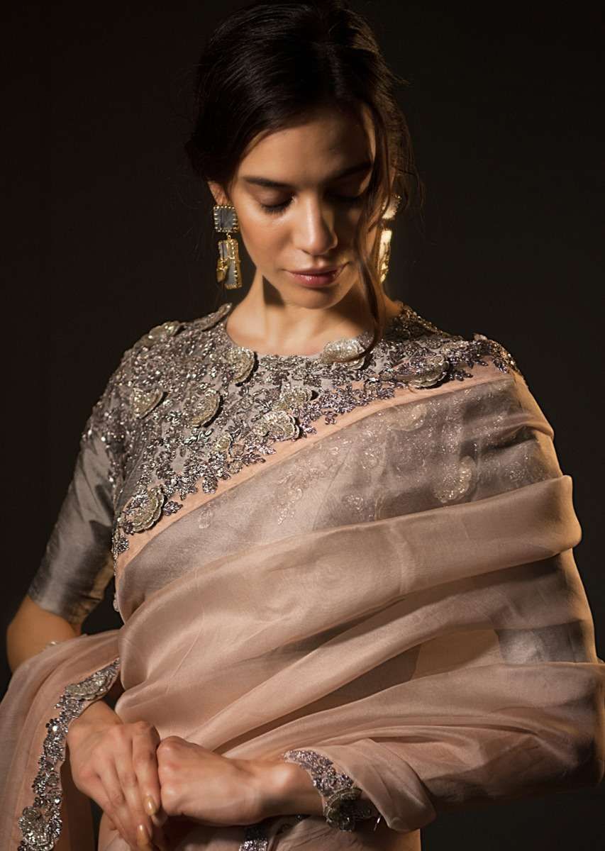 Pastel peach organza saree with silver embroidery and butti.Enhanced with zardosi , sequins, moti and cut dana applique flower.Paired with a contrasting grey high neck raw silk blouse.Embellished with zardosi , sequins, moti and cut dana applique flower enhancing the neck and armhole.Model is wearing an outfit that's US size 0 (XS). height is 5.9, Bust - 32, Waist - 26 and Hip - 39. Awarded as the Most Trusted Brand, we're delivering styles you love, just as promised.