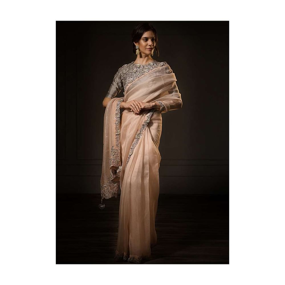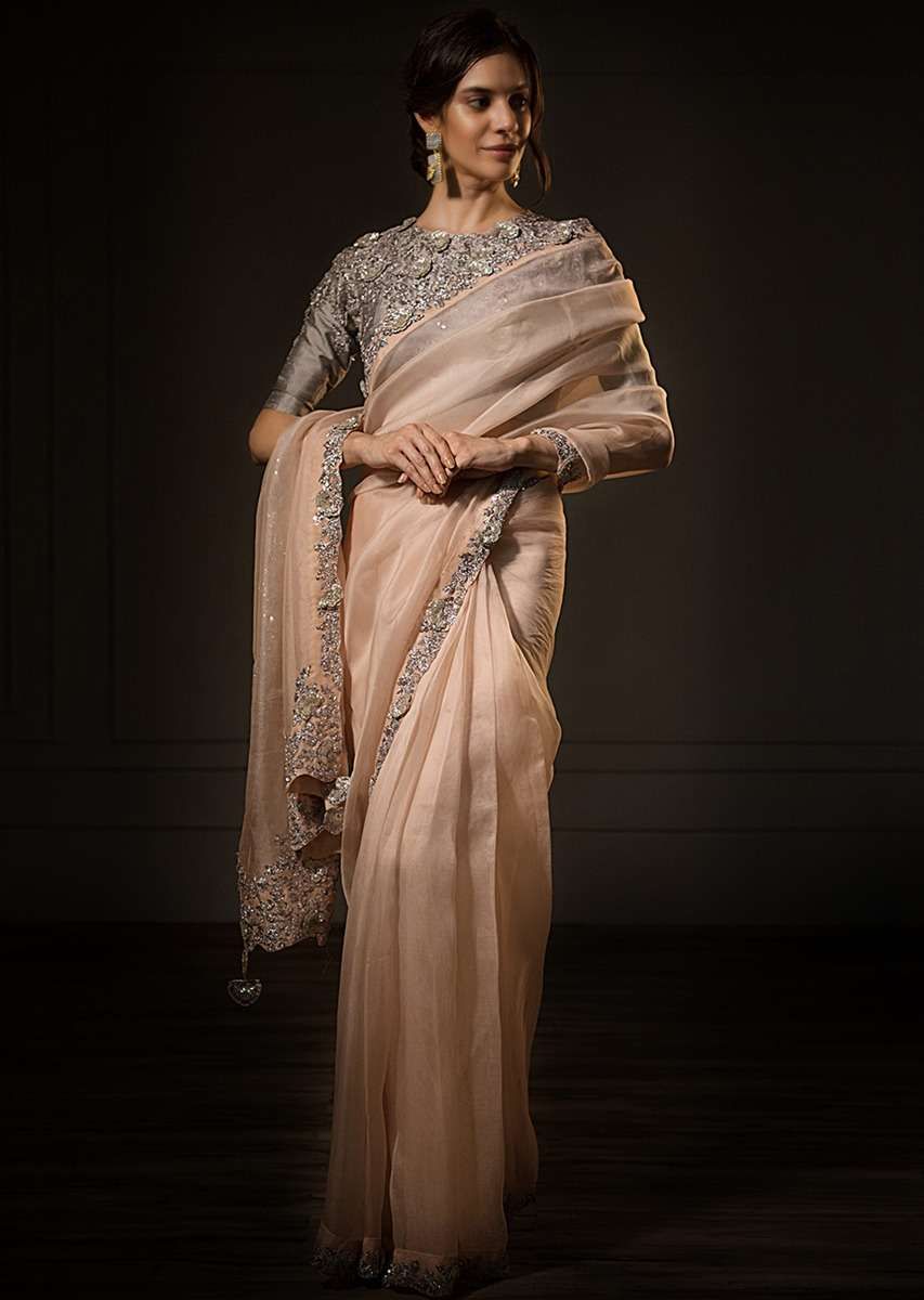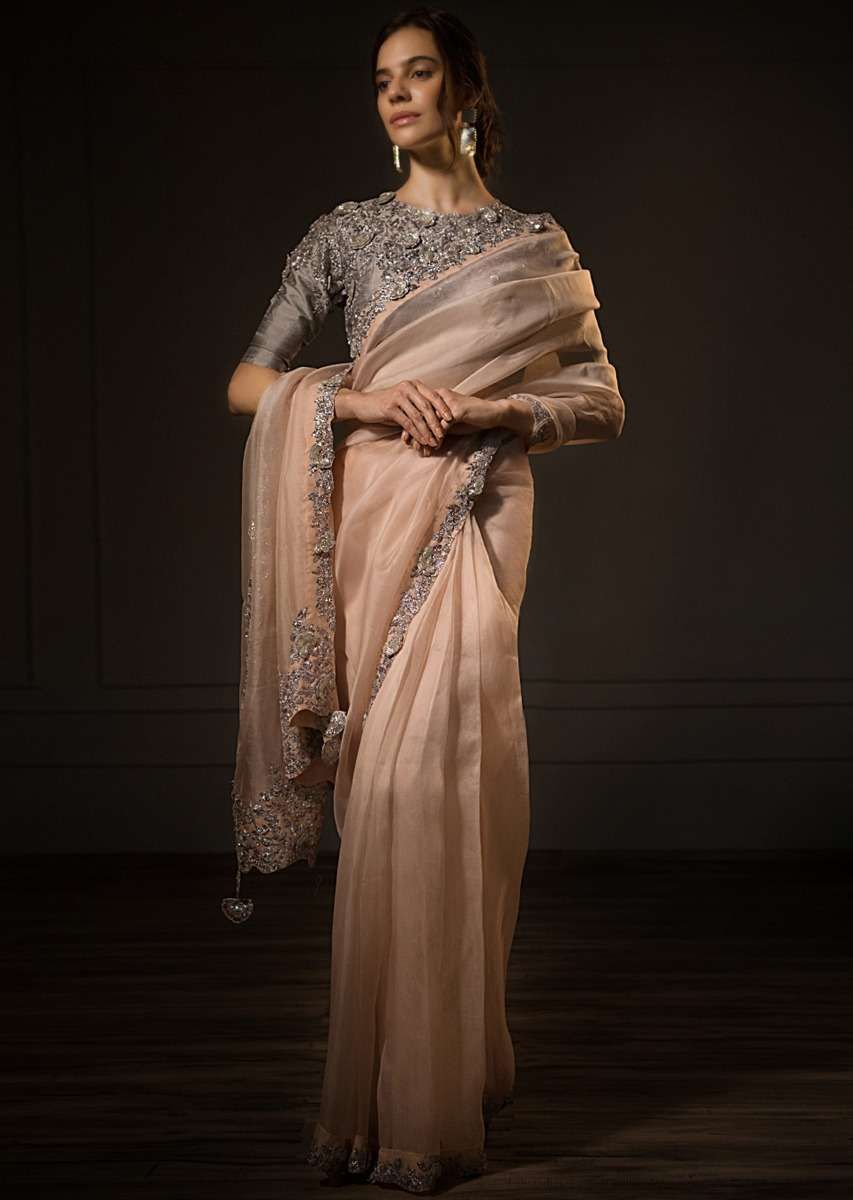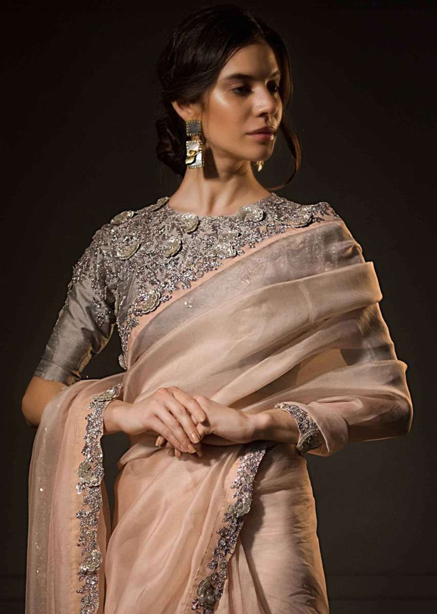 Pastel Peach Saree In Organza With Contrasting Grey Blouse Online - Kalki Fashion
