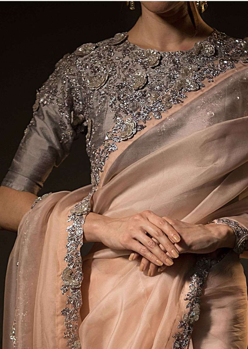 Pastel peach organza saree with silver embroidery and butti.Enhanced with zardosi , sequins, moti and cut dana applique flower.Paired with a contrasting grey high neck raw silk blouse.Embellished with zardosi... More Product Details