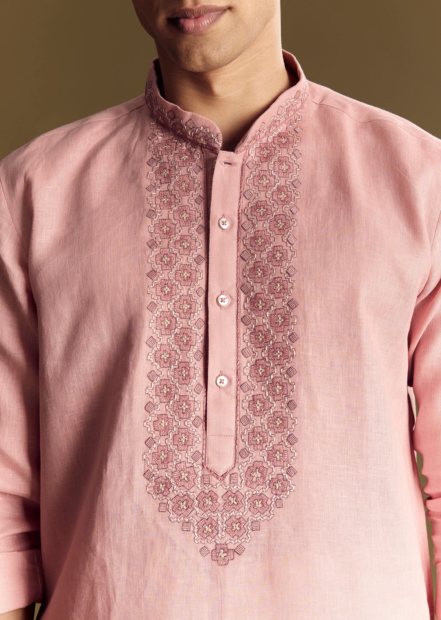 A soft pastel pink kurta set in linen fabric, designed with minimal thread embroidery and relaxed fit pants, perfect for daytime functions and intimate gatherings. Awarded as the Most Trusted... More Product Details