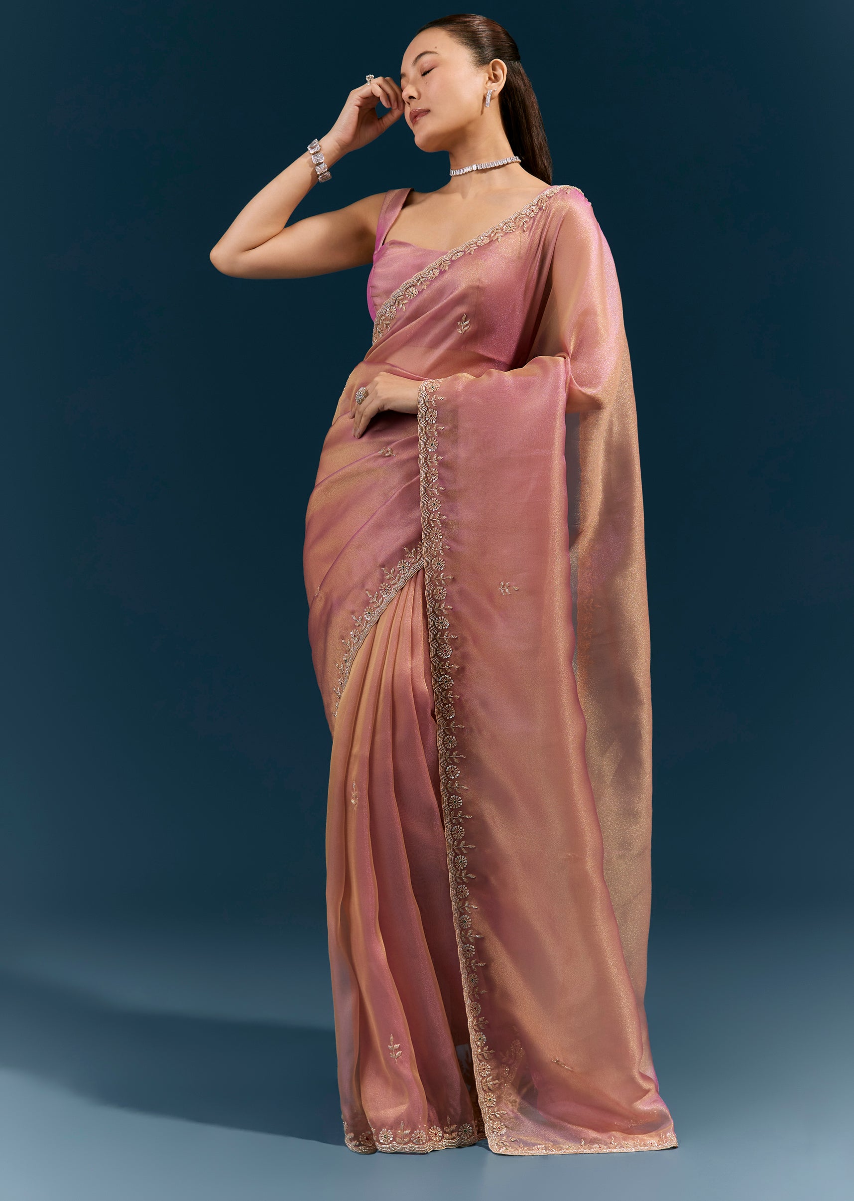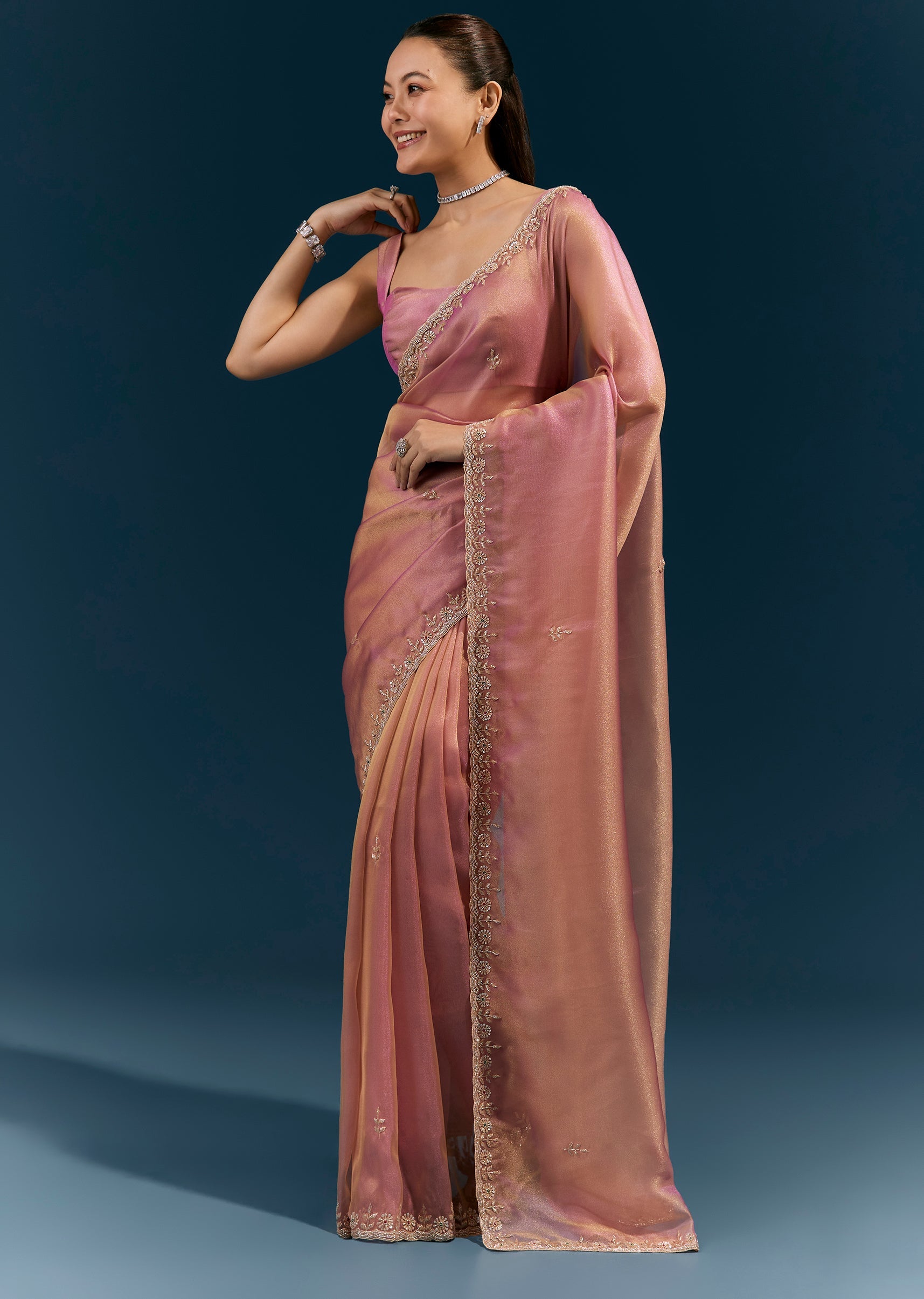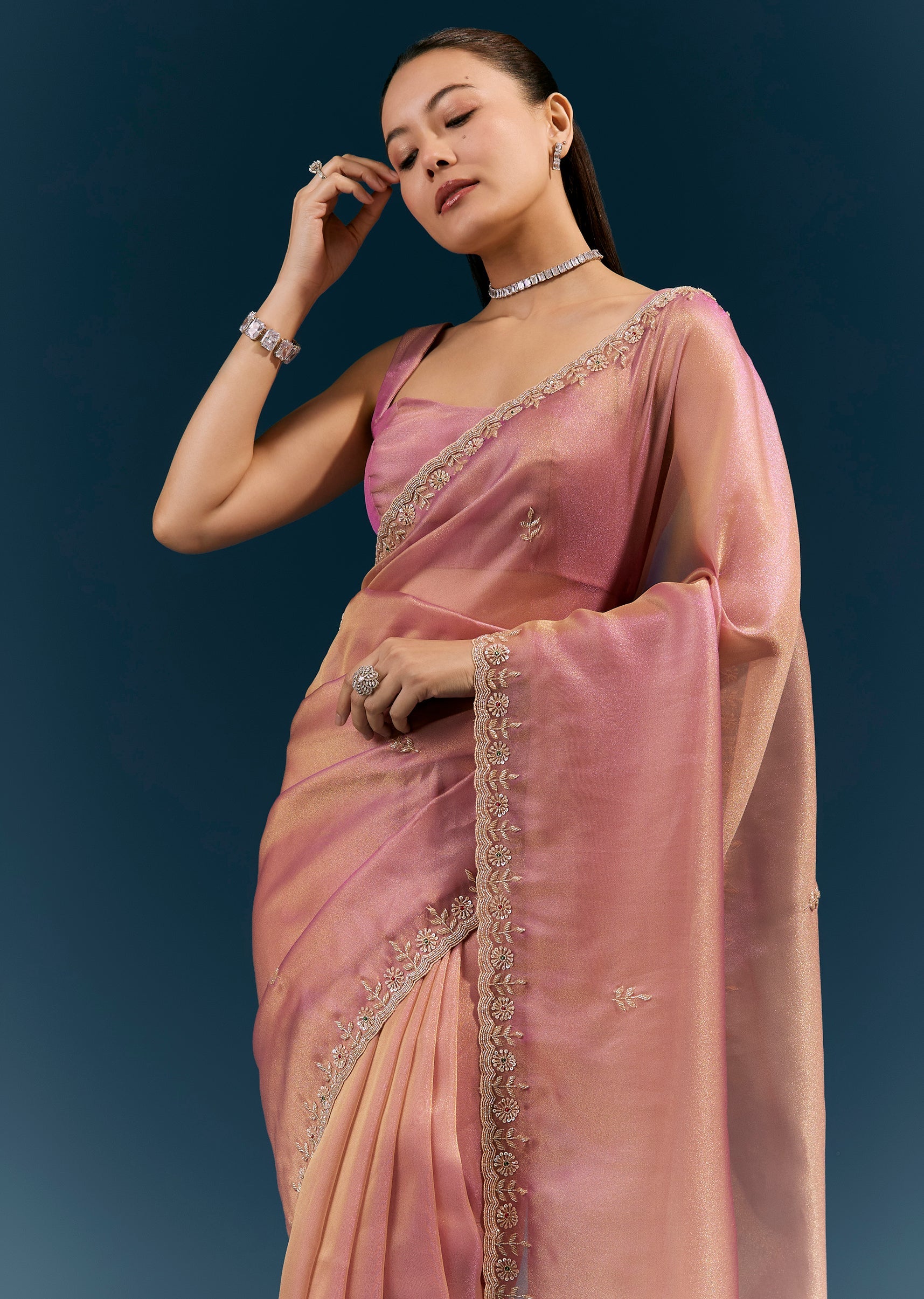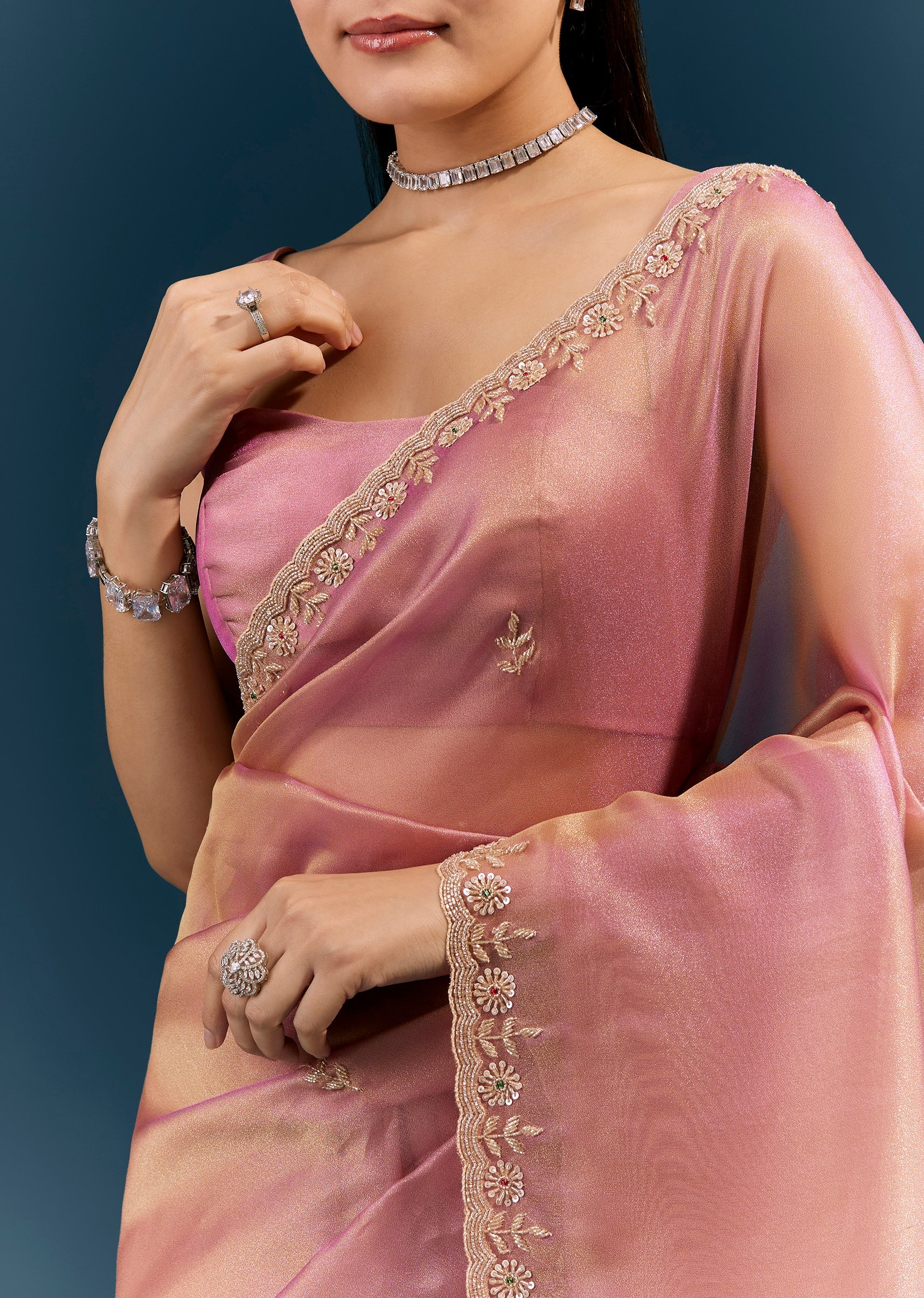Pastel Pink Tissue Saree With Scallop Border Cutda Work And Stone Highlights