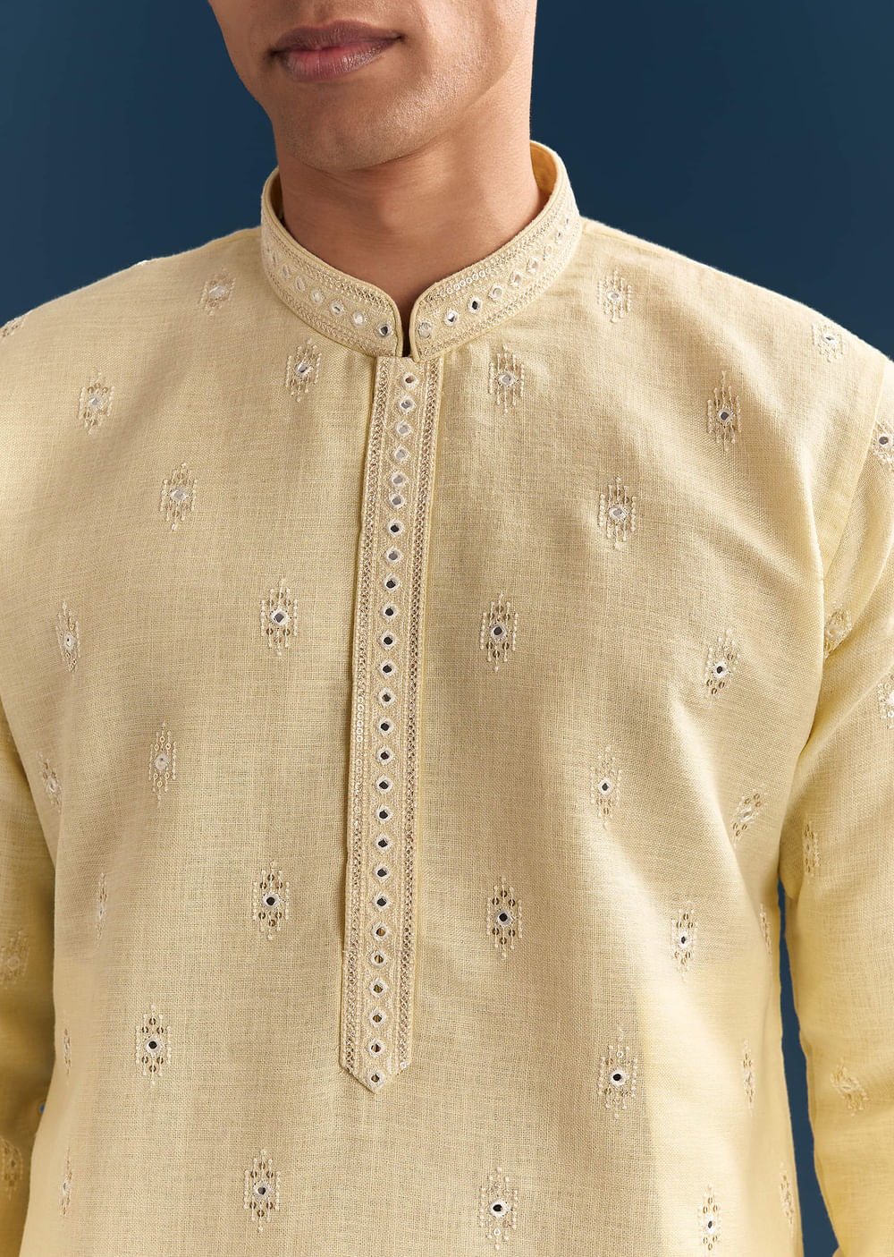 Pastel Yellow Silk Kurta Set For Men With Mirror Work