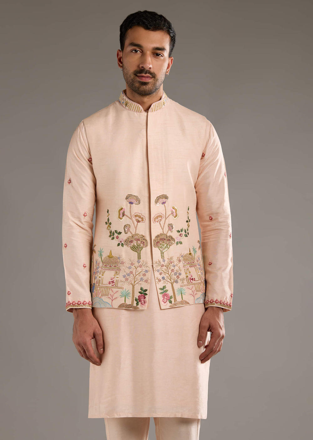 Peach Banarasi Silk Kurta Jacket Set For Men With Heavy Hand Embroidery