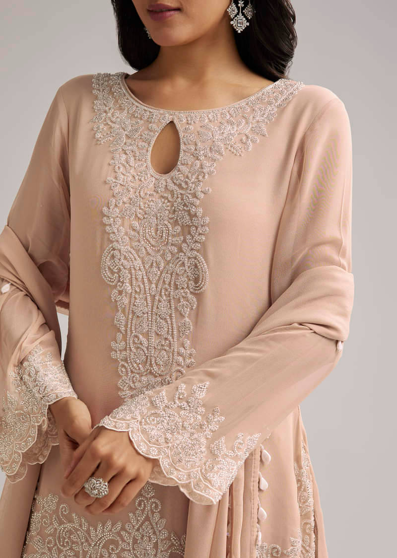 Peach Beaded Kurti Pant Set With Dupatta