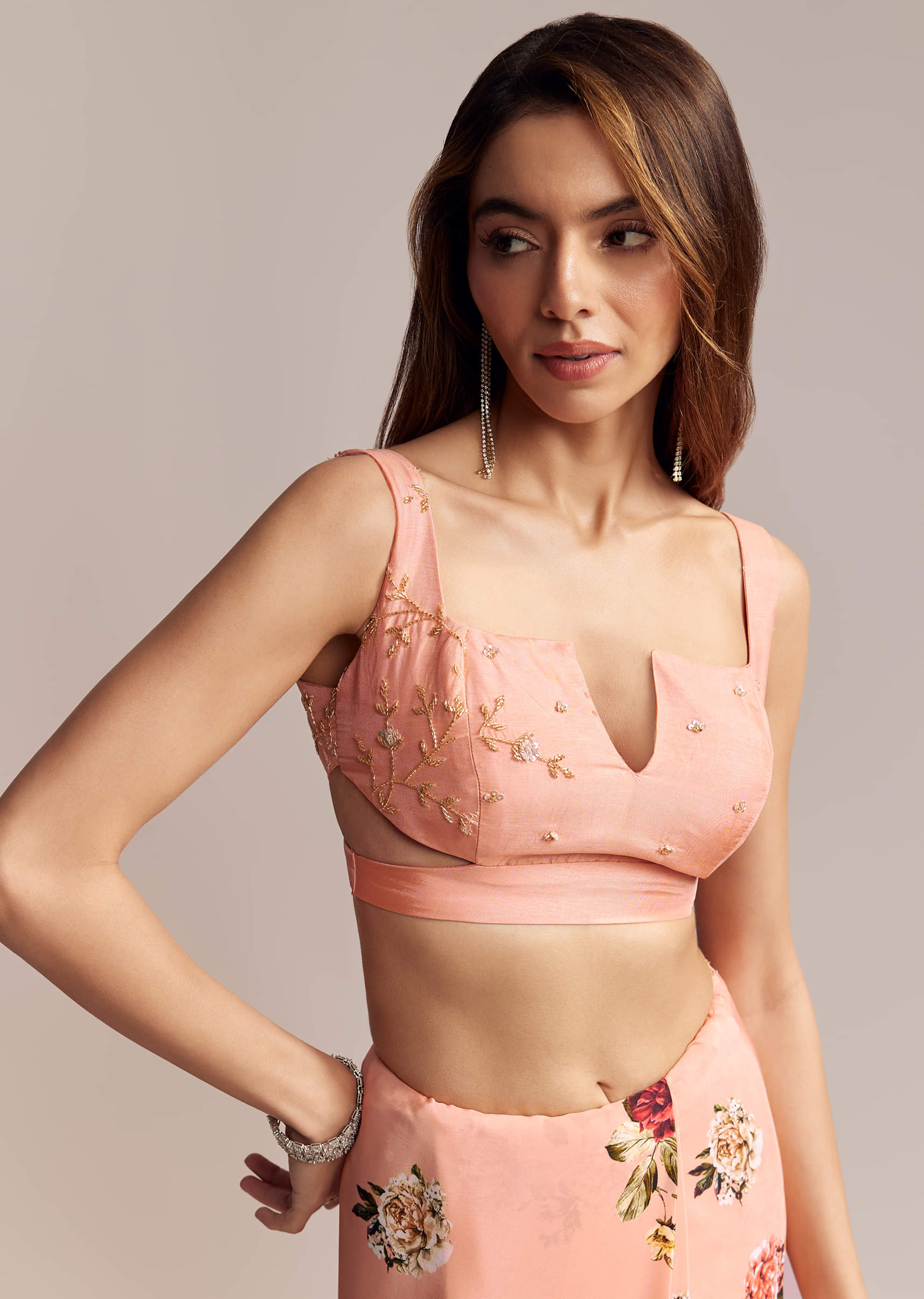 A soft peach crepe canvas blooms with delicate floral digital prints, while its scalloped edges and sequin-cutdana blouse add a touch of sparkle without overpowering the look. This saree has... More Product Details