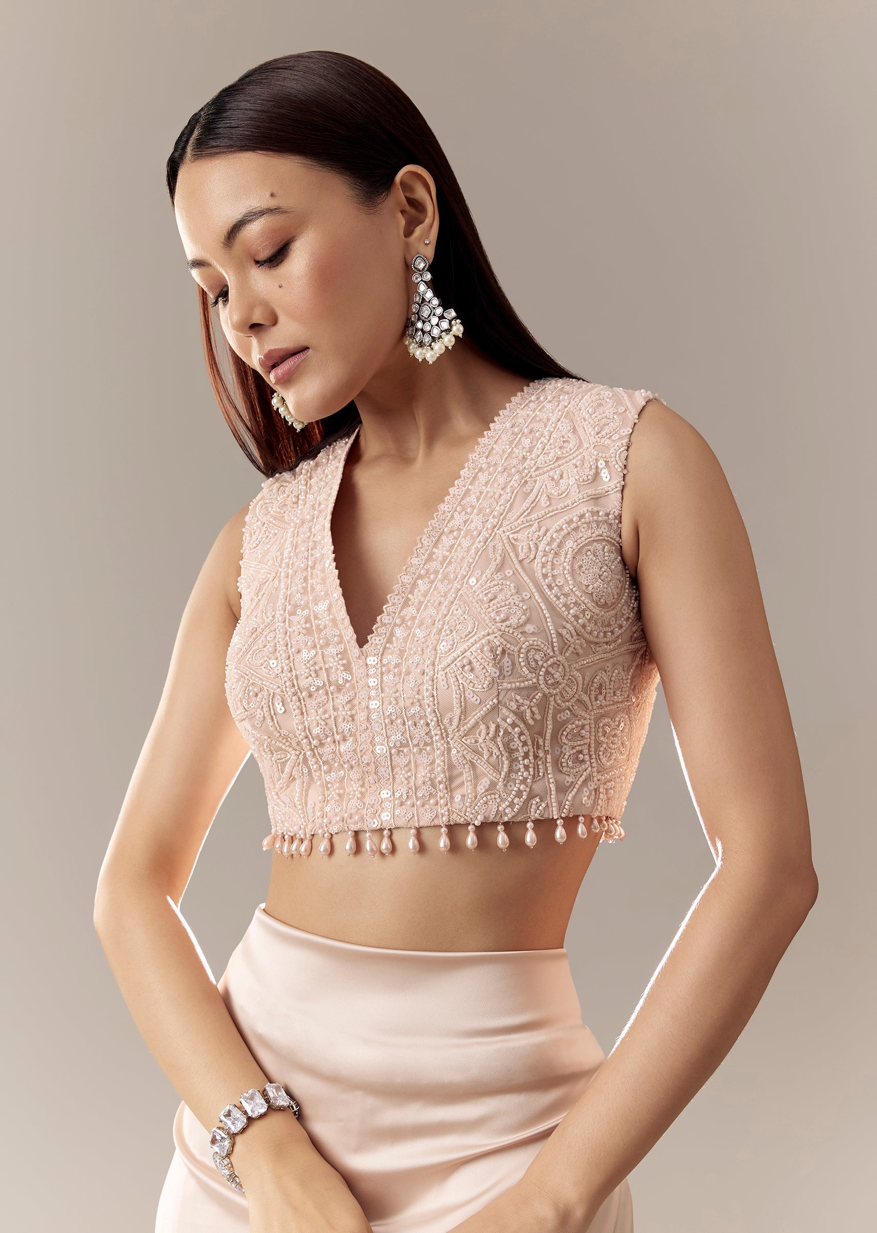 A baby-peach Milano fancy blouse with a V-neckline, cut-dana and stone highlights, tassel detail at the waist, and a side zip closure. Awarded as the Most Trusted Brand, we're delivering... More Product Details