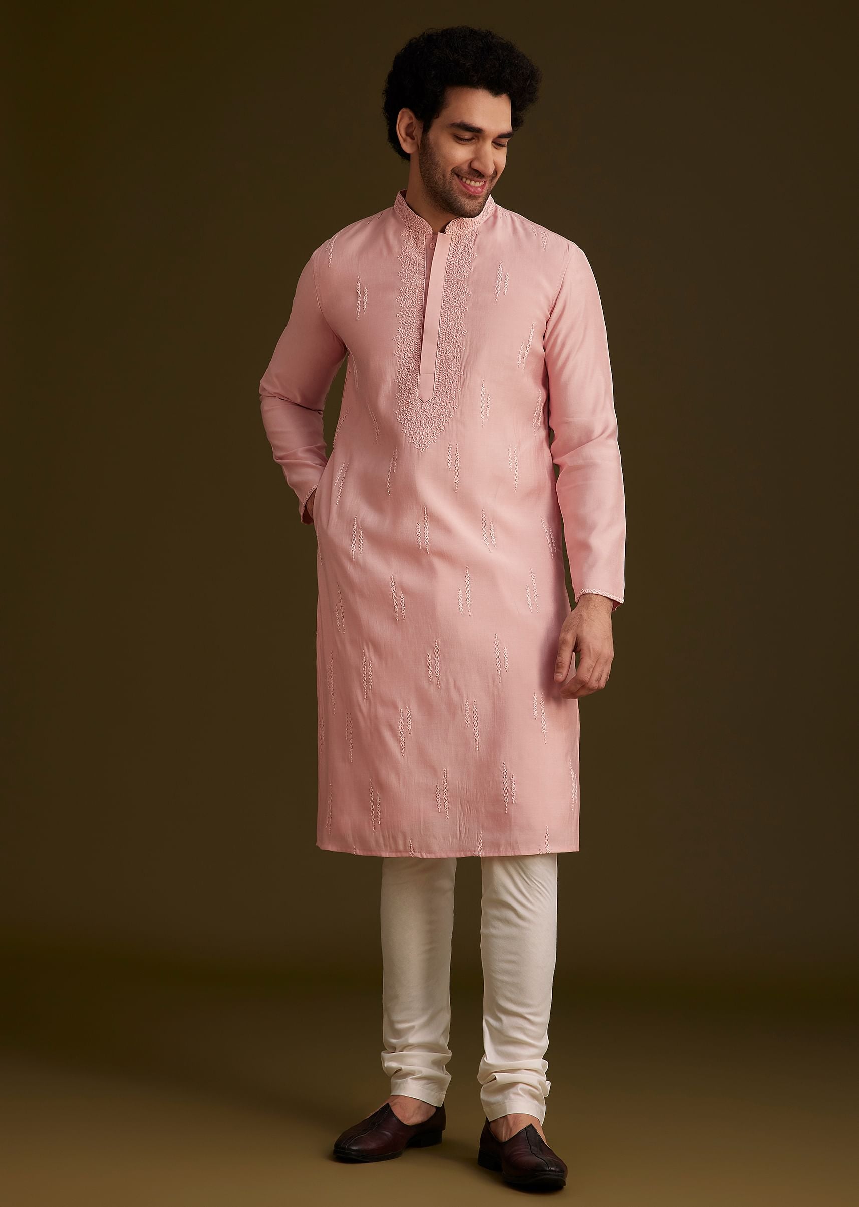 - Elevate your ethnic style with this peach kurta set, highlighted by delicate tonal embroidery that exudes refined elegance.