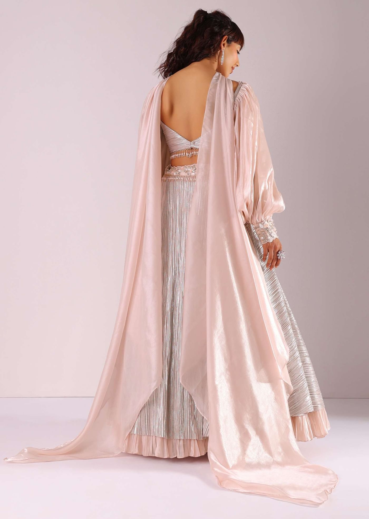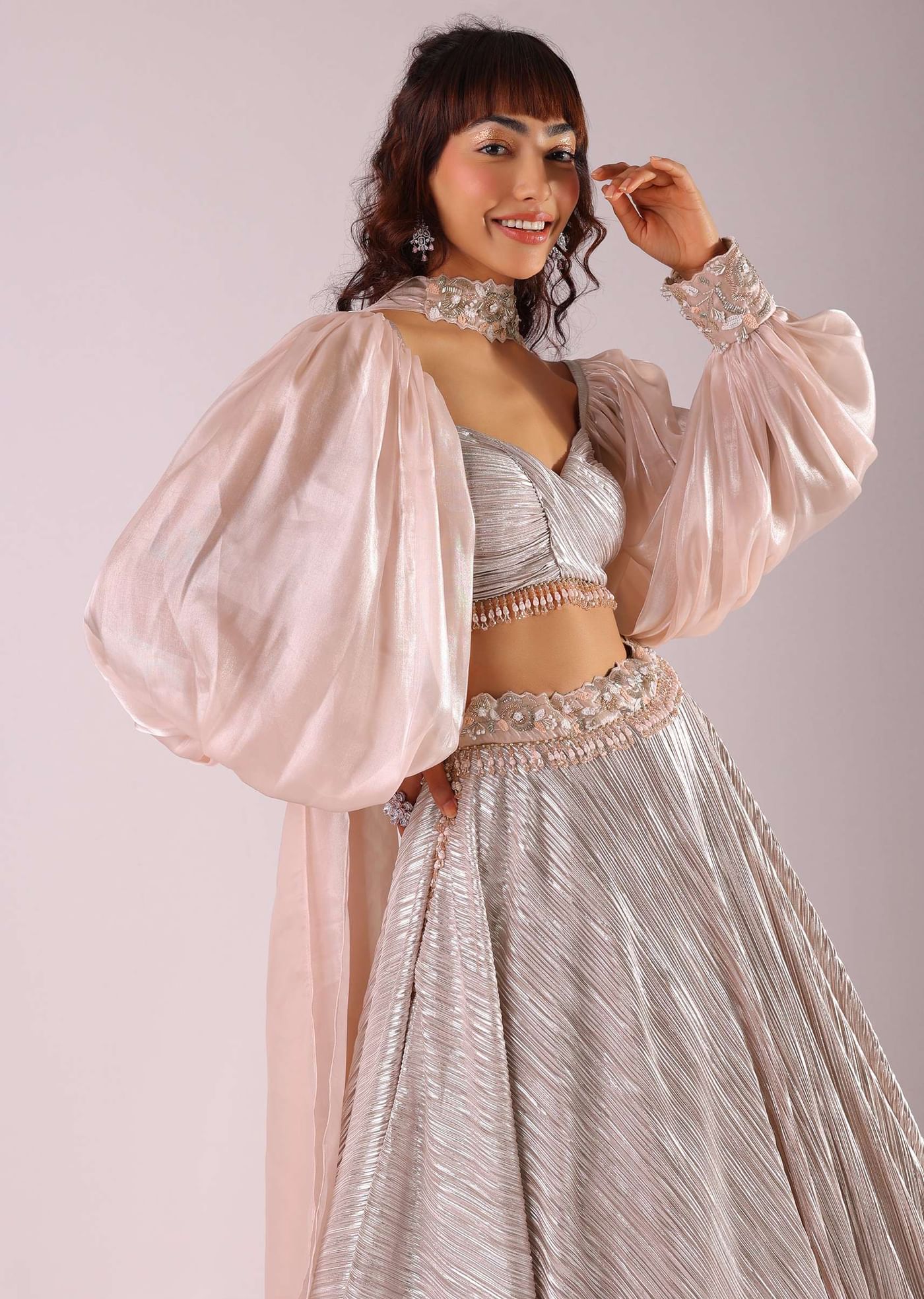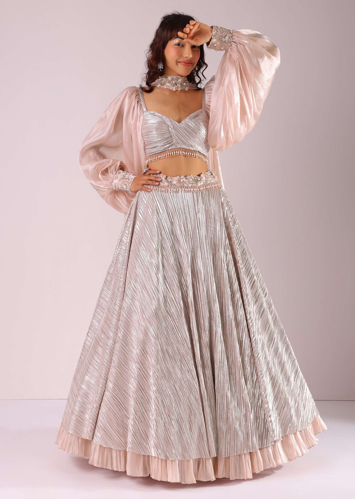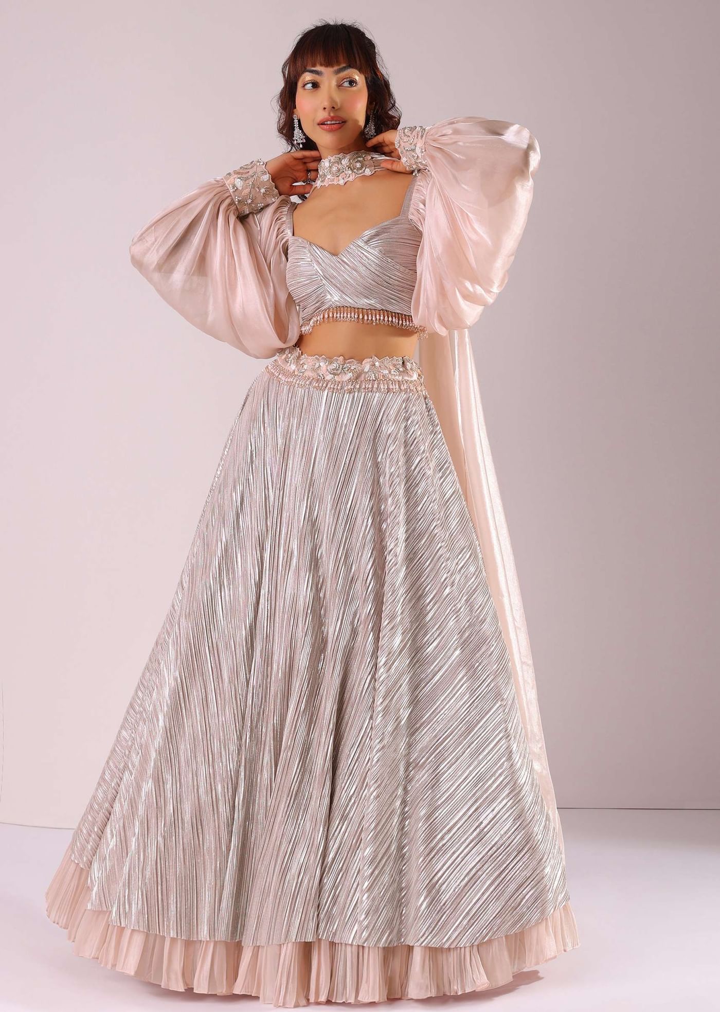 This glamourous outfit makes you feel like a celebrity with an embroidered tiered lehenga, blouse, and choker dupatta.The pleated blouse with balloon sleeves in embroidered cuffs and sweetheart neckline is... More Product Details