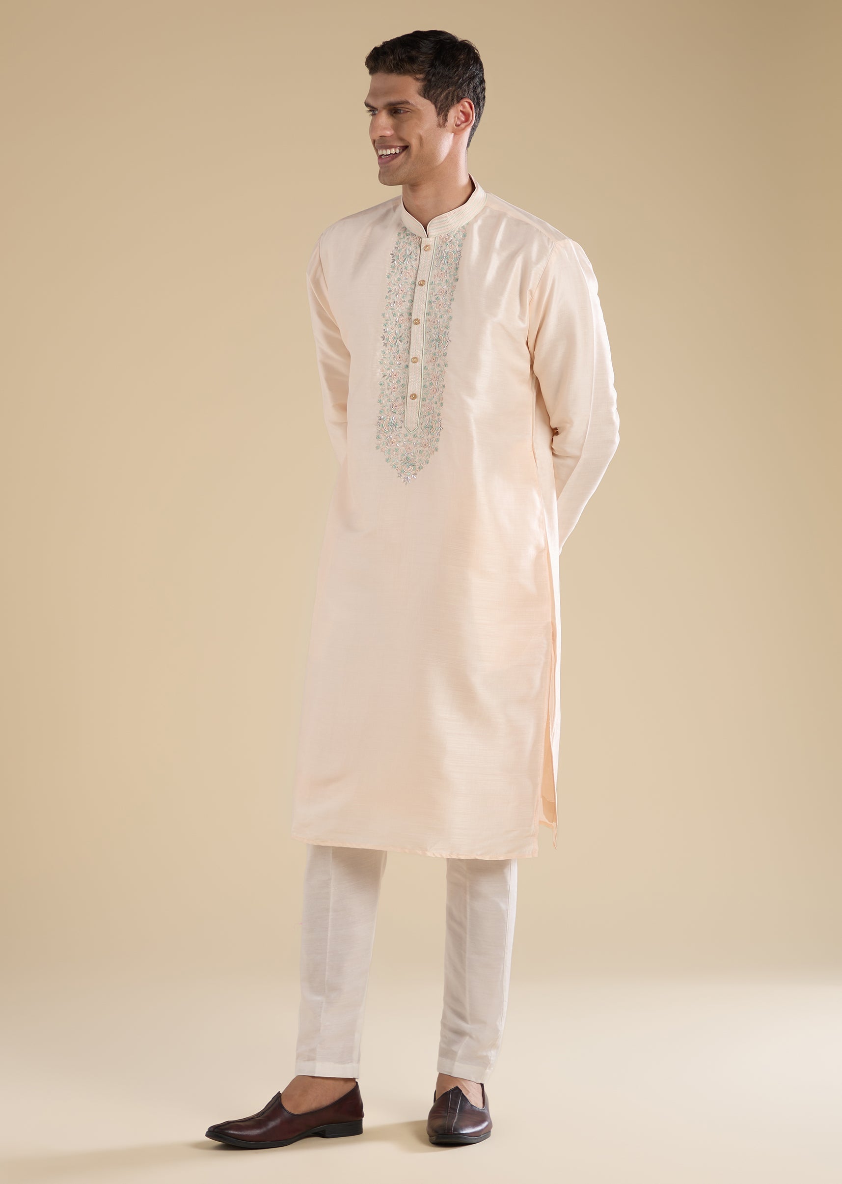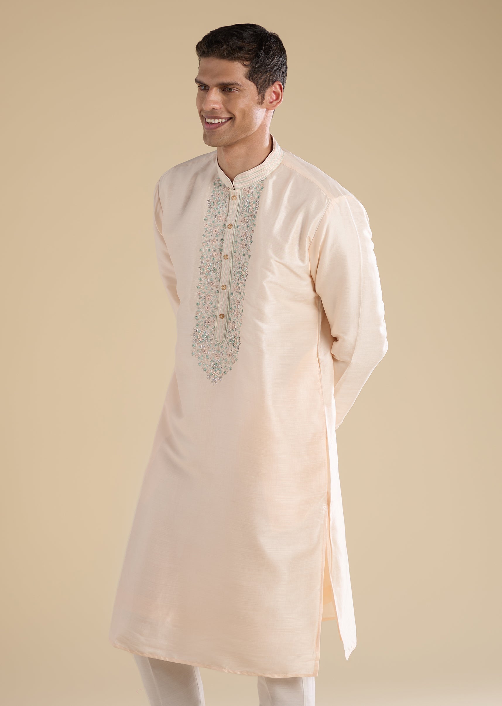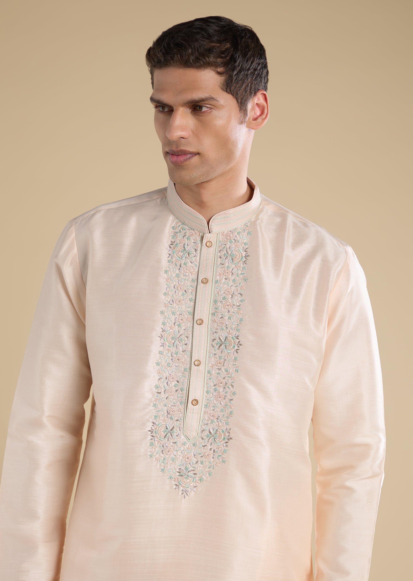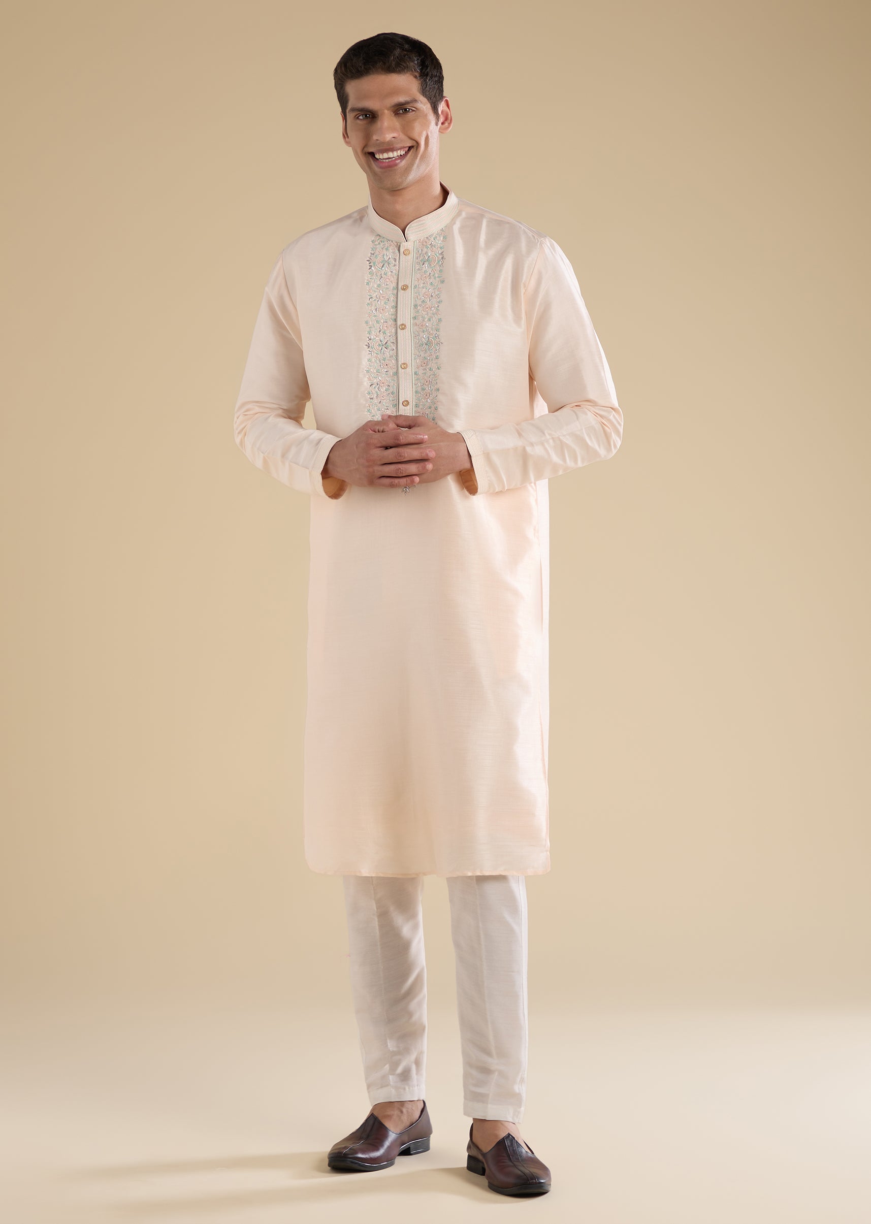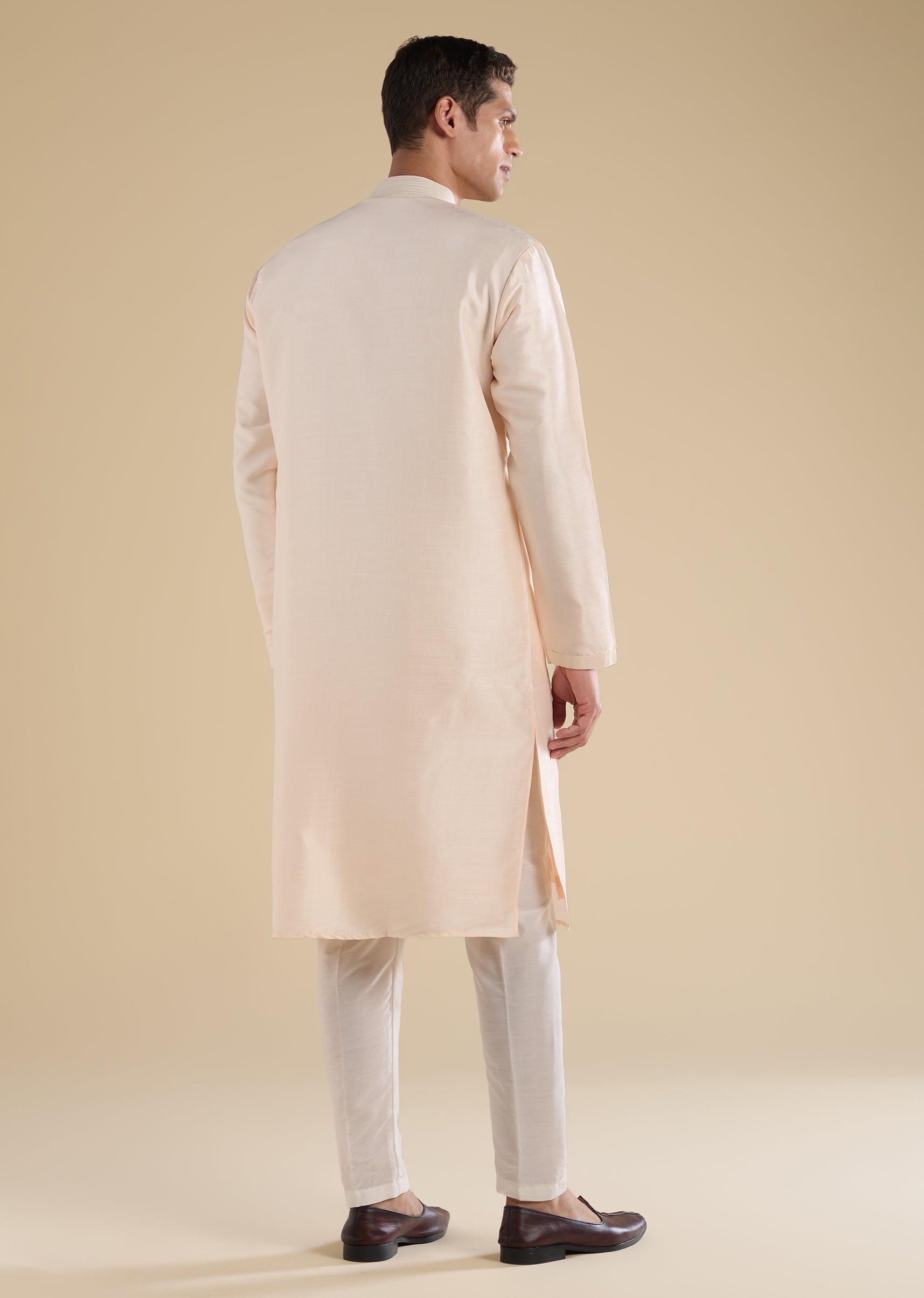 Soft and elegant with traditional charm, this peach kurta set is crafted in smooth art silk for a refined festive look. Featuring a mandarin collar, full sleeves, and subtle resham... More Product Details