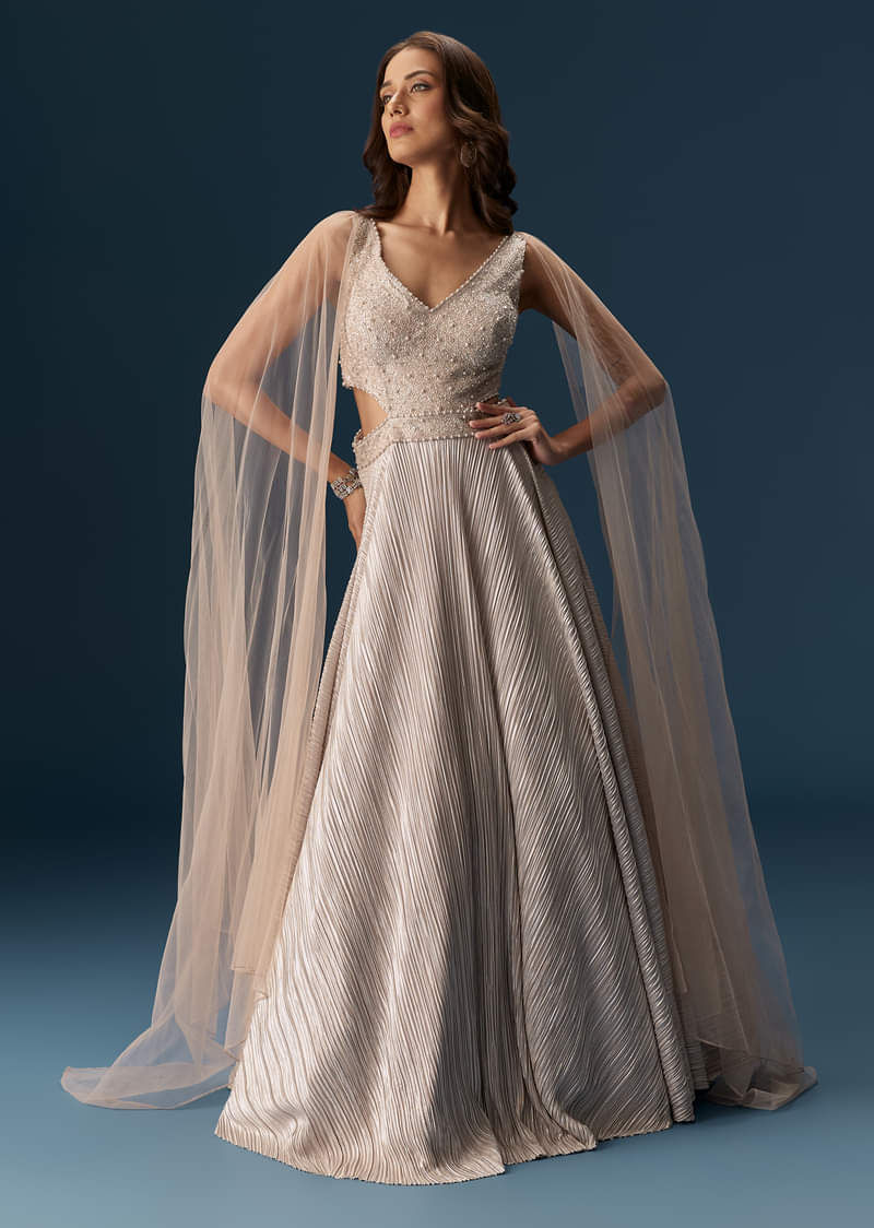 Peach Gown With Fully Embroidered Yoke And Feather Embellished Shoulders