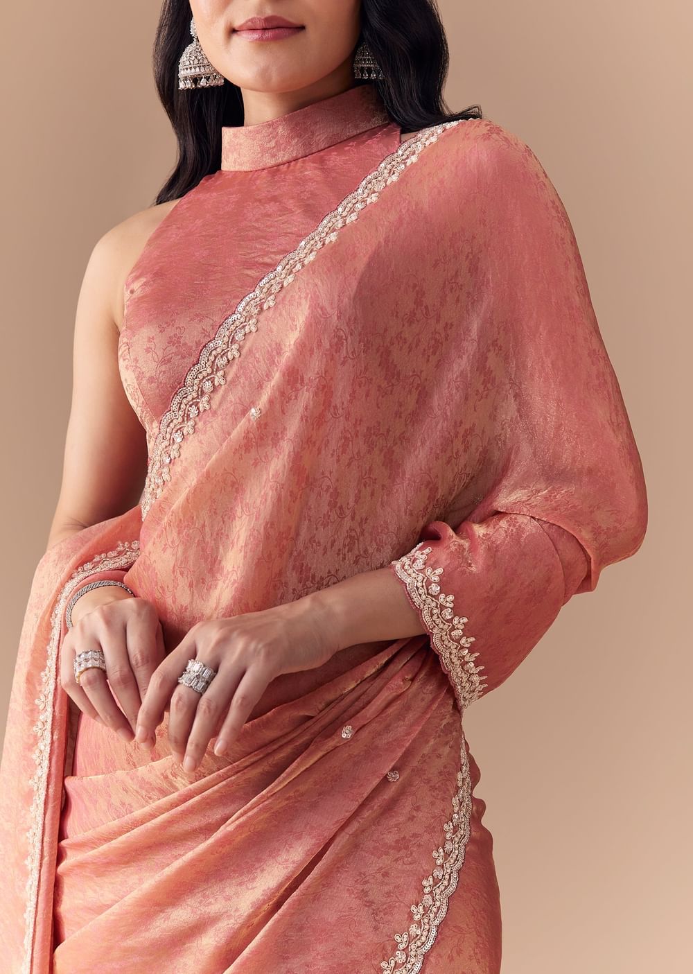 Embrace refined elegance with this peach jacquard printed tissue saree, beautifully embroidered with shimmering cutdana, sequins, and stones. The rich jacquard texture adds depth and sophistication, while the subtle peach hue lends a soft, graceful charm. Perfect for weddings, festive celebrations, or evening gatherings, this saree effortlessly combines traditional craftsmanship with modern allure. Awarded as the Most Trusted Brand, we're delivering styles you love, just as promised.