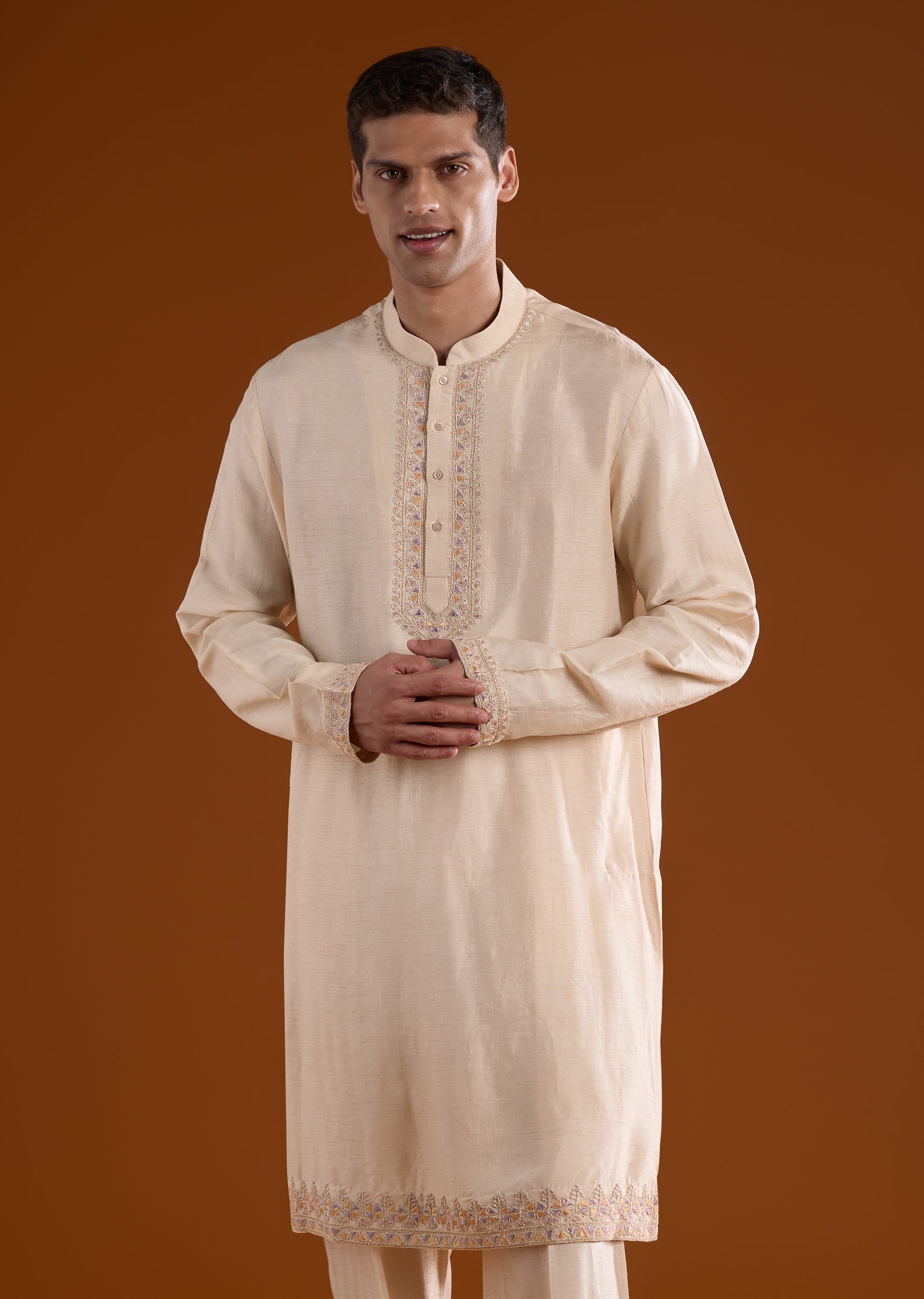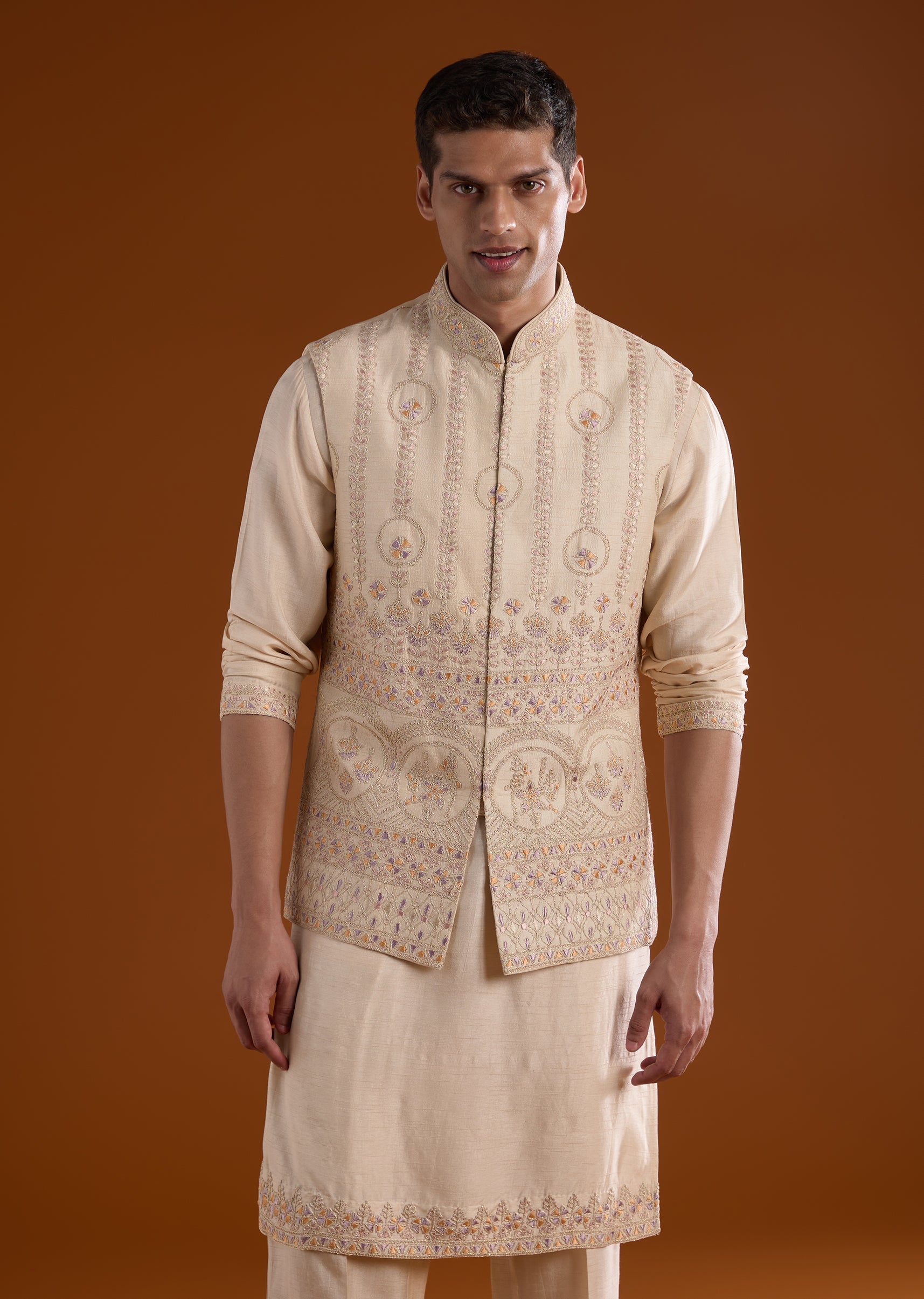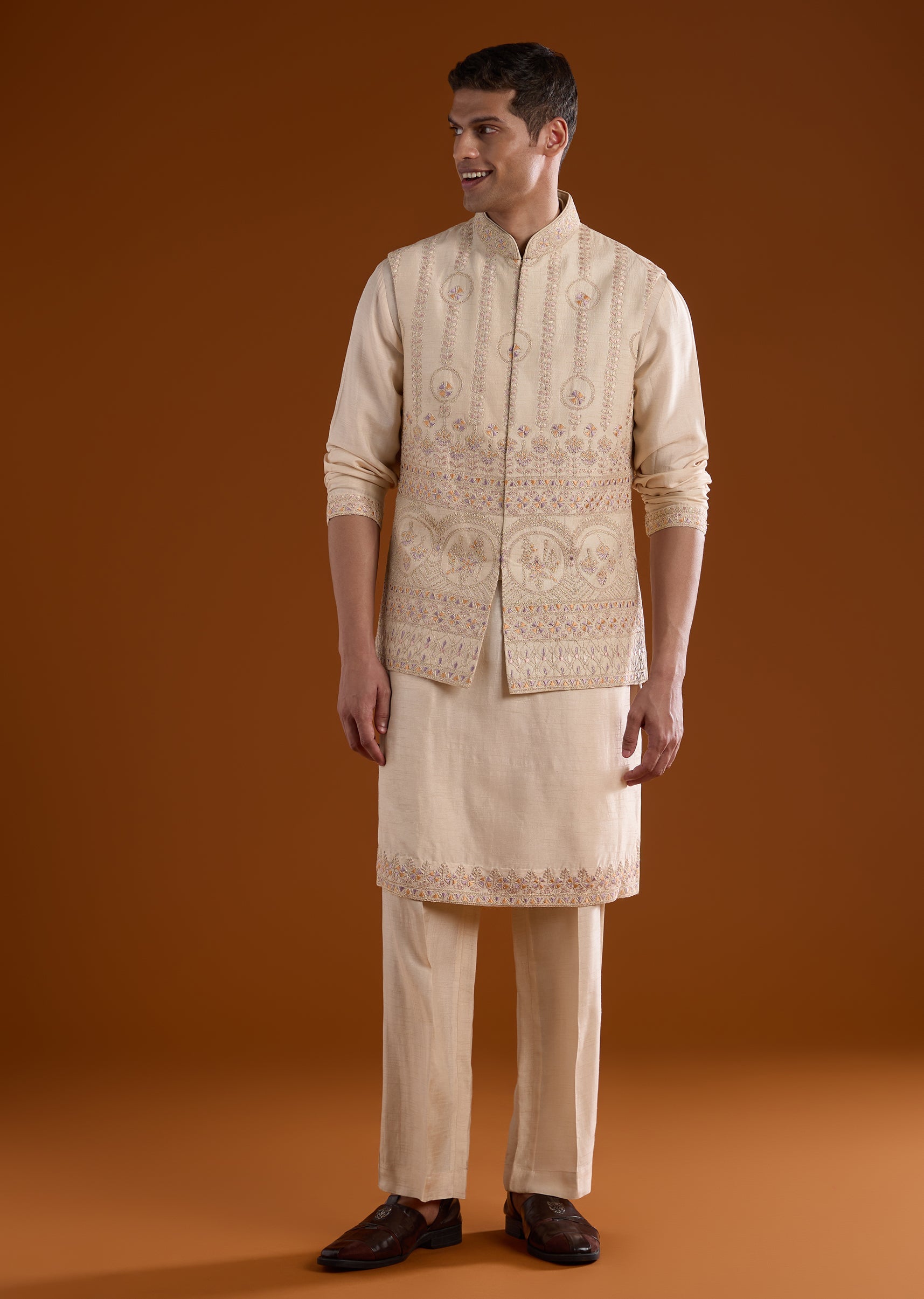 Perfect for haldi, mehendi, and engagement functions, this peach kurta jacket set exudes warm festive charm. Enhanced with dori and thread detail work, it brings subtle texture and elegance. The full sleeves and mandarin collar make it a polished choice for groomsmen during daytime celebrations. Awarded as the Most Trusted Brand, we're delivering styles you love, just as promised.