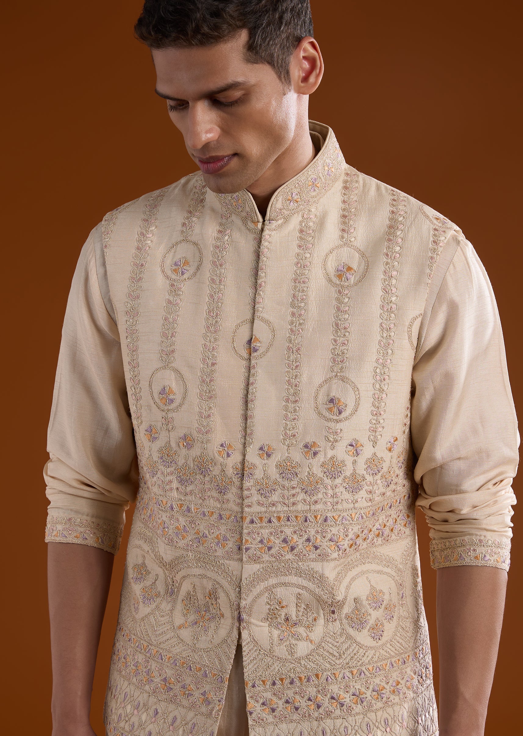 Peach Kurta Jacket Set With Dori And Thread Detail Work