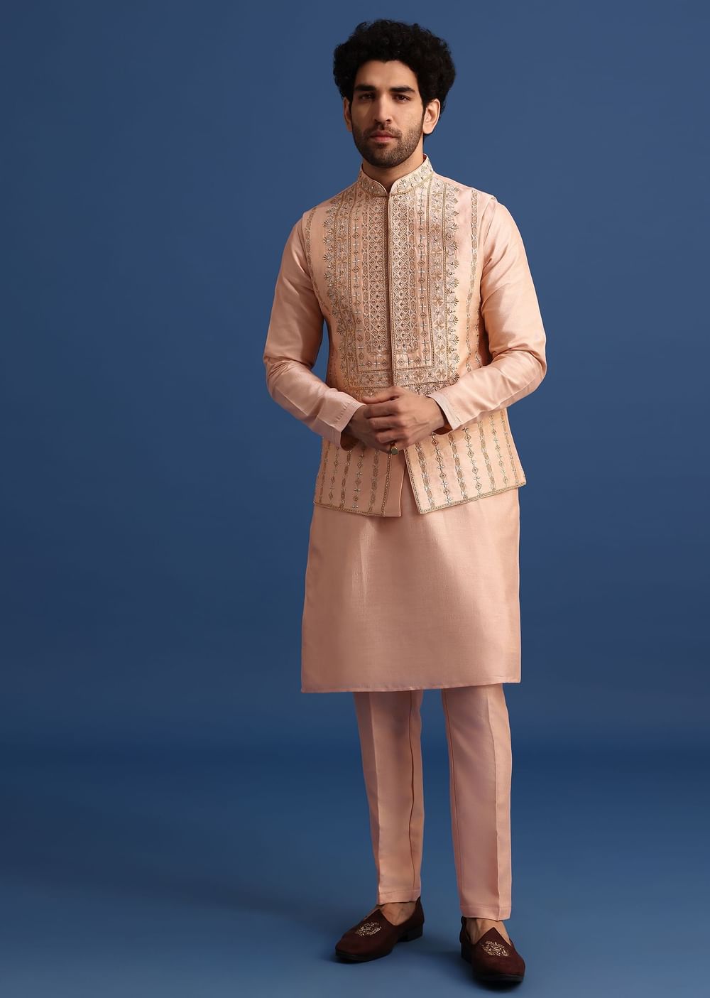 Peach Kurta Jacket Set With Zari Work And Mirror Embroidery For Men